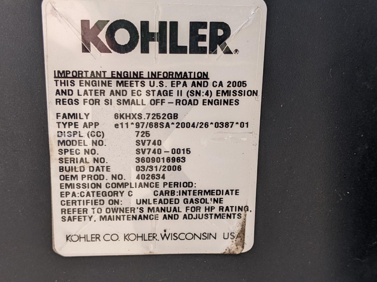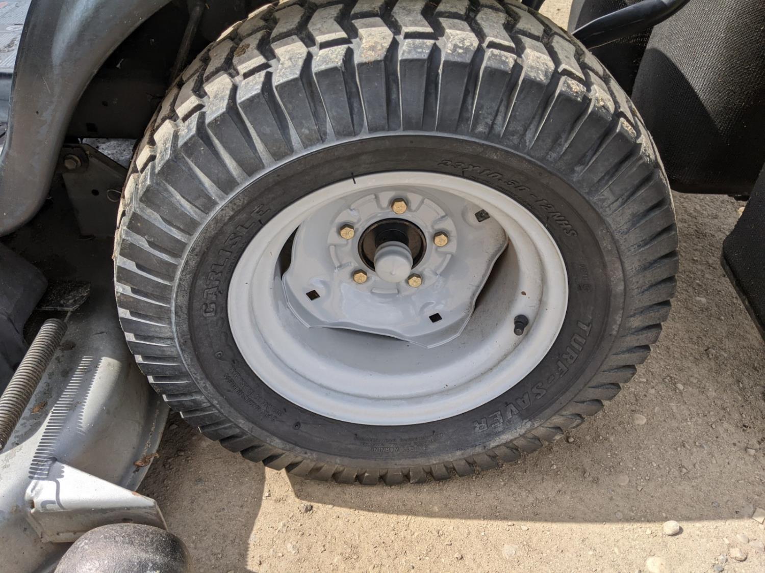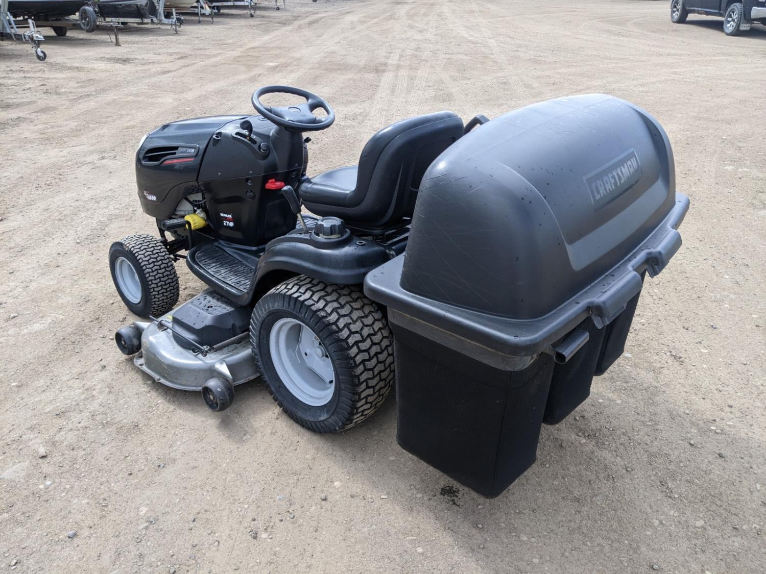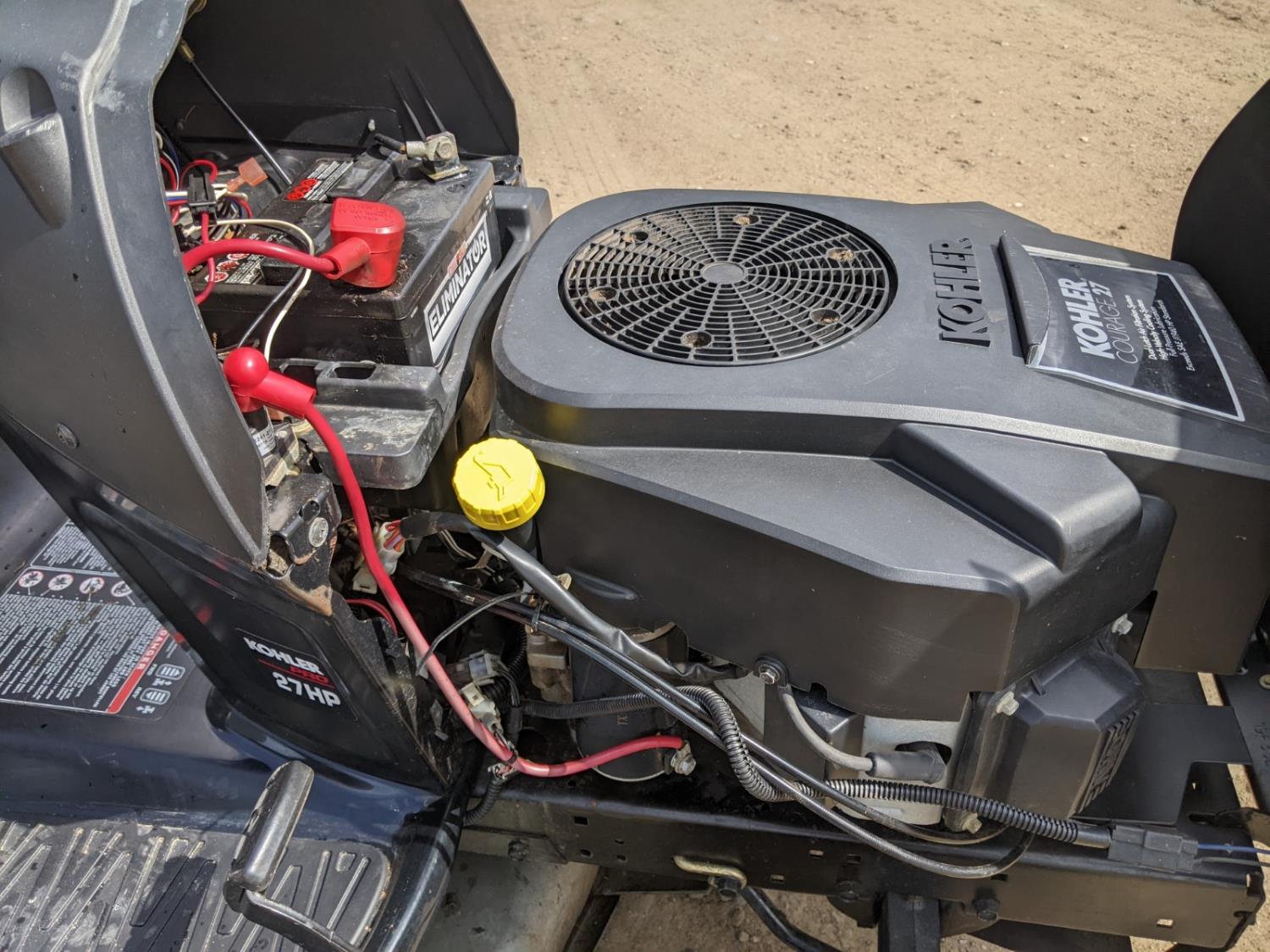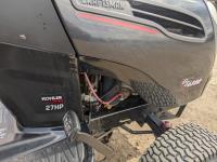54 inch deck and 3 compartment bagger system, hydrostatic transmission, Kohler Courage 27 HP engine, 725 cc, front tires 16x6.50-8, rear tires 23x10.5-12