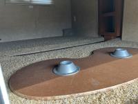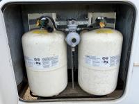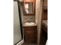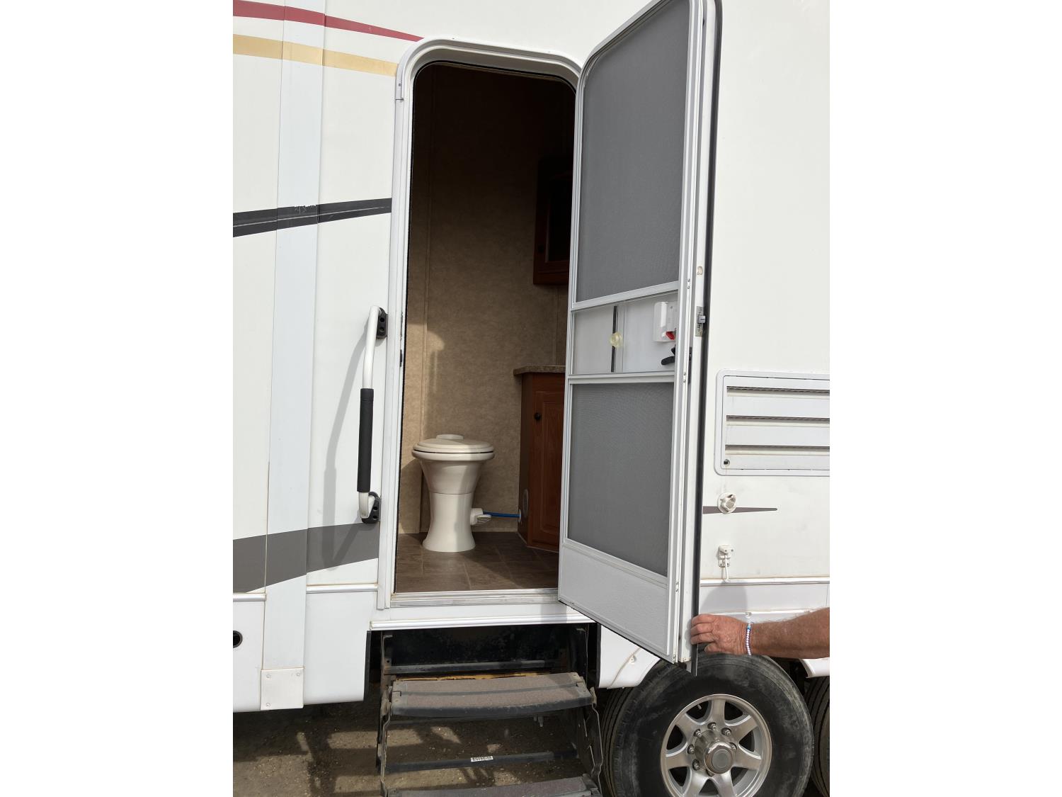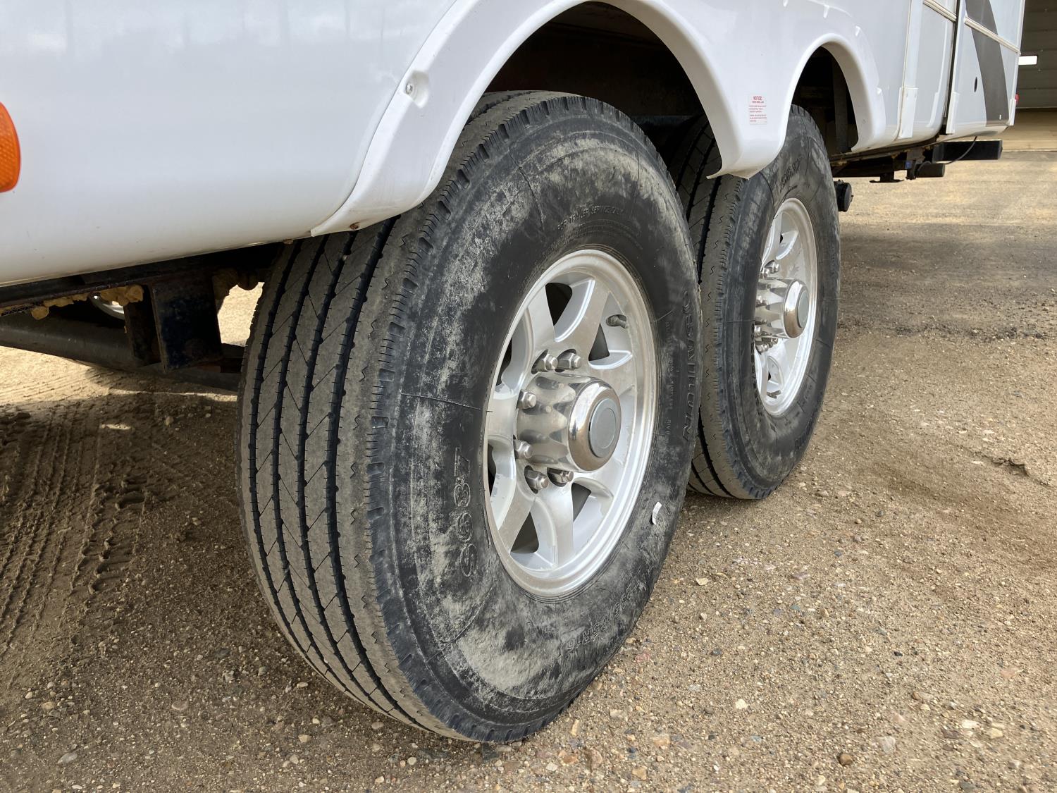 microwave, full bath, master bedroom, A/C, outdoor shower, 4 slides, power levelling jacks, outside entry washroom off of rear bedroom, full bathroom with shower, leather rockers, table with 4 chairs, flat screen TV, entertainment center, rear receiver, brand new power awning, tow hitch, LT235/85R16 tires