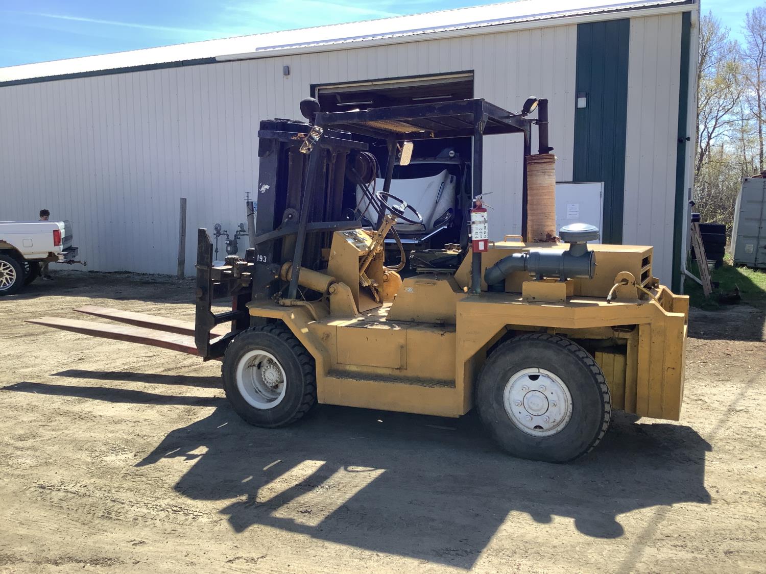 Detroit 353 diesel engine, shuttle shift transmission, fork extensions, hydraulic side shift, rear counter weight, 7.50-15 front duals