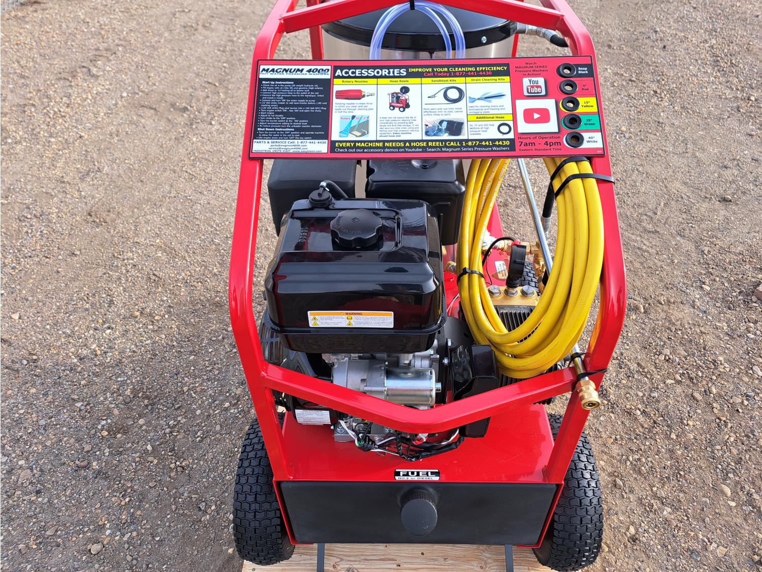 4000 PSI, 3.5 GPM, 15 HP electric start gas engine, 30 ft hose, wand