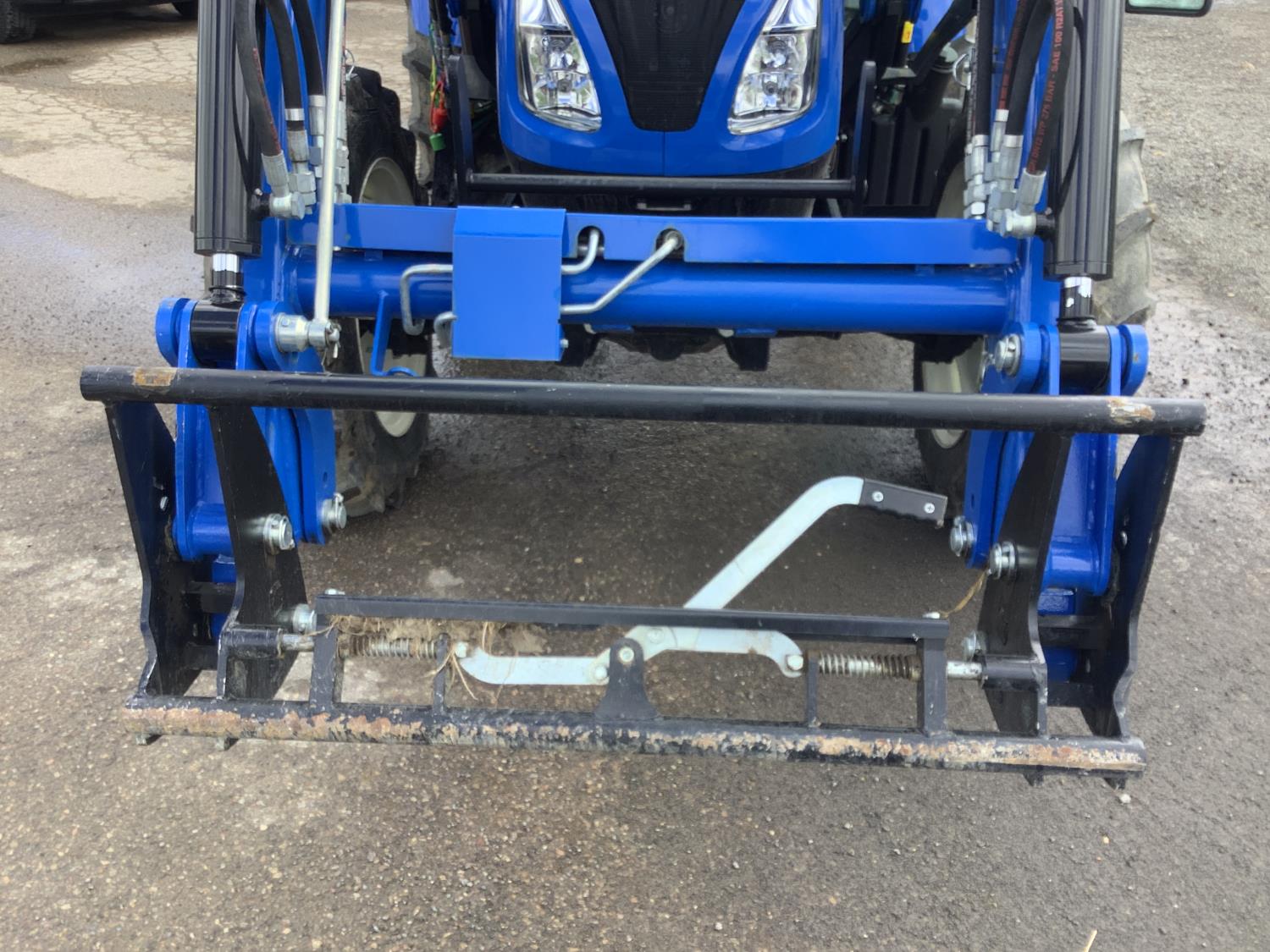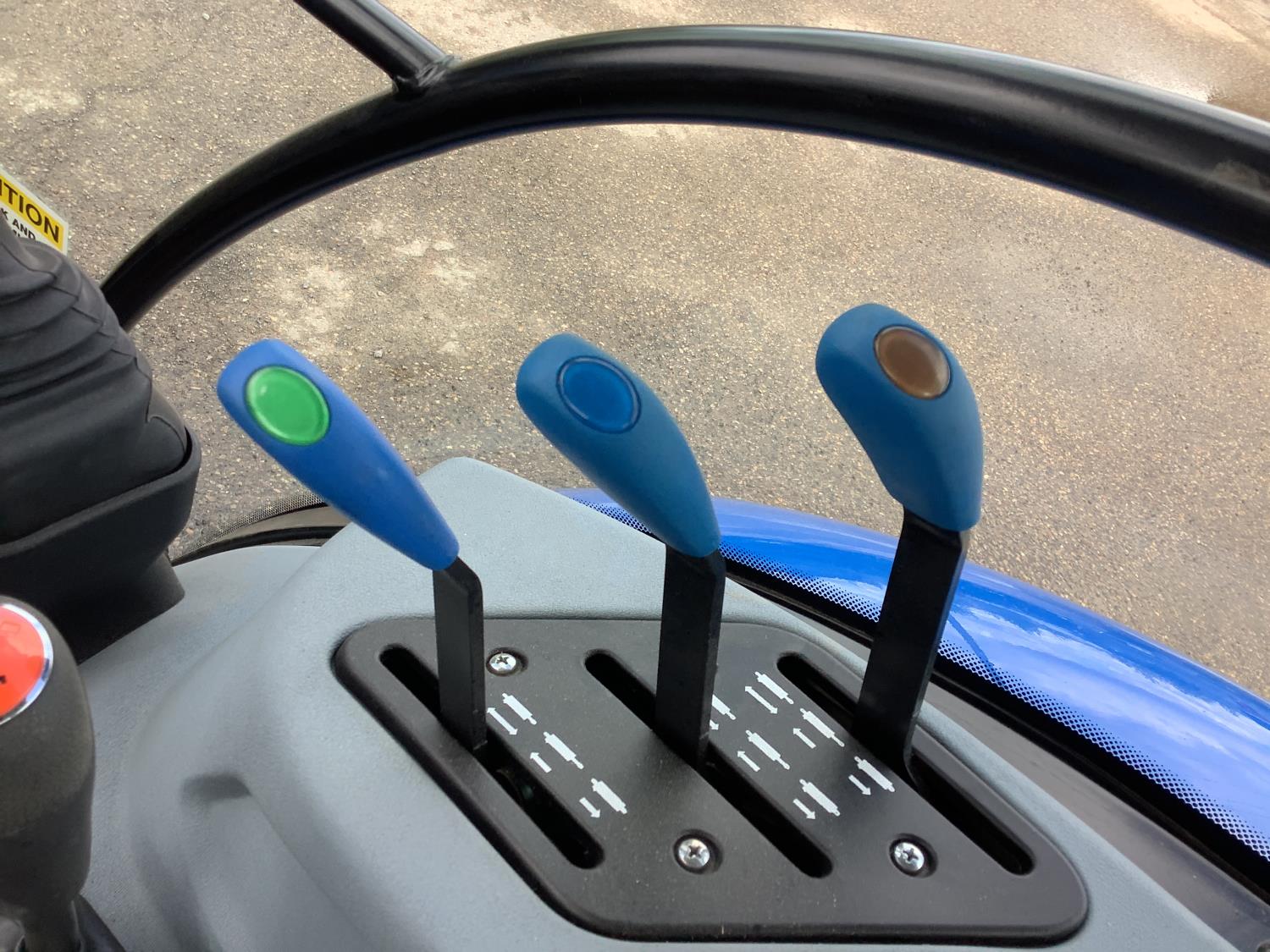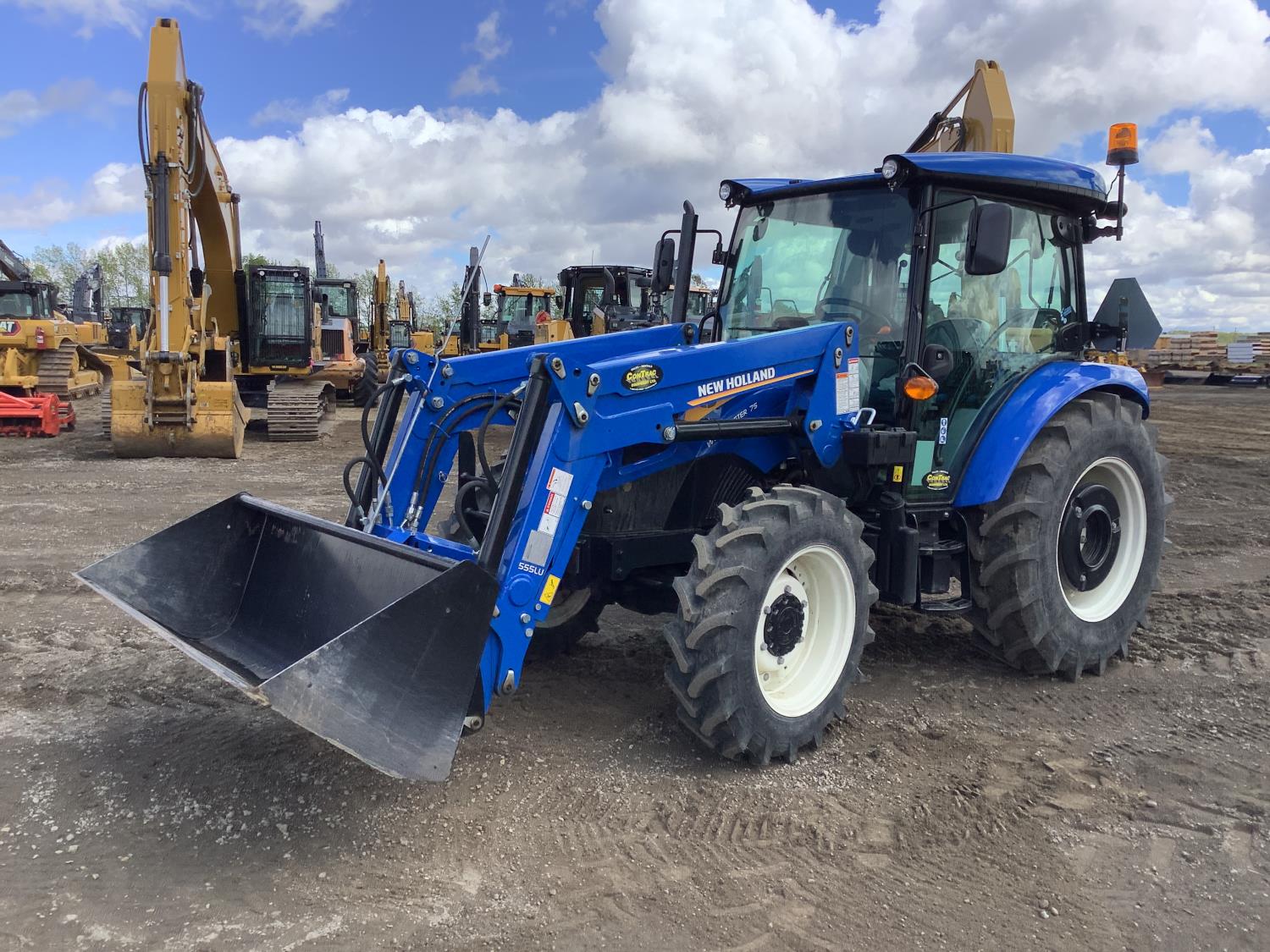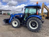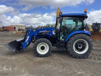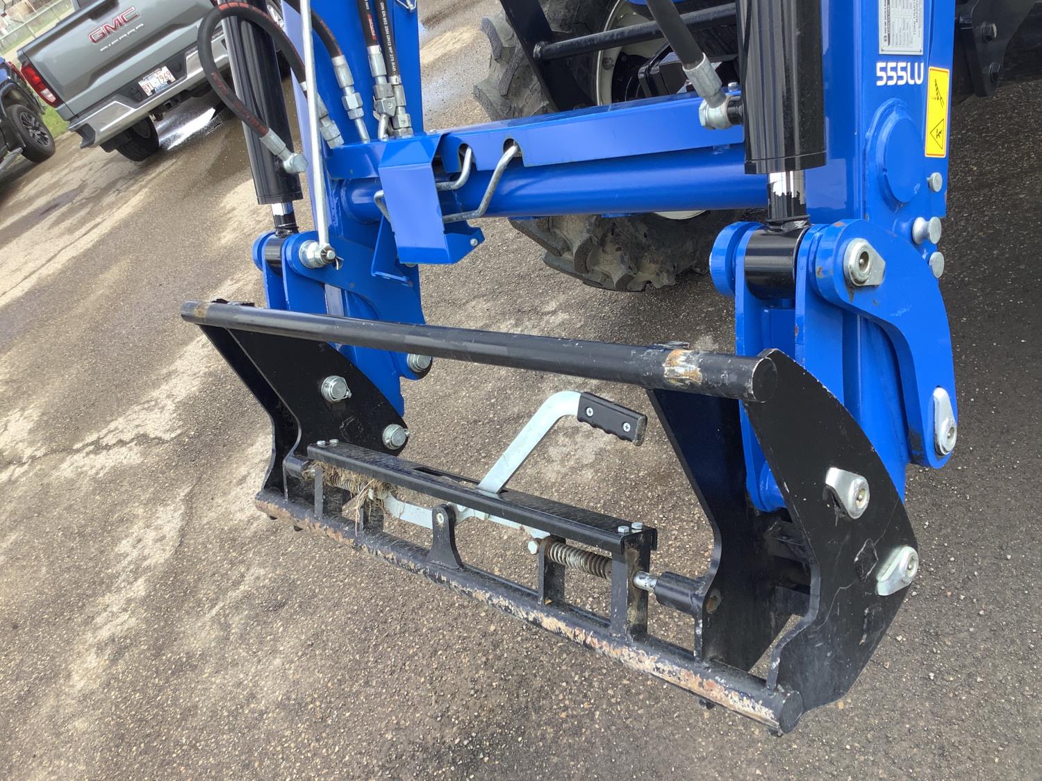 New Holland 555LU loader, Q/A, bucket, mid mount hydraulic connection, FPT 2.9 L 3 cylinder 74 HP, diesel engine, 60 PTO HP, cab, joystick, A/C, radio, buddy seat, 12 speed transmission with left hand power shuttle, sun roof, front grill guard, rear wheel weights, 280/85R24 front tires, 420/85R24 rear tires