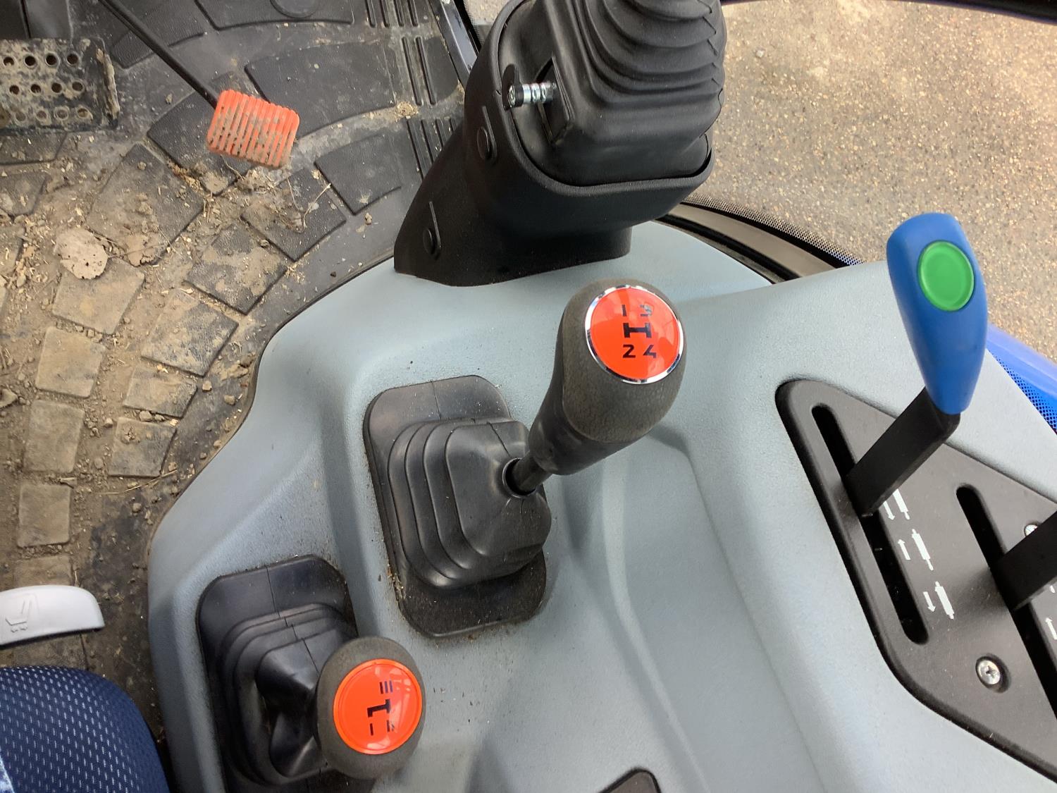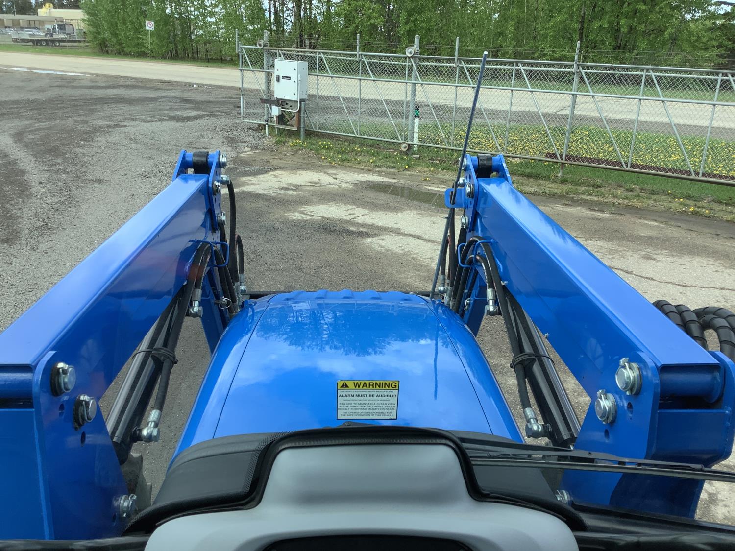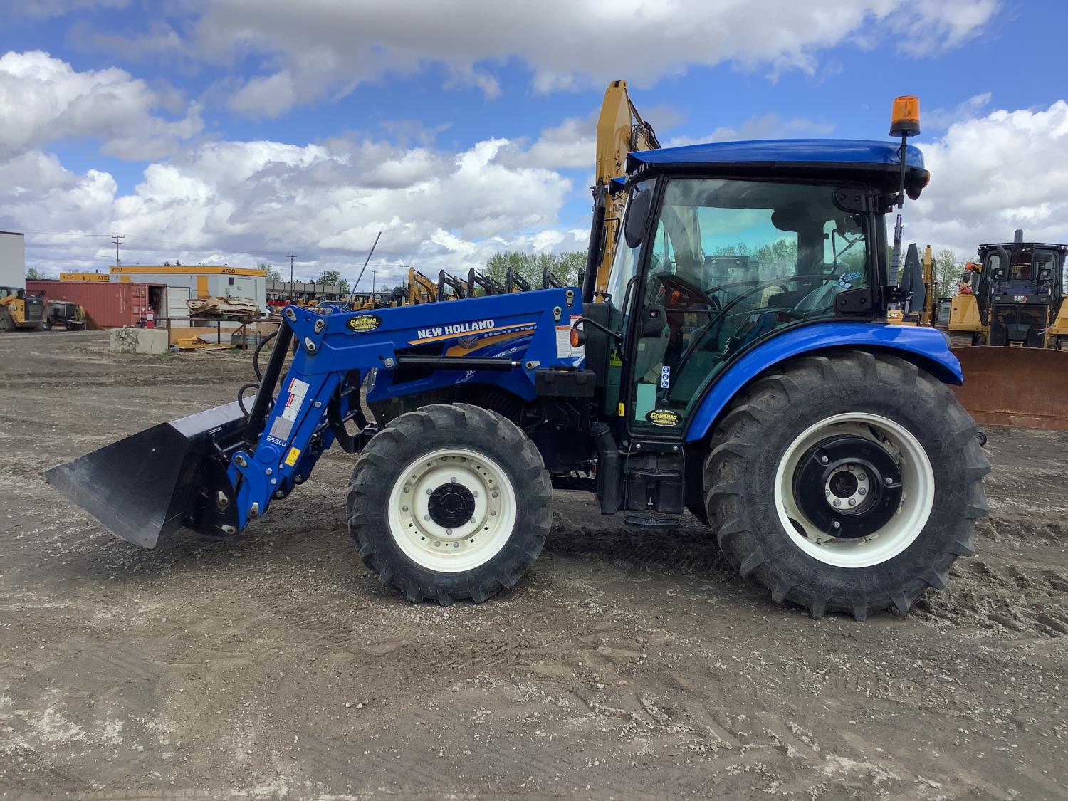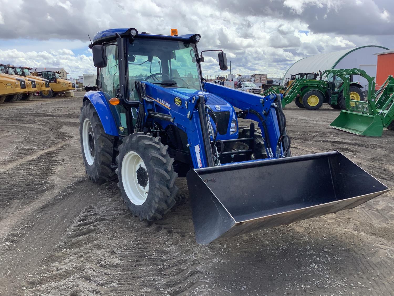 New Holland 555LU loader, Q/A, bucket, mid mount hydraulic connection, FPT 2.9 L 3 cylinder 74 HP, diesel engine, 60 PTO HP, cab, joystick, A/C, radio, buddy seat, 12 speed transmission with left hand power shuttle, sun roof, front grill guard, rear wheel weights, 280/85R24 front tires, 420/85R24 rear tires