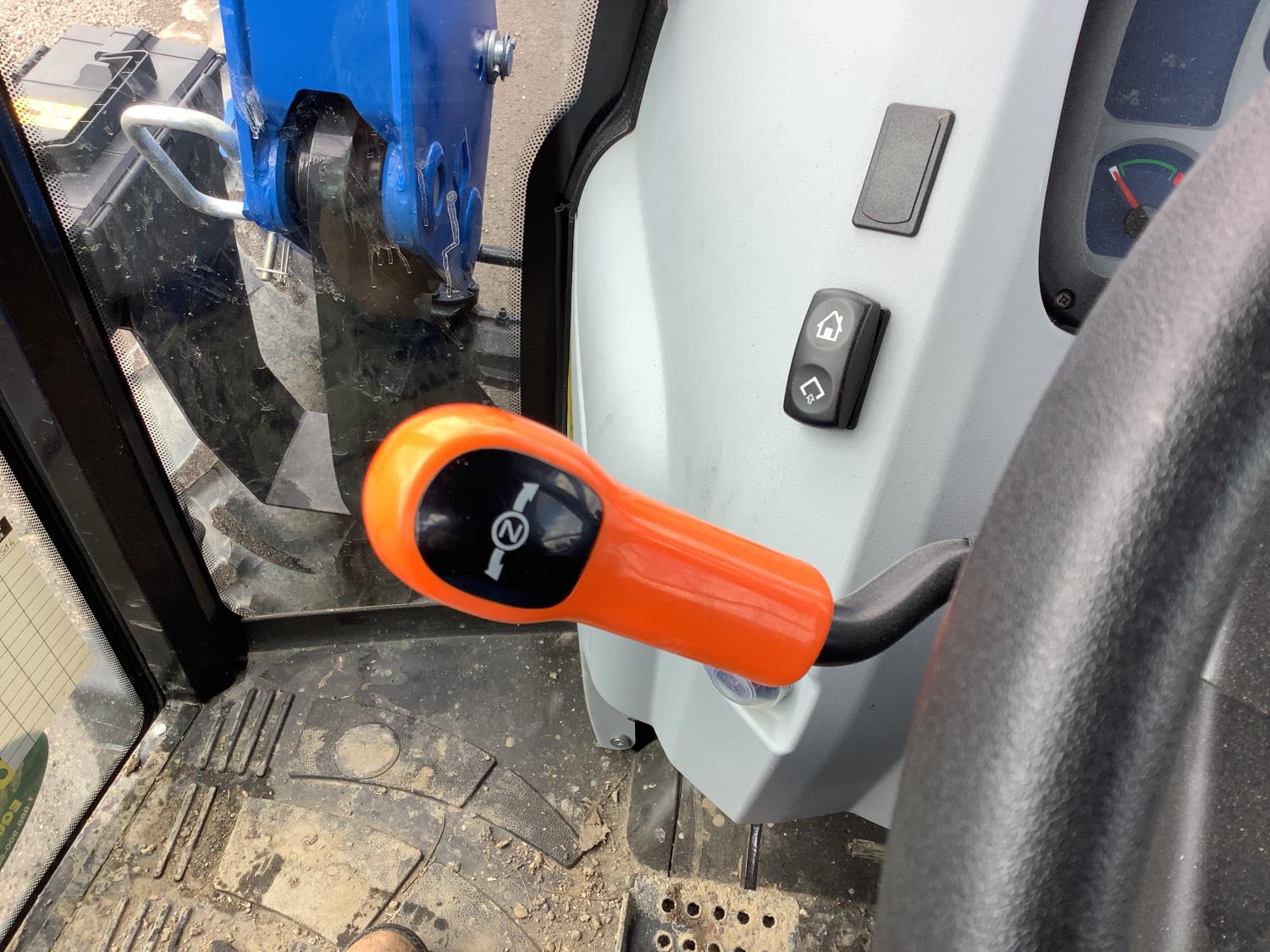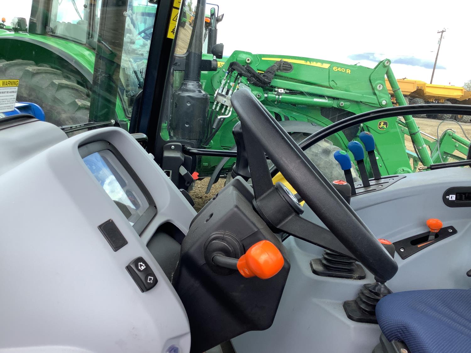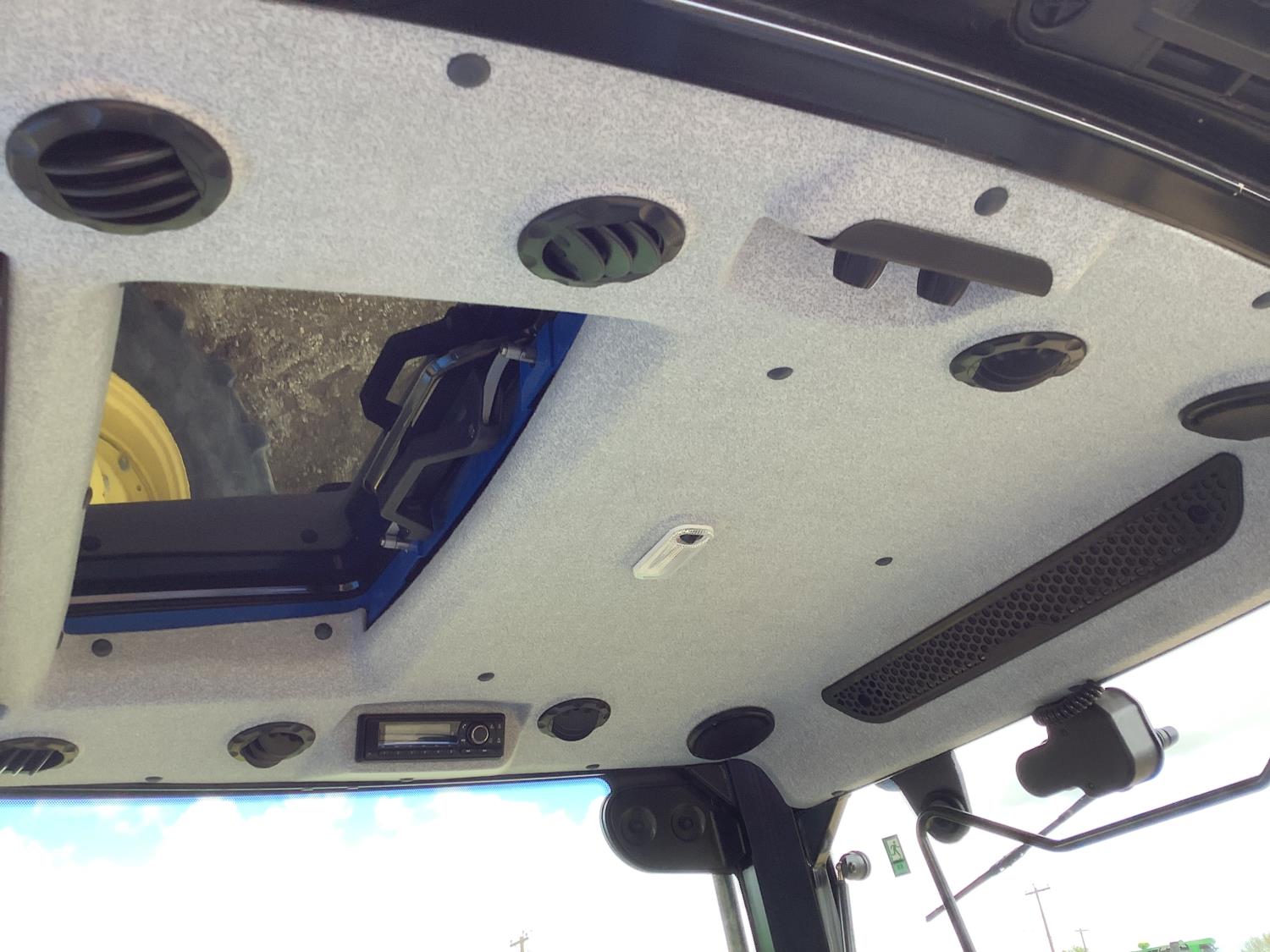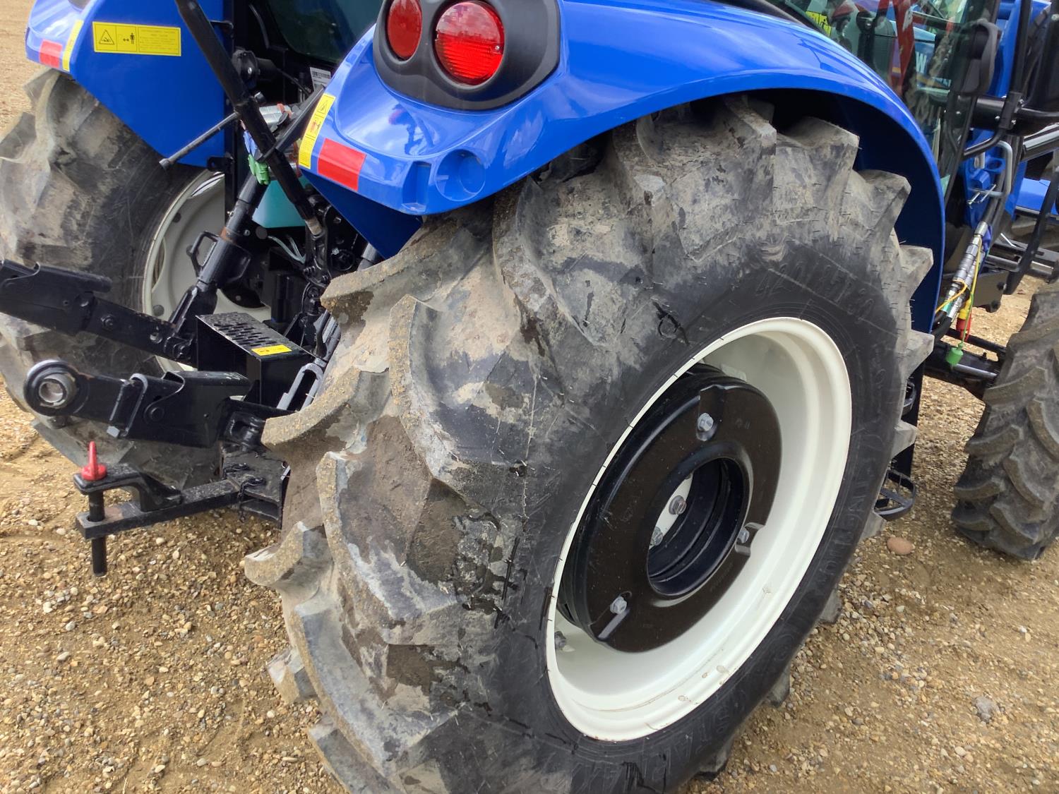 New Holland 555LU loader, Q/A, bucket, mid mount hydraulic connection, FPT 2.9 L 3 cylinder 74 HP, diesel engine, 60 PTO HP, cab, joystick, A/C, radio, buddy seat, 12 speed transmission with left hand power shuttle, sun roof, front grill guard, rear wheel weights, 280/85R24 front tires, 420/85R24 rear tires