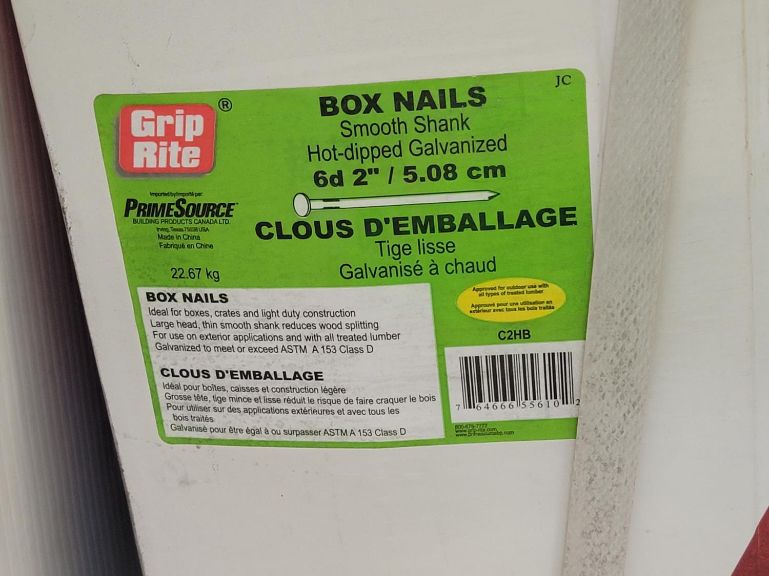 5687 (2) Cases of Grip Rite 2 Inch Smooth Shank Galvanized Box Nails (Unused)