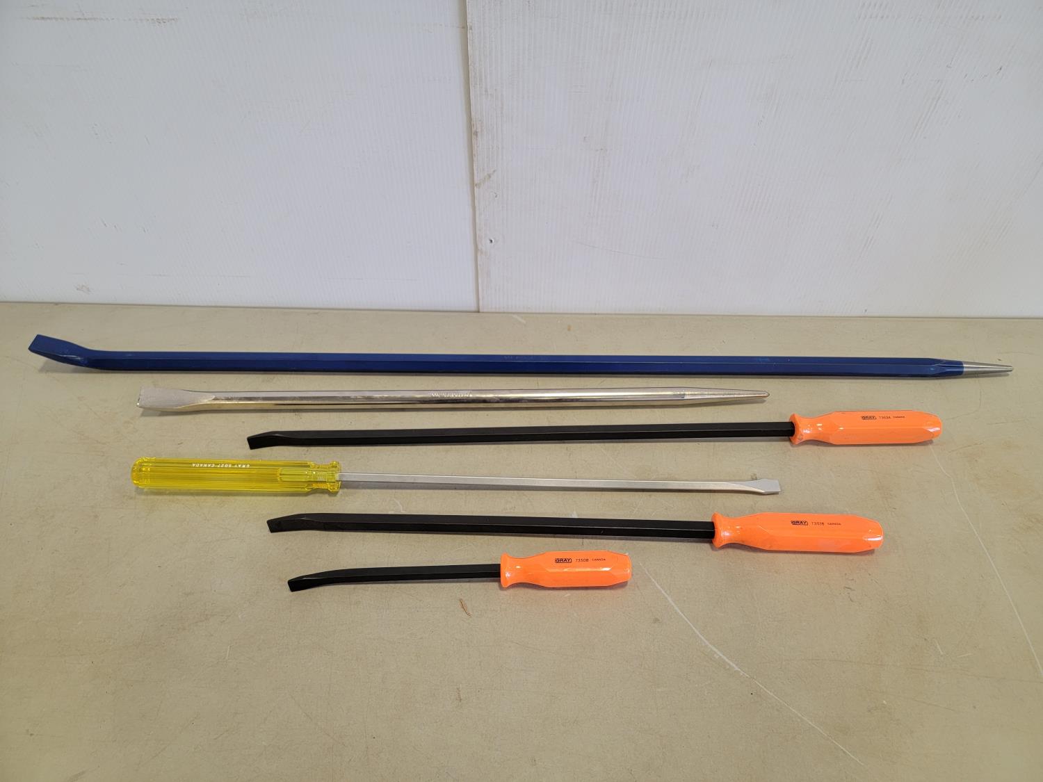 48 inch pinch bar, 29-1/2 inch pinch bar, (3) pry bars: 31 inch, 24 inch, 13 inch, 27 inch screwdriver