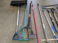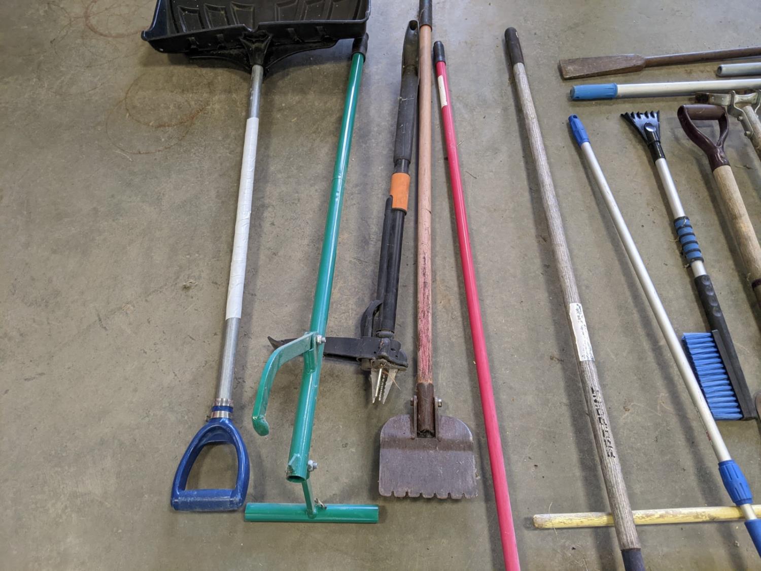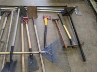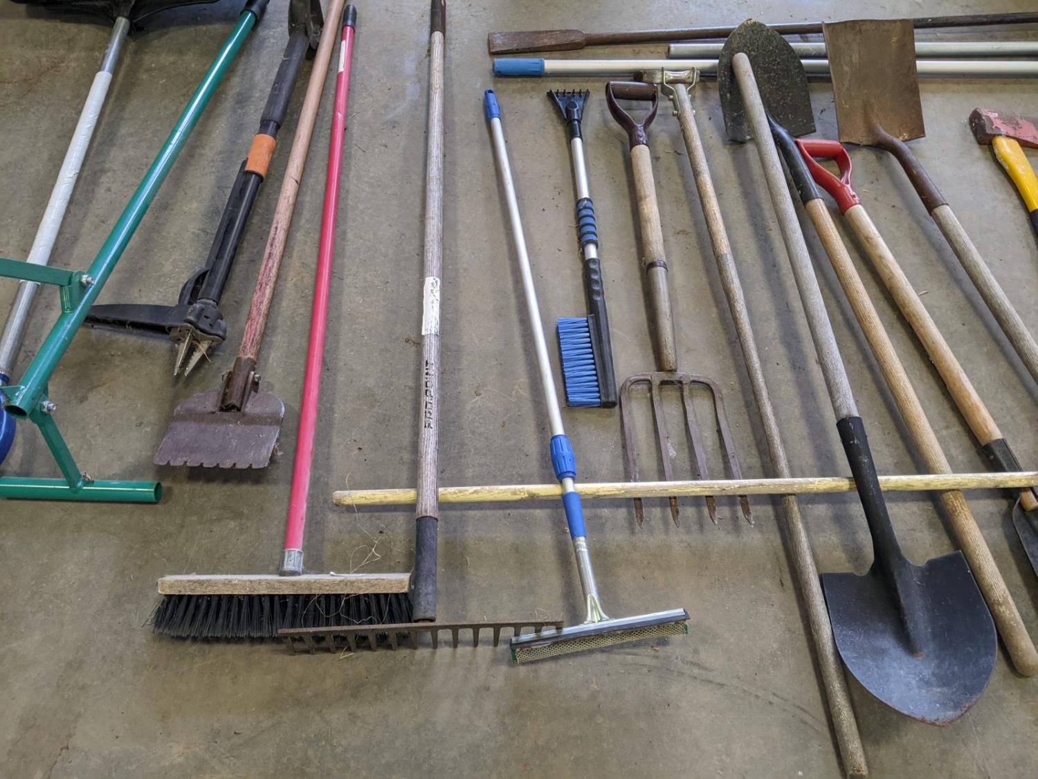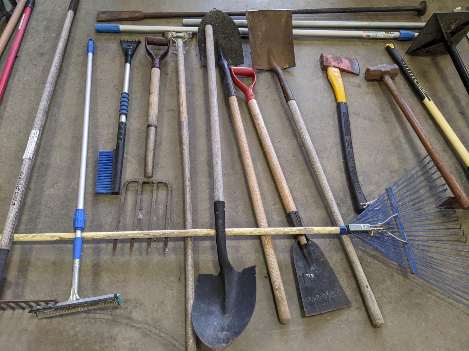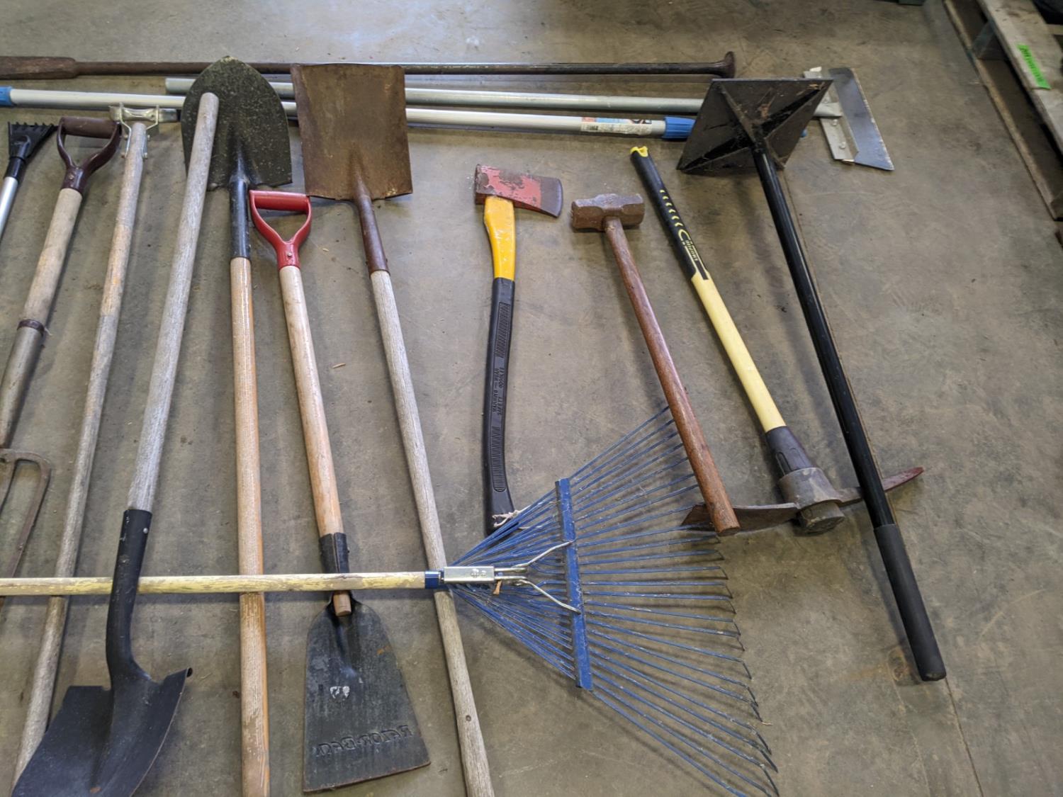 shovels, rakes, hoe, pitchfork, axe, sledge hammer, pickaxe, tamper, broom, scraper, log roller, weed picker