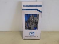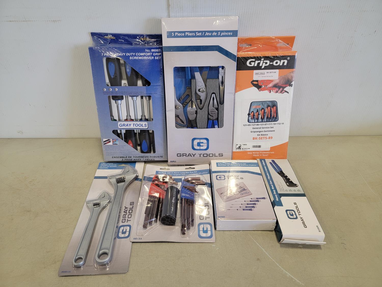 7 piece screwdriver set, 5 piece pliers set, 5 piece general service vise grip set, 2 piece 12 inch & 8 inch crescent wrench set, 22 piece SAE & metric long hex key set, 8 piece precision screwdriver set, heavy duty rivet gun