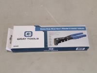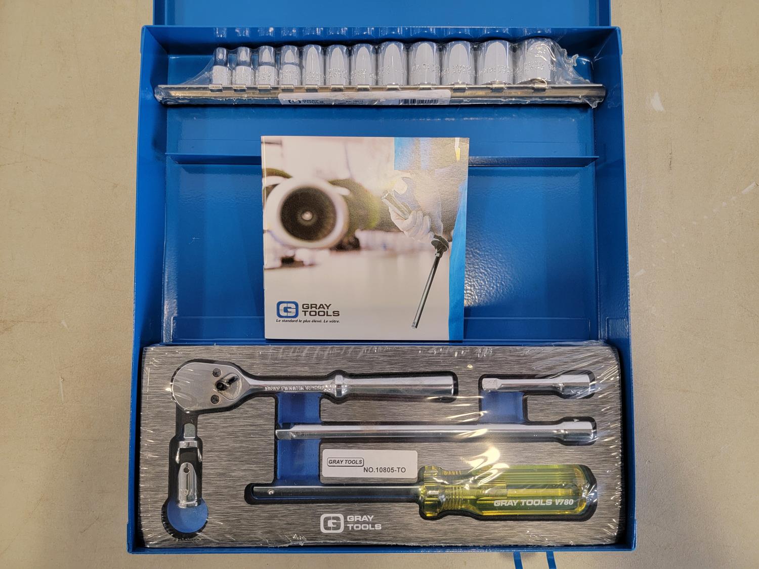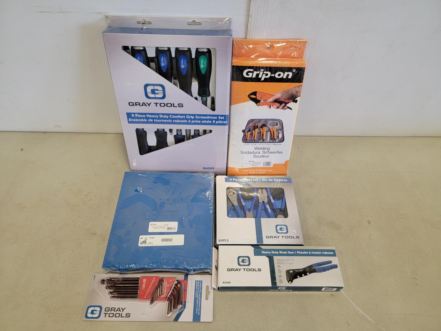 9 piece screwdriver set, 4 piece pliers set, 5 piece welding vise grip set, 17 piece 1/4 inch drive metric socket and ratchet set, 13 piece SAE long ball end hex key set, heavy duty rivet gun