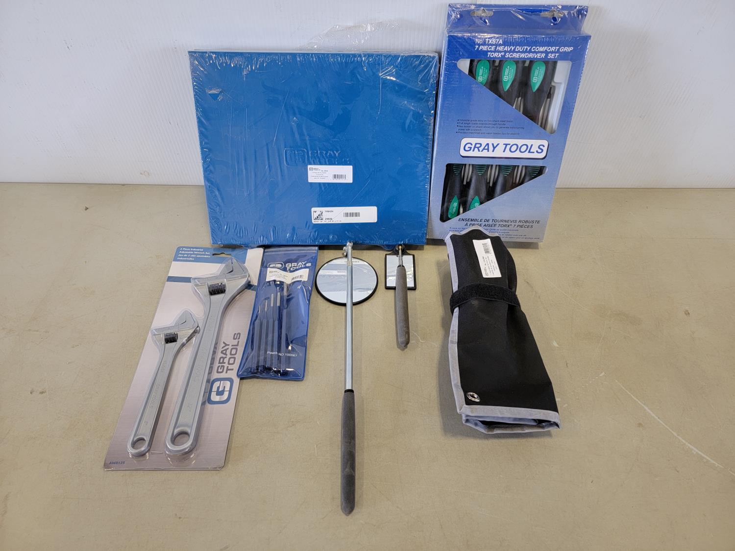 26 piece 3/8 inch drive socket and ratchet set, 7 piece screwdriver set, 2 piece 8 inch & 12 inch crescent wrench set, 5 piece pin punch set, (2) telescoping mirrors, 7 piece metric nut driver set