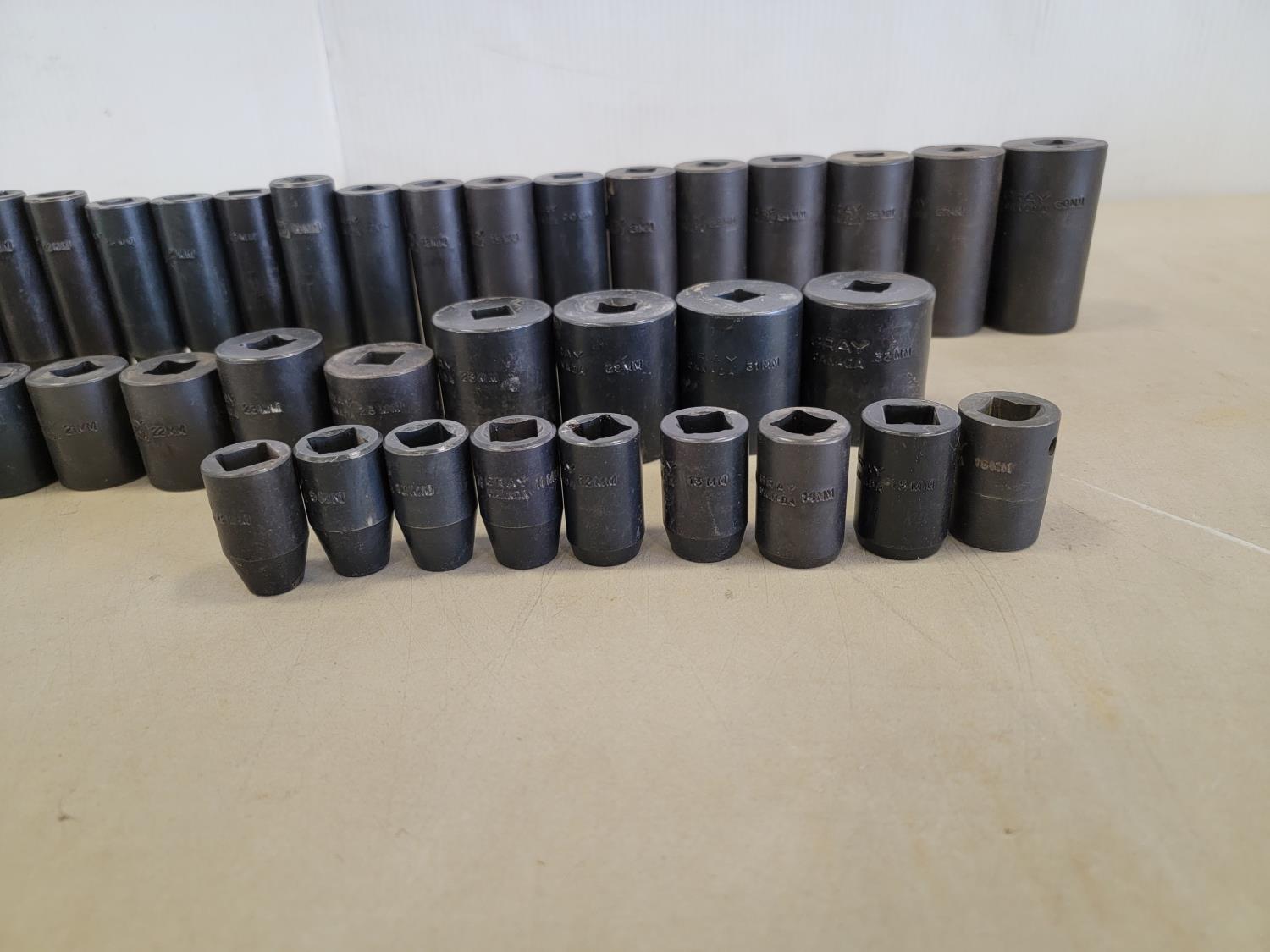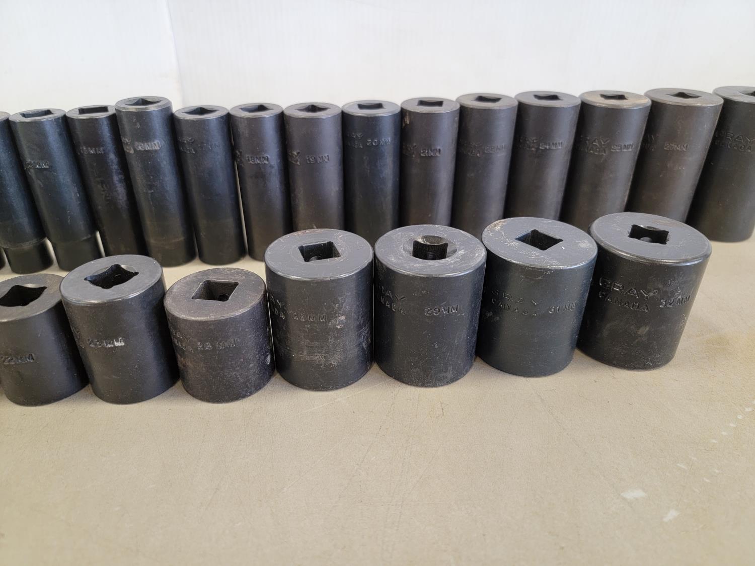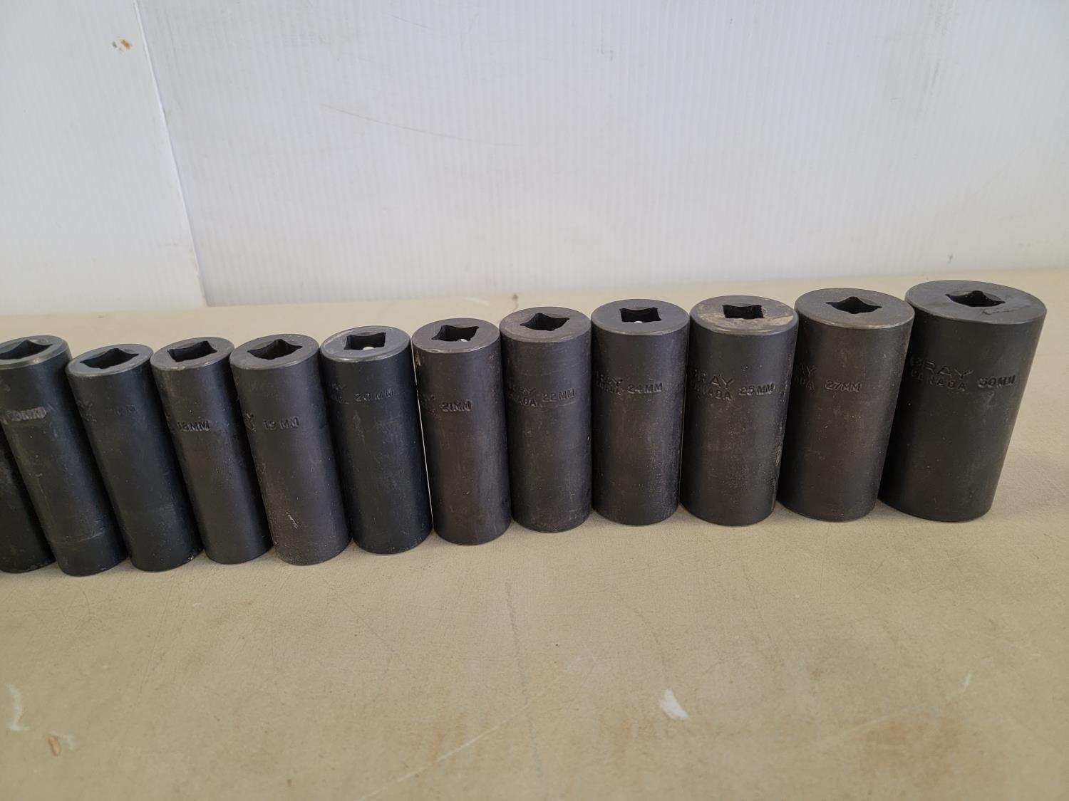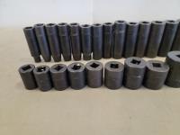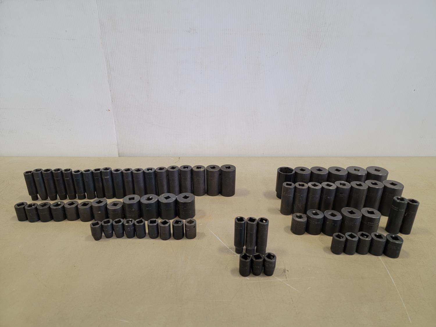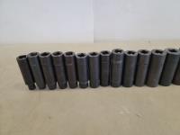 1/2 inch drive metric sockets: 32 mm - 8 mm, 1/2 inch drive SAE sockets: 1-1/2 inch, 1-7/16 inch, 1-3/8 inch, 1-5/16 inch, 1-1/4 inch, 1-3/16 inch, 1-1/8 inch, 1-1/16 inch, 1-15/16 inch, 7/8 inch, 13/16 inch, 3/4 inch, 11/16 inch, 5/8 inch, 9/16 inch, 1/2 inch, 7/16 inch, 3/8 inch