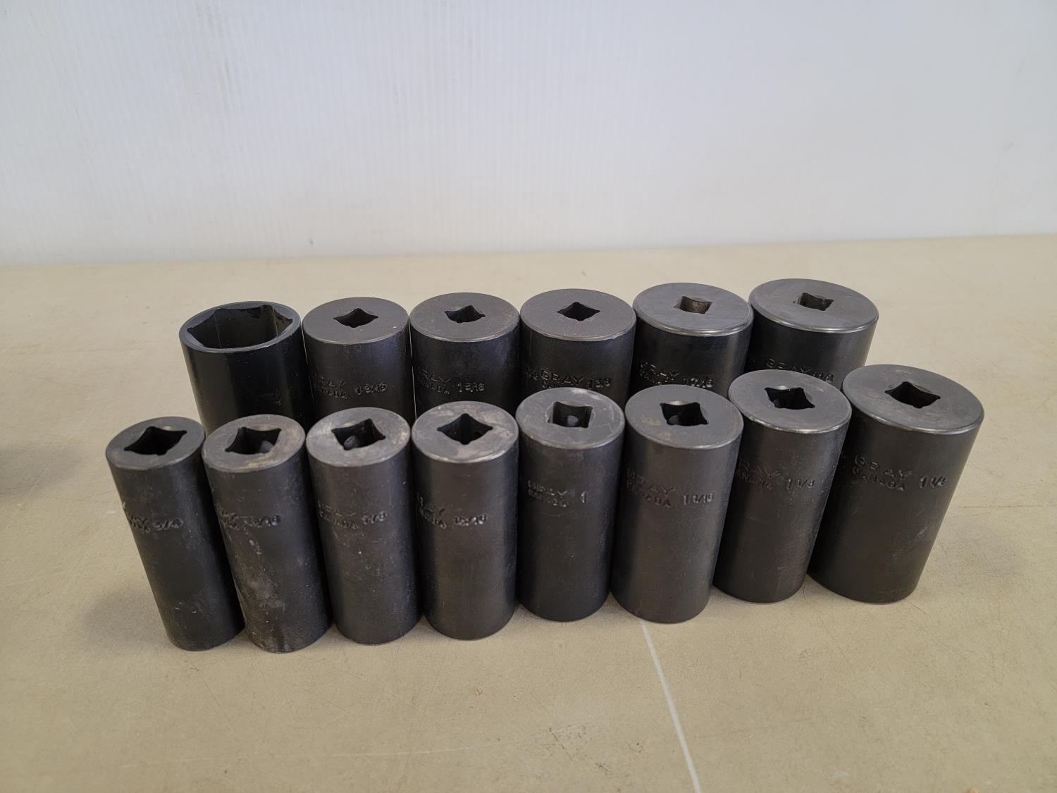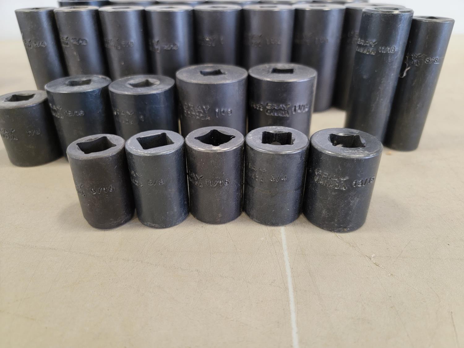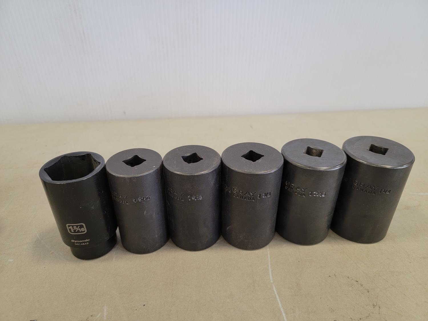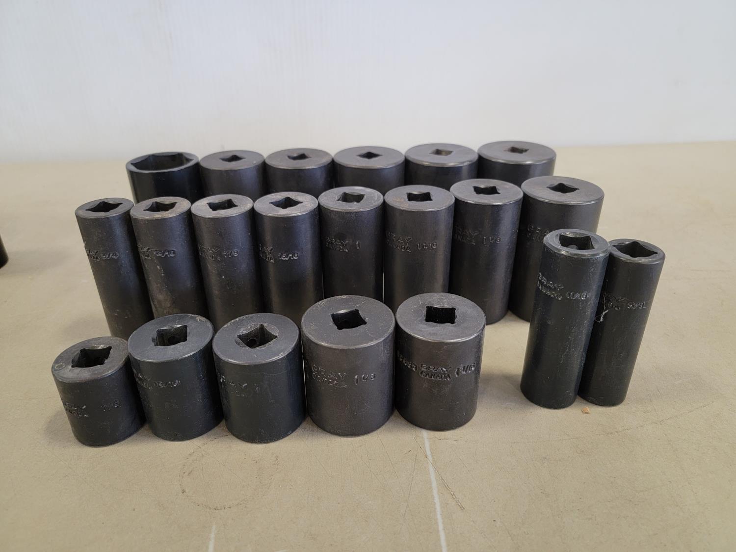 1/2 inch drive metric sockets: 32 mm - 8 mm, 1/2 inch drive SAE sockets: 1-1/2 inch, 1-7/16 inch, 1-3/8 inch, 1-5/16 inch, 1-1/4 inch, 1-3/16 inch, 1-1/8 inch, 1-1/16 inch, 1-15/16 inch, 7/8 inch, 13/16 inch, 3/4 inch, 11/16 inch, 5/8 inch, 9/16 inch, 1/2 inch, 7/16 inch, 3/8 inch
