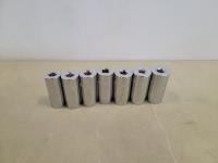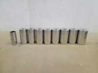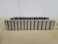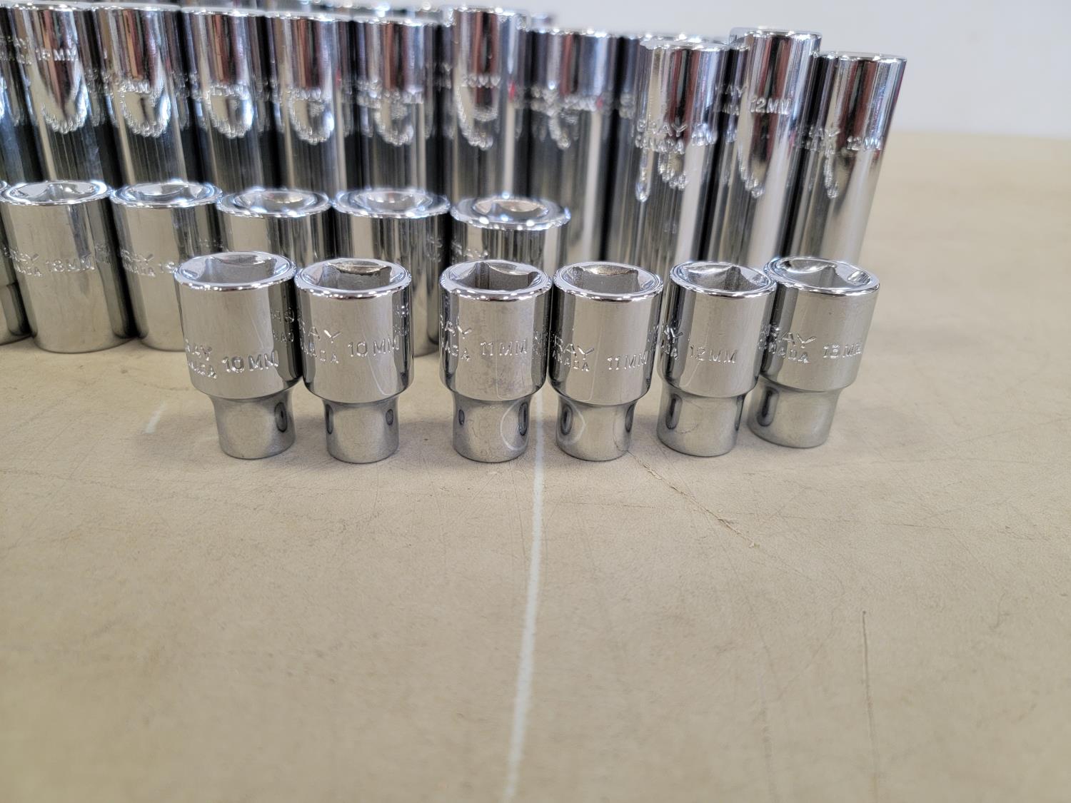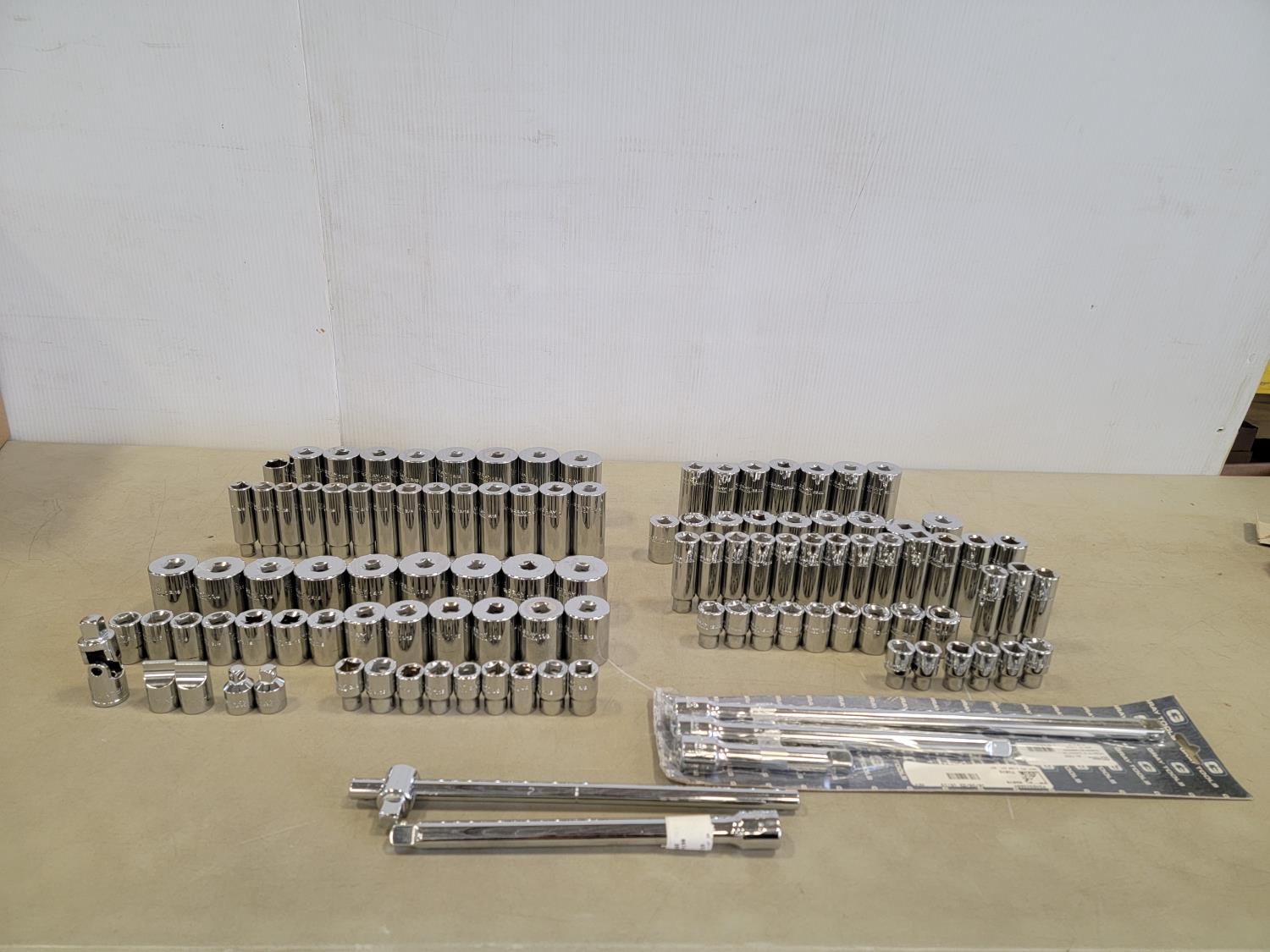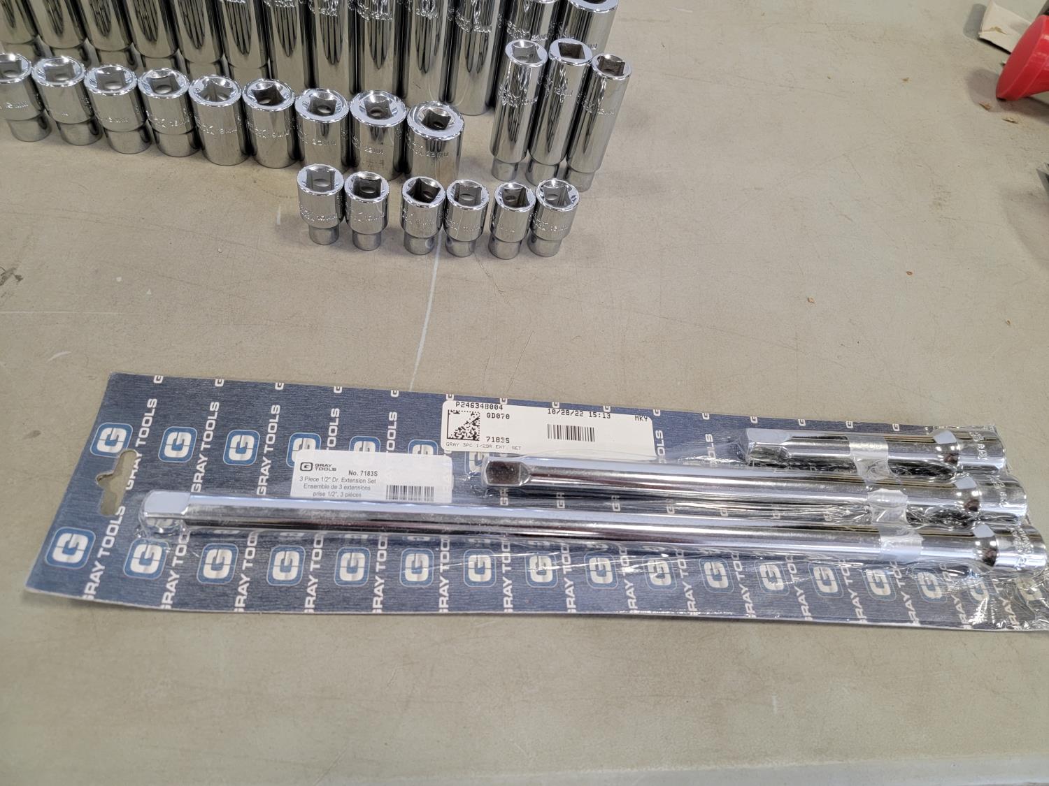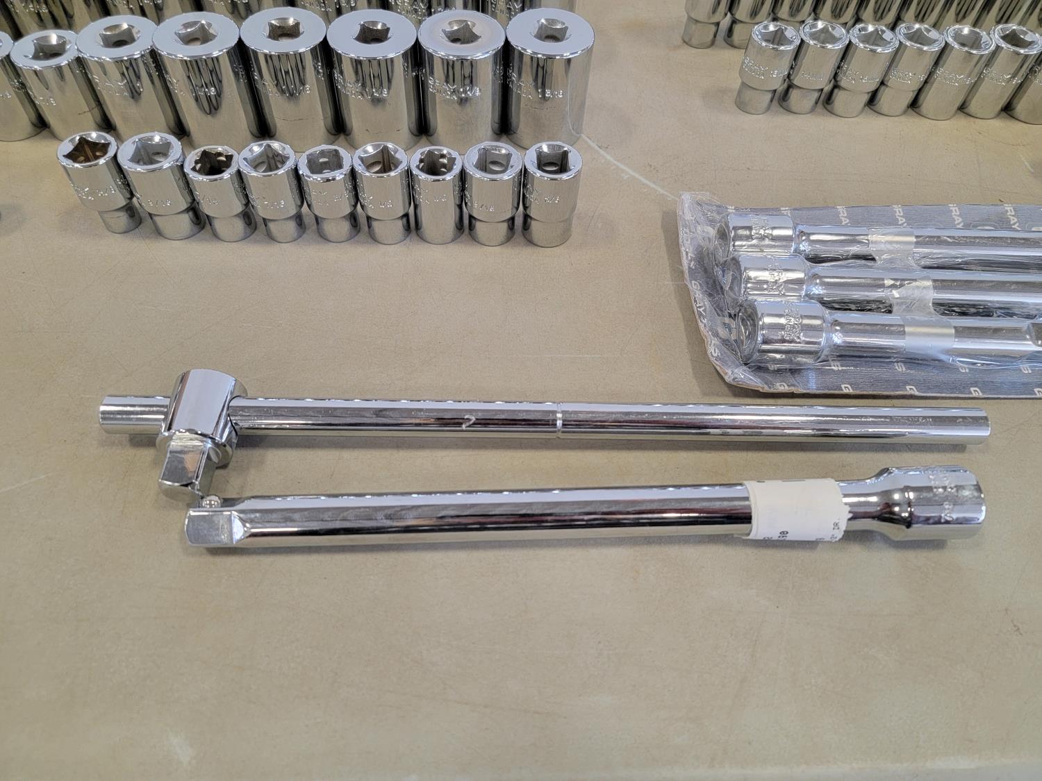 3 piece 1/2 inch drive extension set, 1/2 inch swing bar, universal joint, 10 inch extension, 1/2 inch to 3/8 inch adaptor, attachments, 1/2 inch SAE sockets: 1-1/2 inch - 3/8 inch, 1/2 inch metric sockets" 32 mm - 10 mm