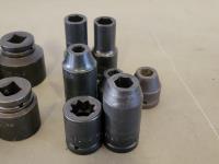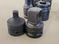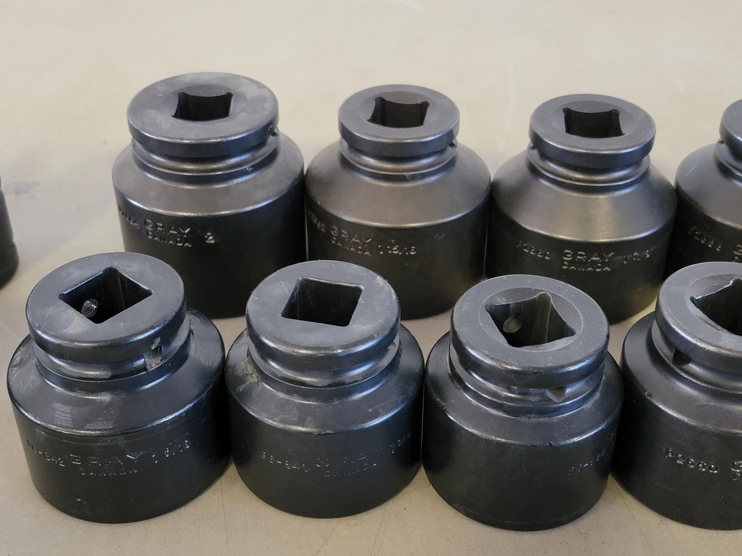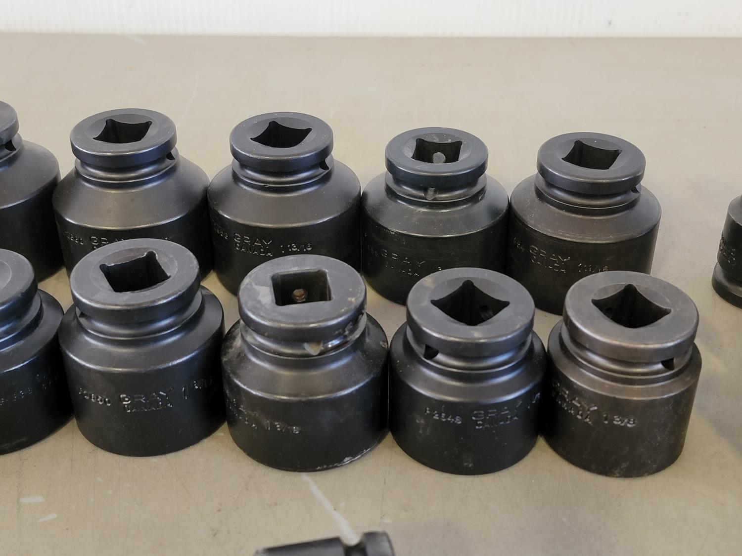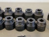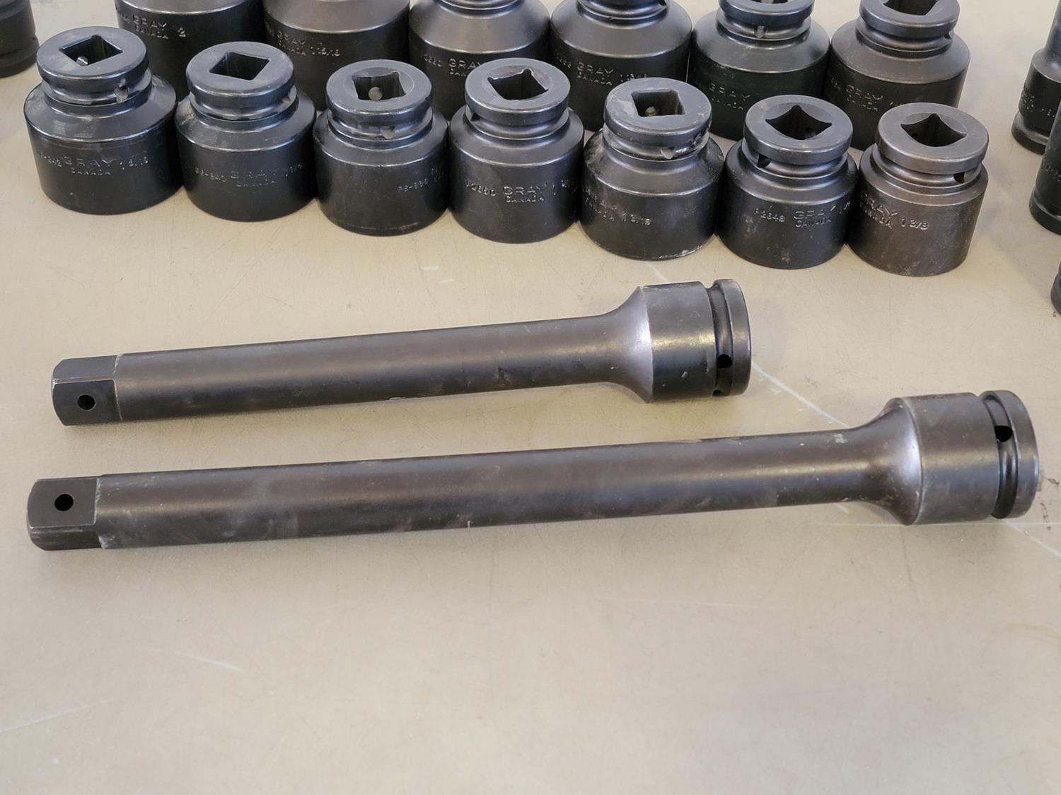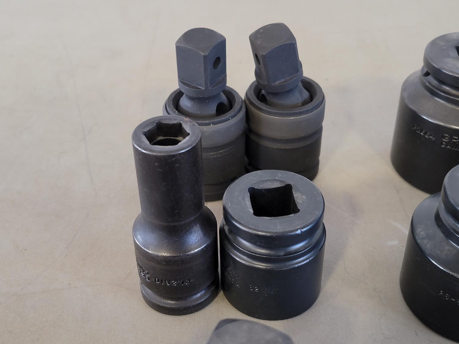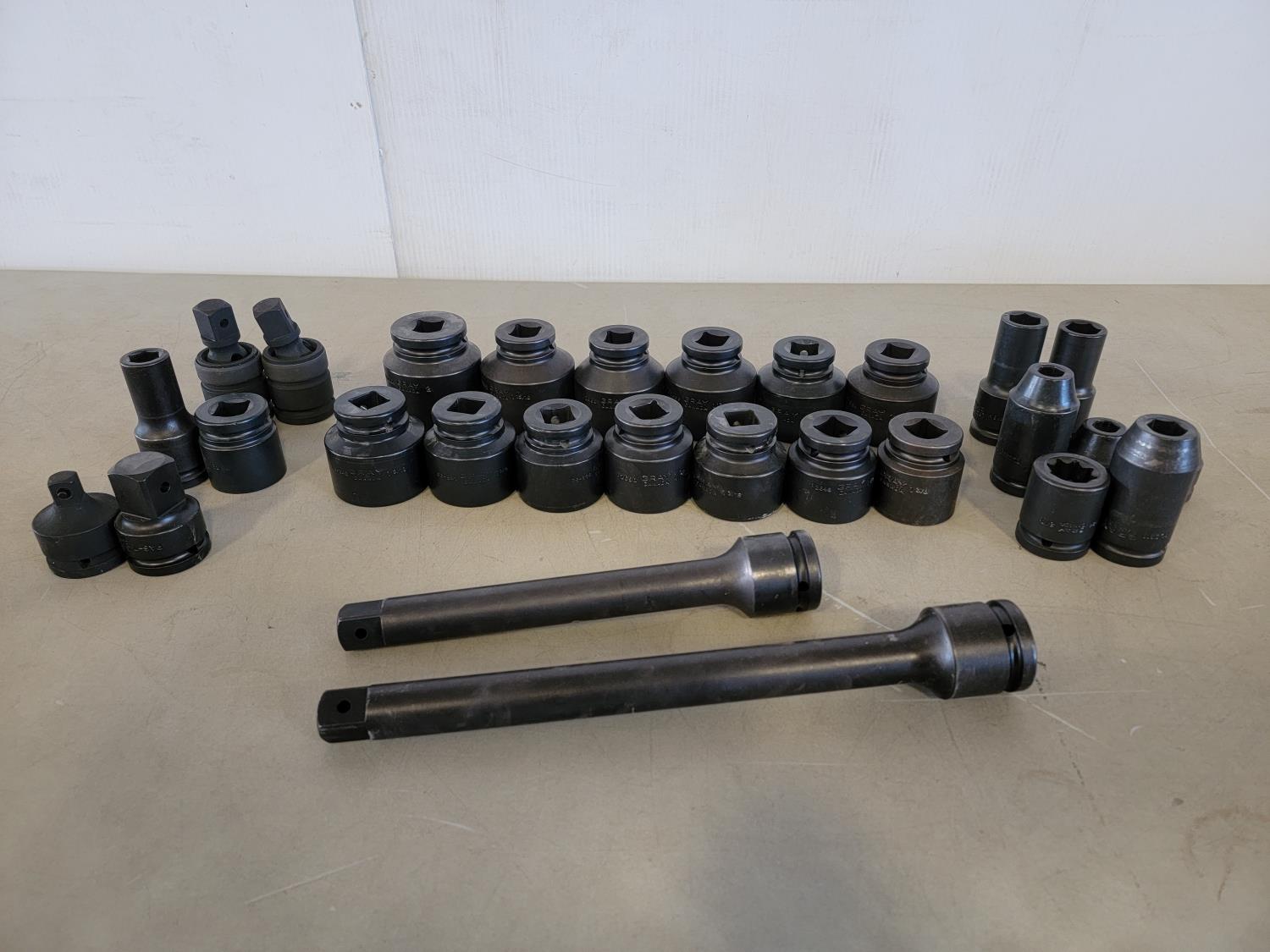 3/4 inch drive SAE impact sockets: 2 inch, 1-15/16 inch, 1-7/8 inch, 1-13/16 inch, 1-3/4 inch, 1-11/16 inch, 1-9/16 inch, 1-1/2 inch, 1-3/8 inch, 1-5/16 inch, 1-1/4 inch, 1-3/16 inch, 1-1/8 inch, 3/4 inch, 11/16 inch, 5/8 inch, 9/16 inch, 3/4 inch U-joints, 10 inch and 13 inch extensions, 3/4 inch to 1 inch adaptor, 3/4 inch to 1/2 inch adaptor, 19 mm and 32 mm 3/4 inch drive sockets