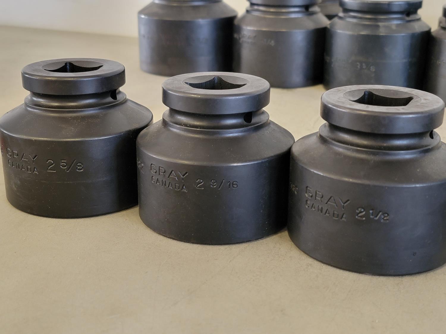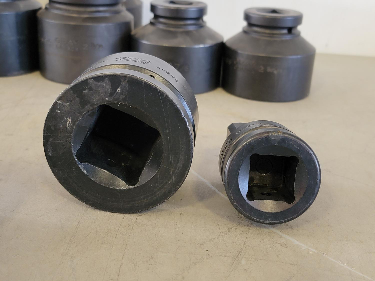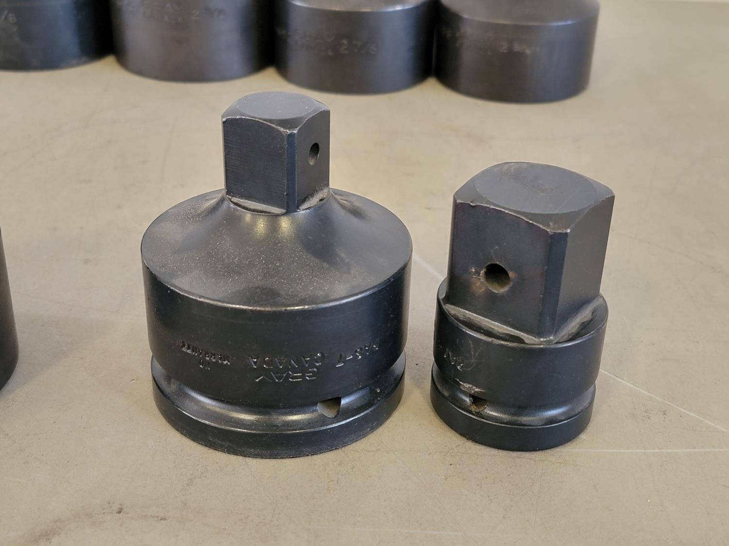 1 inch drive impact sockets: 3-1/2", 3-1/4", 3-1/8", 2-15/16", 2-7/8", 2-3/4", 2-5/8", 2-9/16", 2-1/2", 1-1/2" to 1" adaptor