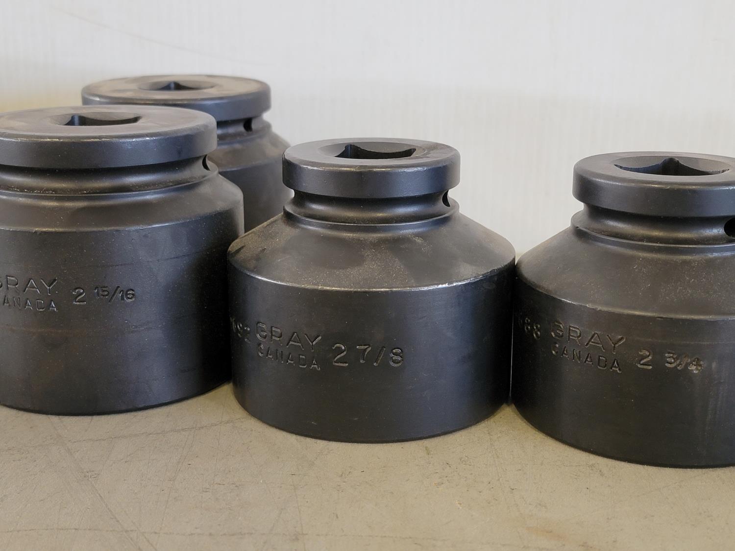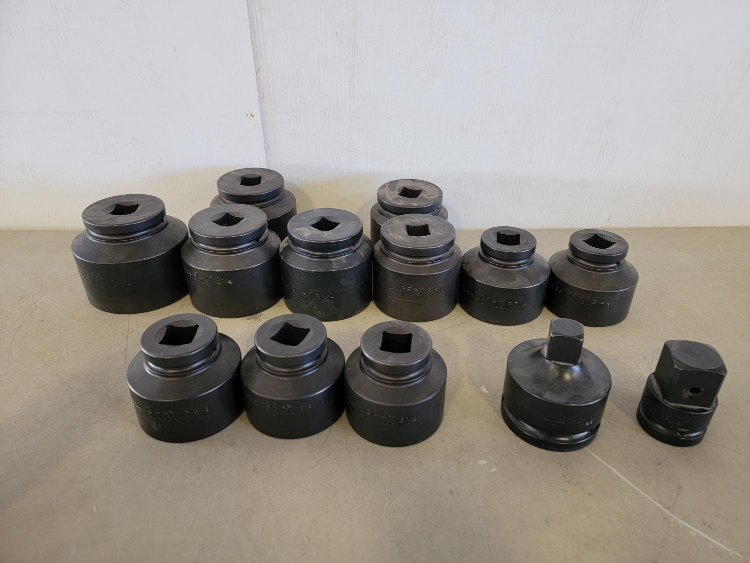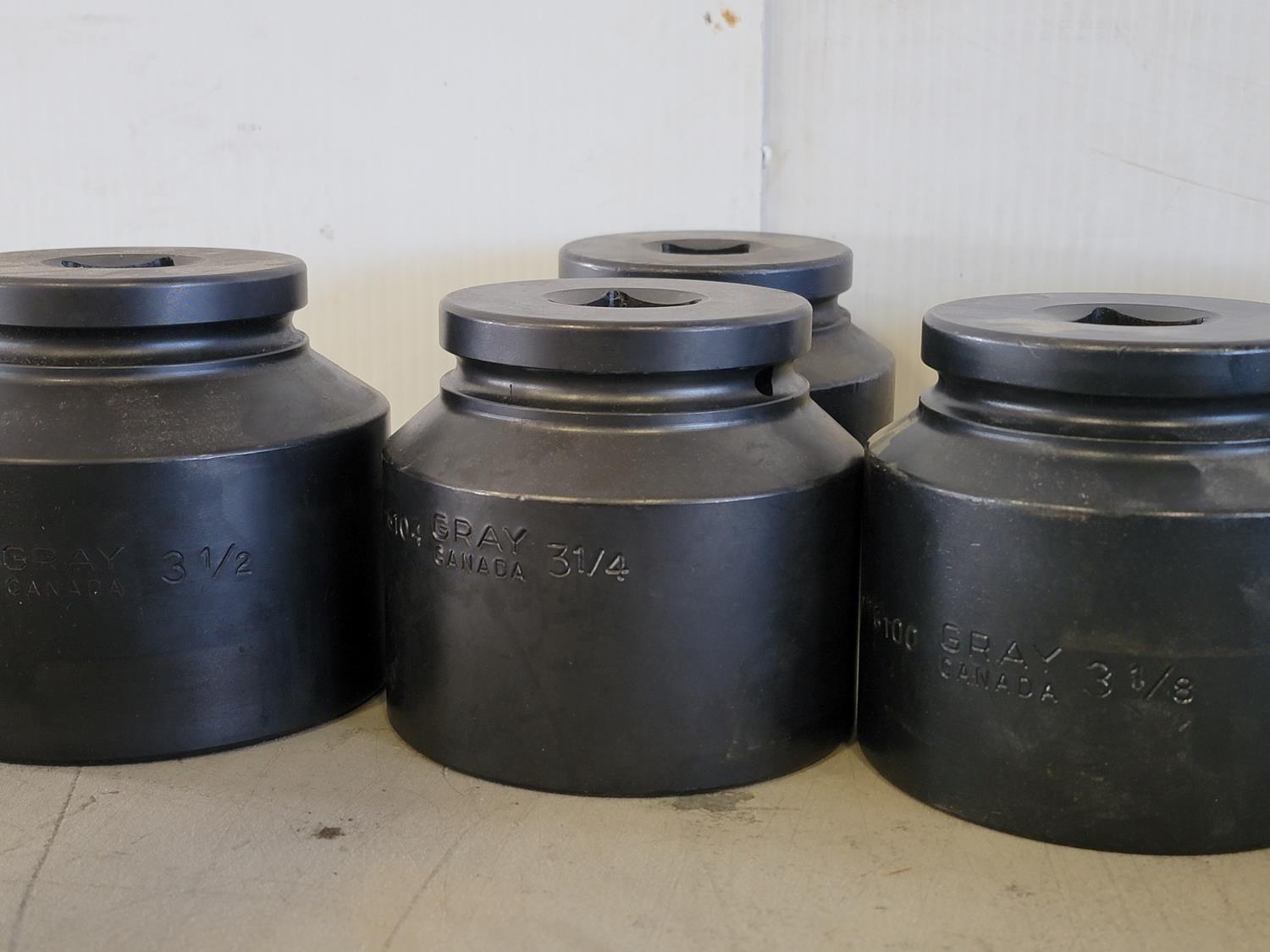 1 inch drive impact sockets: 3-1/2", 3-1/4", 3-1/8", 2-15/16", 2-7/8", 2-3/4", 2-5/8", 2-9/16", 2-1/2", 1-1/2" to 1" adaptor