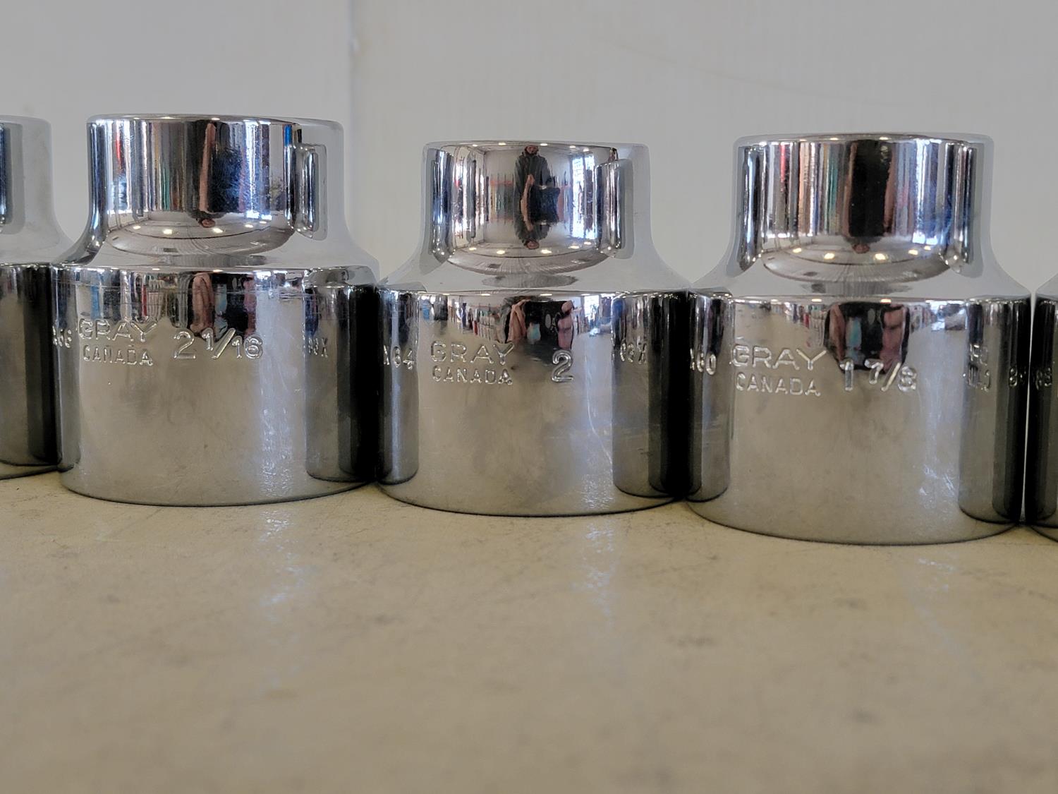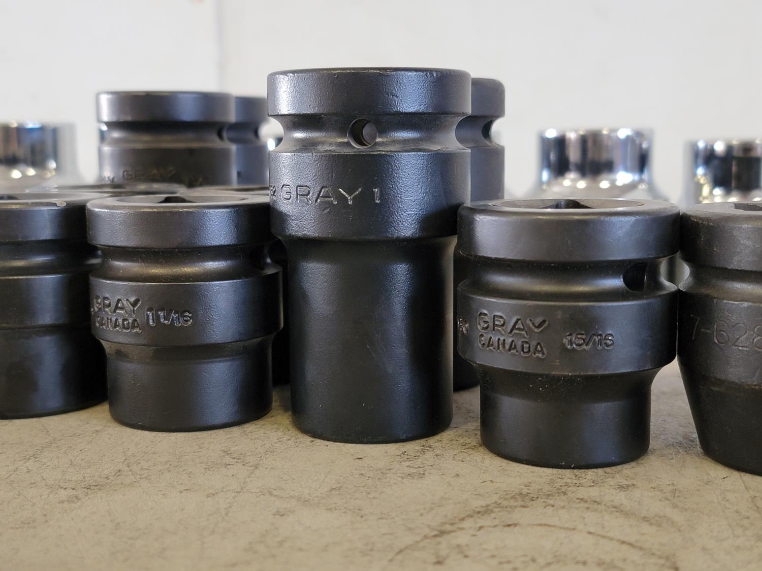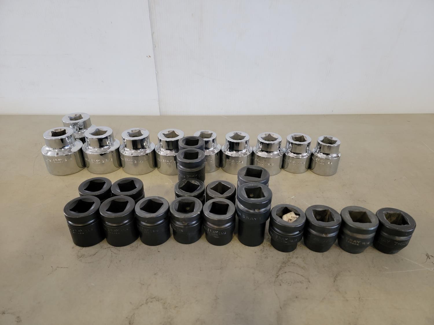 1 inch drive impact sockets: 1-1/4 inch, 1-3/16 inch, 1-1/8 inch, 1-1/16 inch, 1 inch, 15/16 inch, 7/8 inch, 13/16 inch, 3/4 inch, 1 inch drive sockets: 2-1/4 inch, 2-3/16 inch, 2-1/8 inch, 2-1/16 inch, 2 inch, 1-7/8 inch, 1-13/16 inch, 1-11/16 inch, 1-5/8 inch