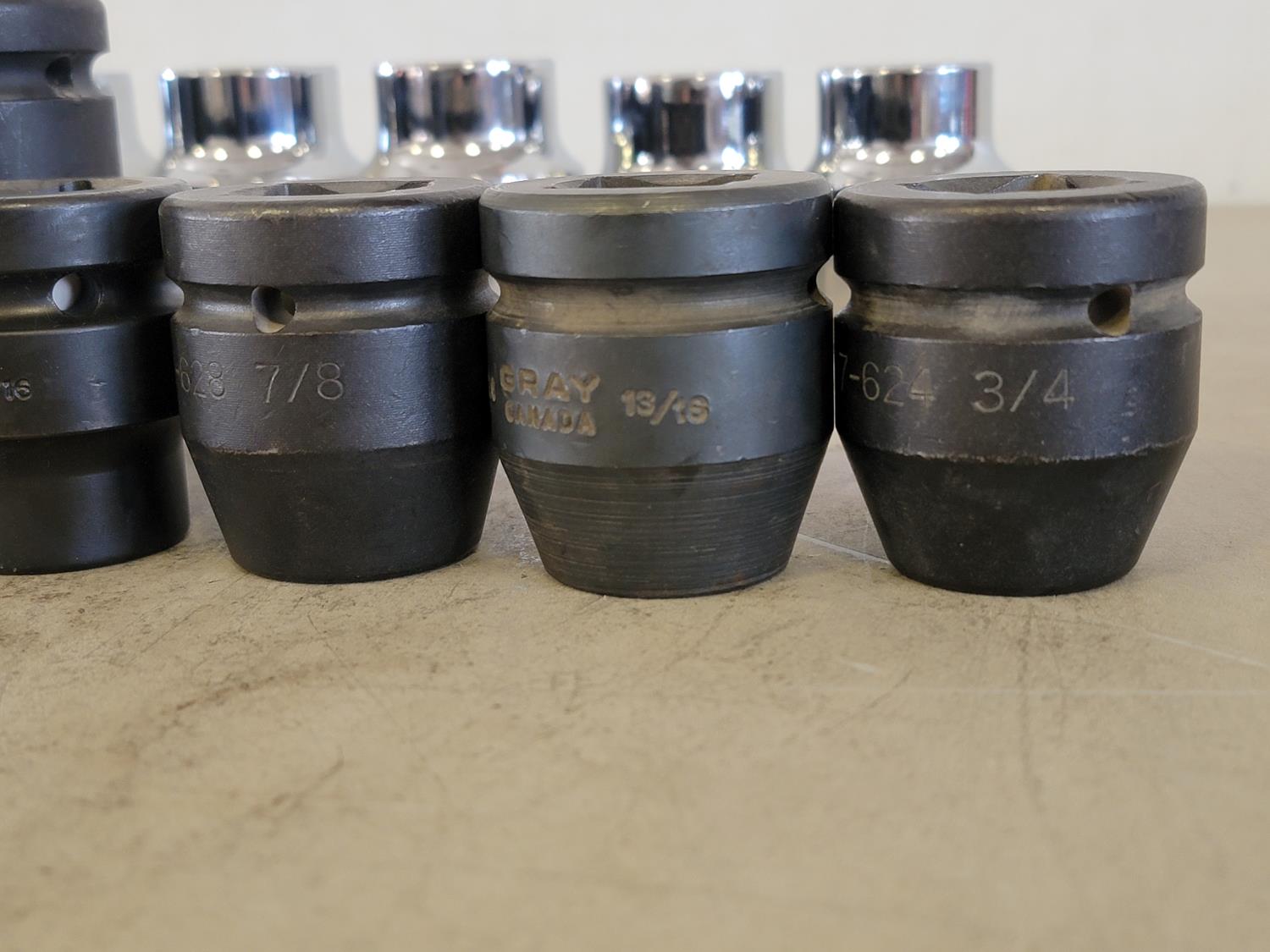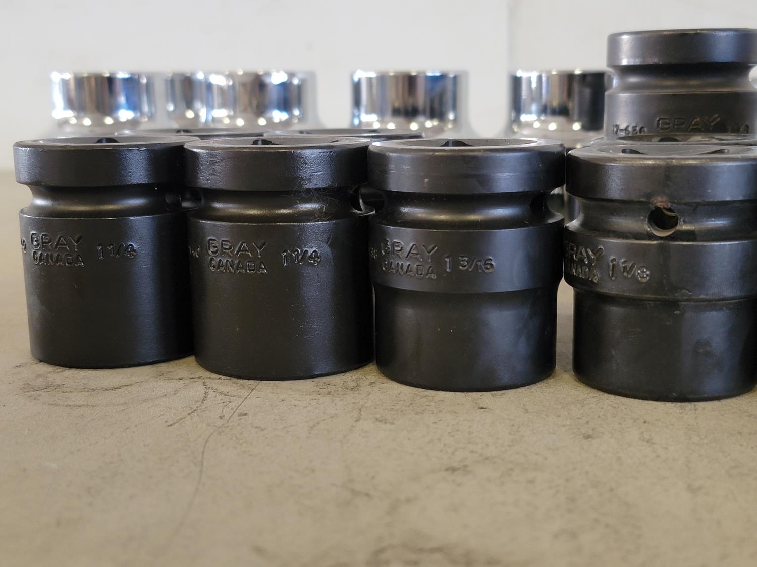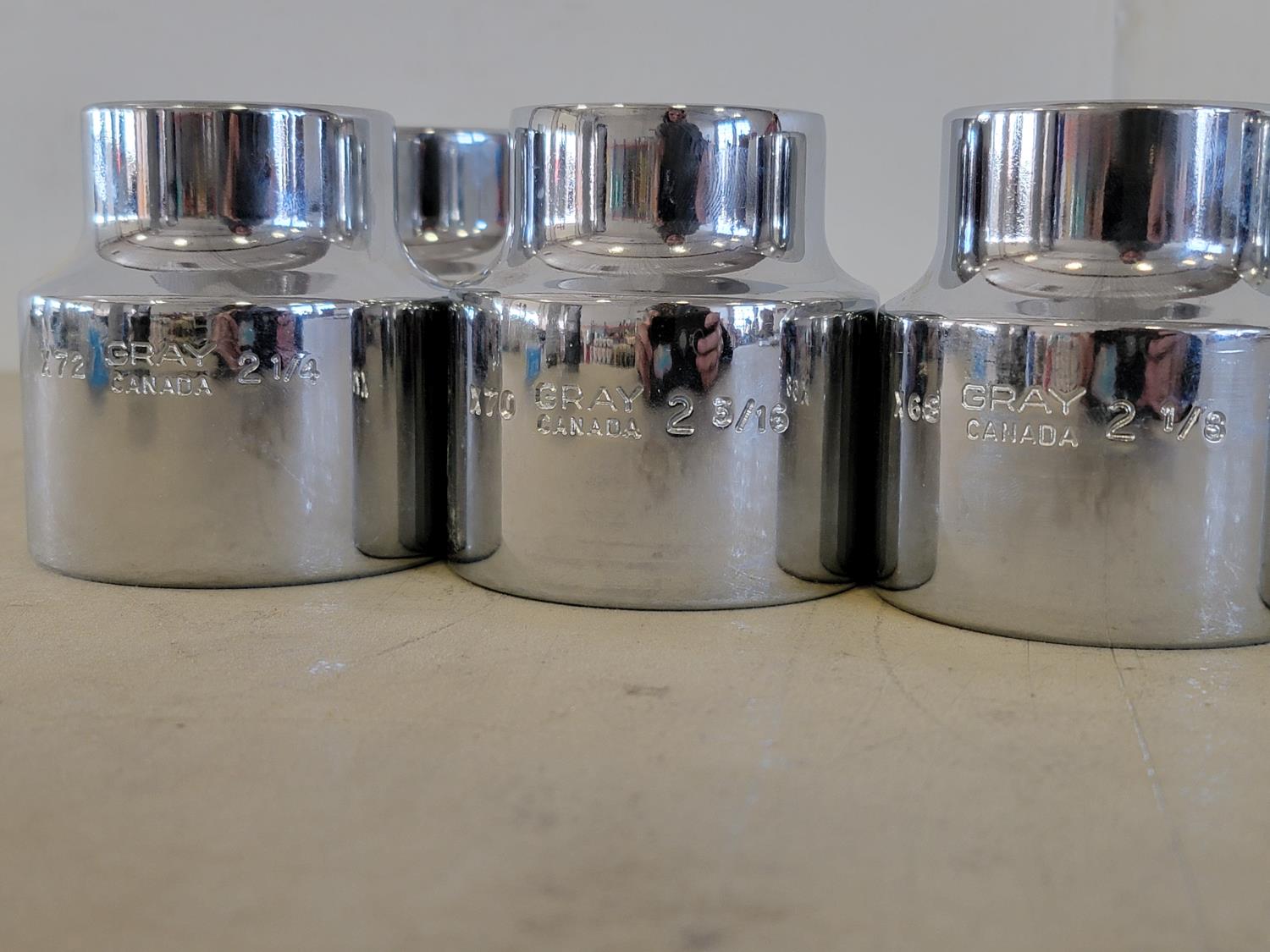 1 inch drive impact sockets: 1-1/4 inch, 1-3/16 inch, 1-1/8 inch, 1-1/16 inch, 1 inch, 15/16 inch, 7/8 inch, 13/16 inch, 3/4 inch, 1 inch drive sockets: 2-1/4 inch, 2-3/16 inch, 2-1/8 inch, 2-1/16 inch, 2 inch, 1-7/8 inch, 1-13/16 inch, 1-11/16 inch, 1-5/8 inch