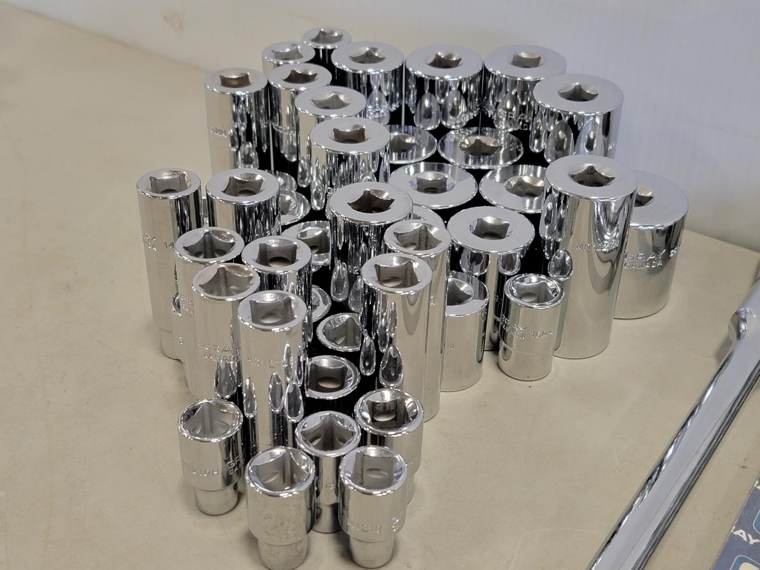 10 mm - 36 mm socket set, 3/8 inch, 7/16 inch, 1/2 inch, 9/16 inch, 5/8 inch, 11/16 inch, 3/4 inch, 13/16 inch, 7/8 inch, 1-15/16 inch, 1-1/16 inch, 1-1/8 inch, 1-3/16 inch, 1-1/4 inch, 1-5/16 inch, 1-3/8 inch, 1-7/16 inch, 1-1/2 inch