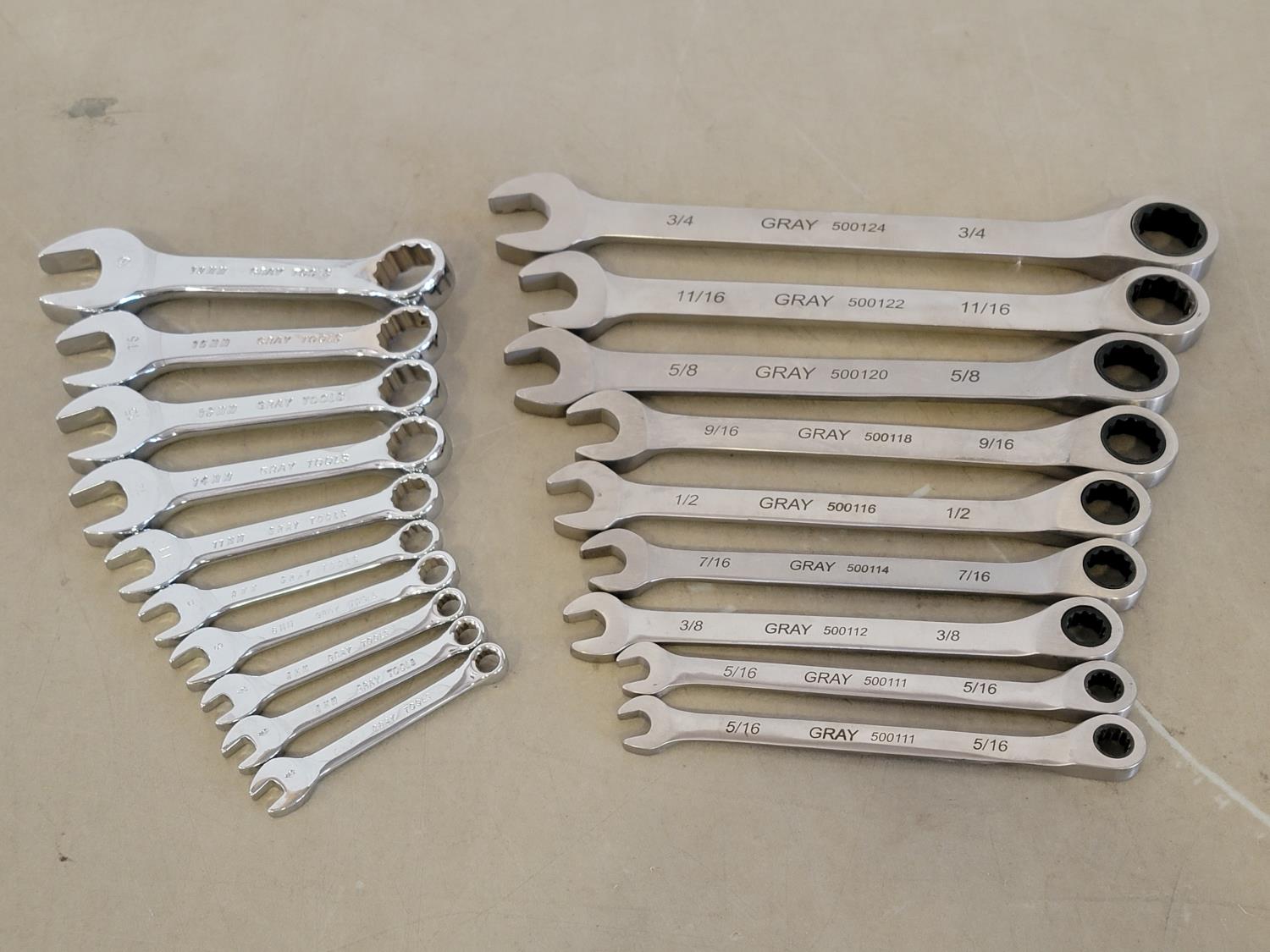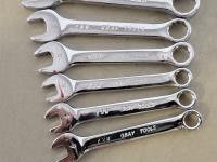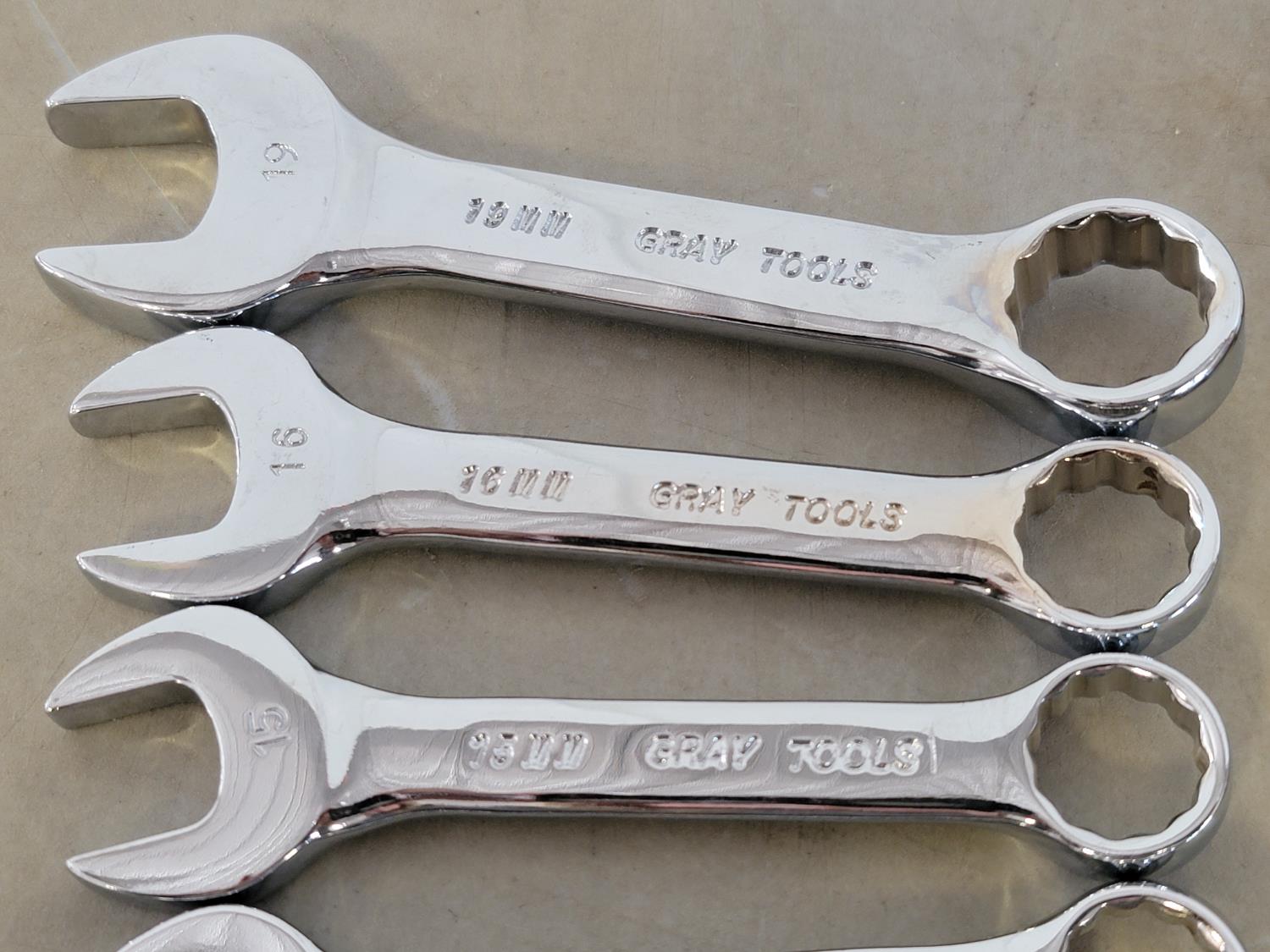 Ratchet wrenches: 3/4 inch, 11/16, 5/8 inch, 9/16 inch, 1/2 inch, 7/16 inch, 3/8 inch, 5/16 inch, stubby metric wrenches: 19 mm, 16 mm, 15 mm, 14 mm, 11 mm, 9 mm, 8 mm, 6 mm