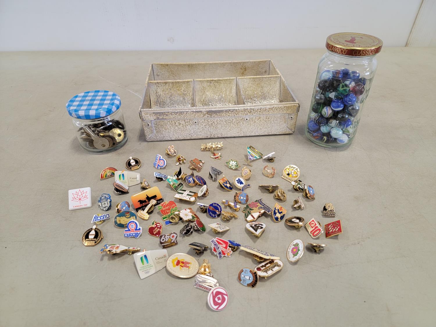 marbles, pins, keys, cash drawer