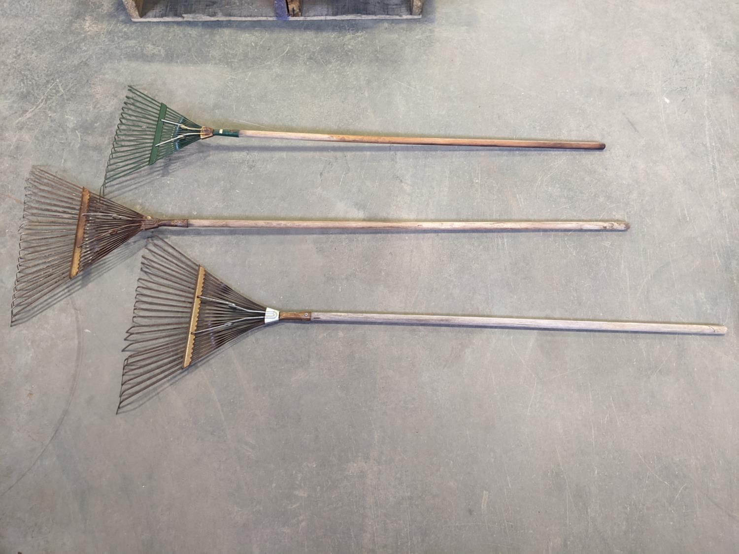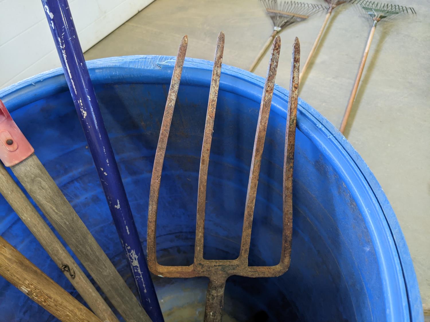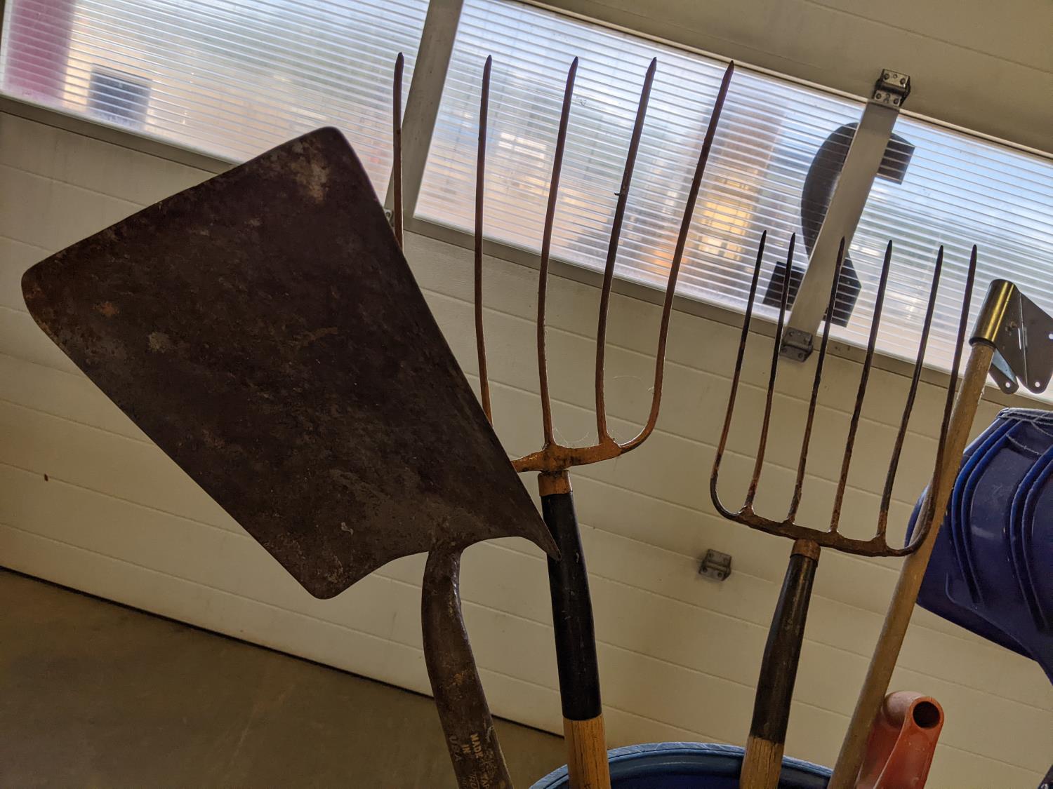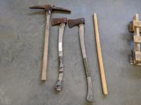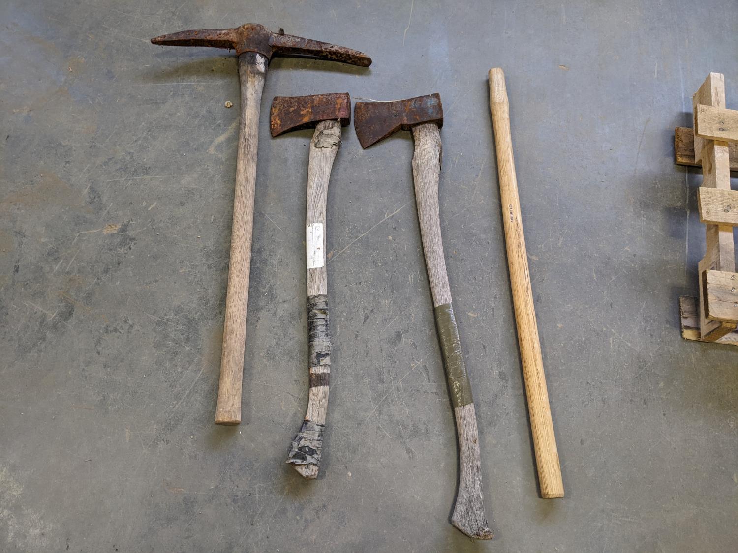 (2) Axes, (3) rakes, snow shovel, grain shovels, pitch forks