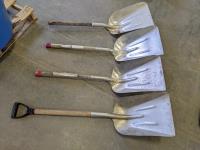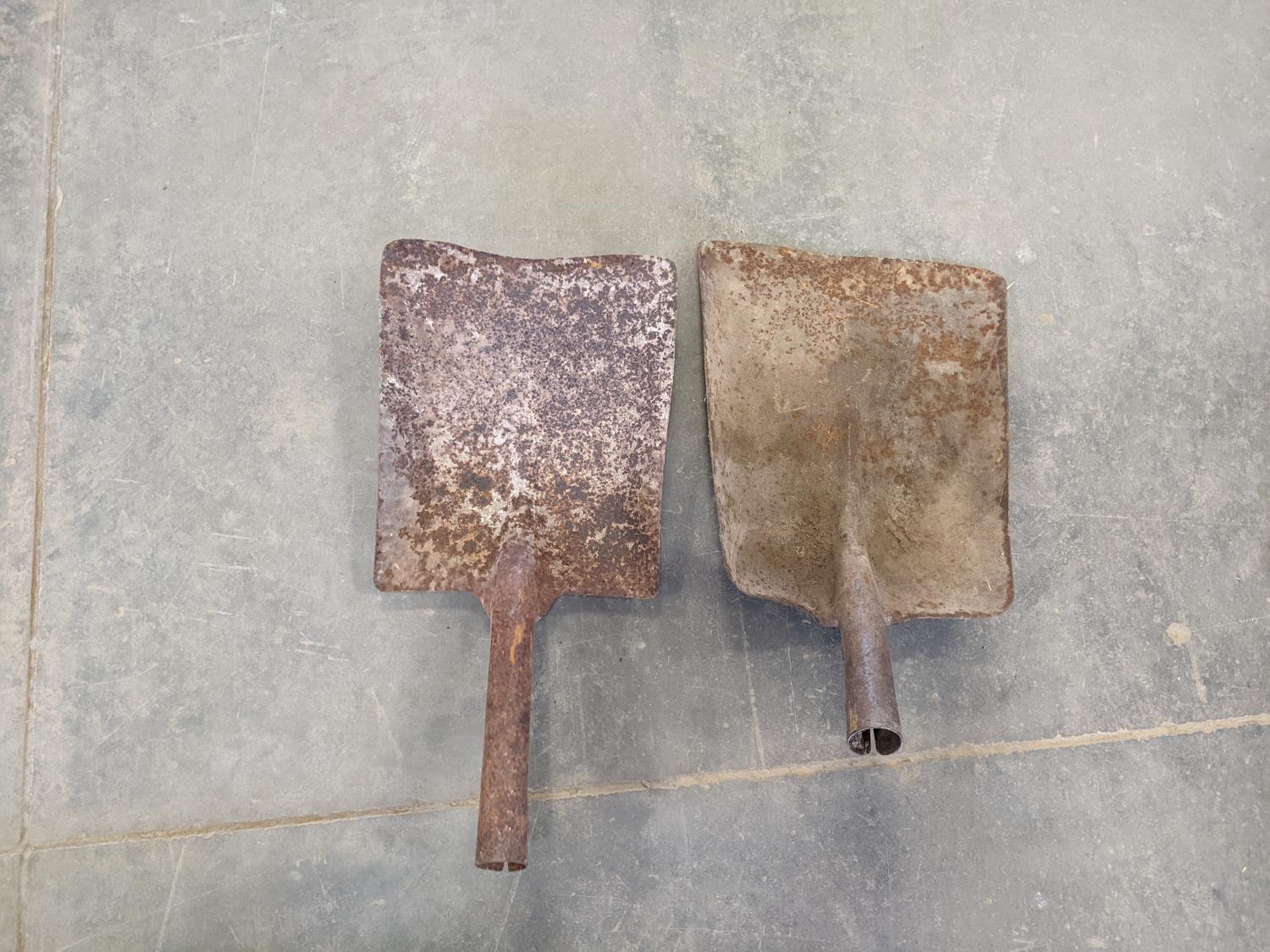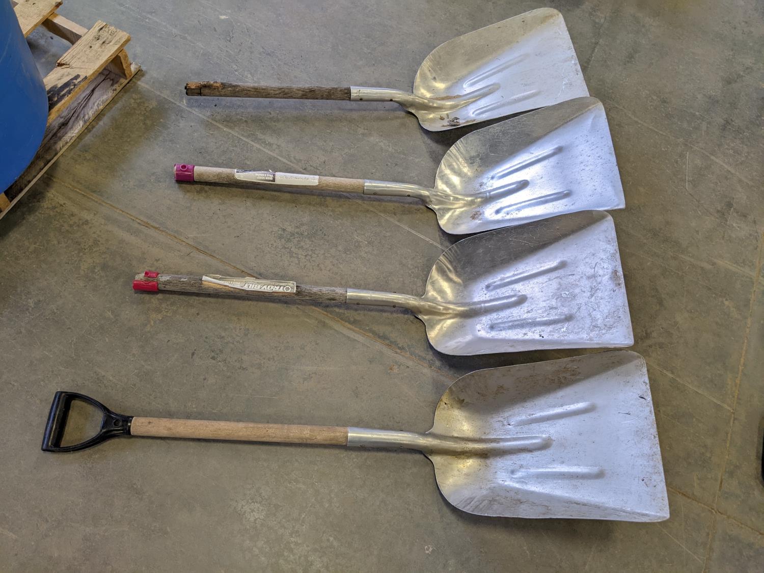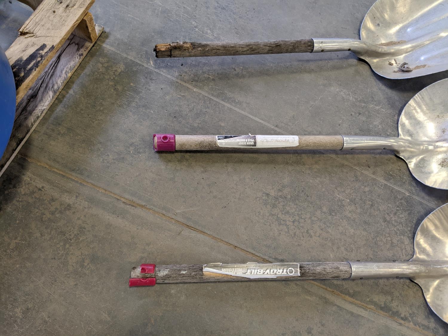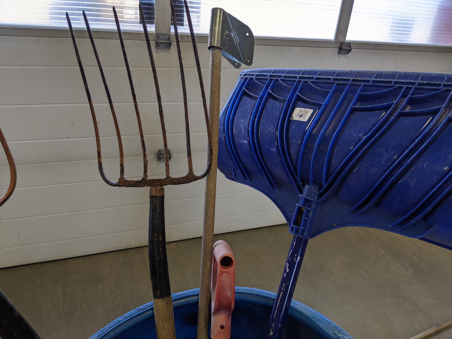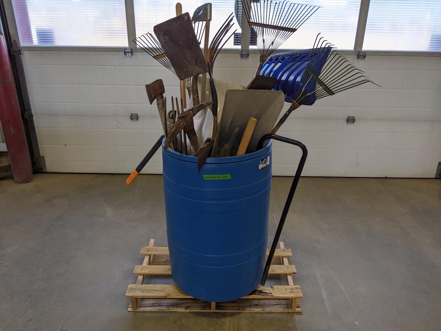(2) Axes, (3) rakes, snow shovel, grain shovels, pitch forks