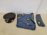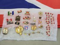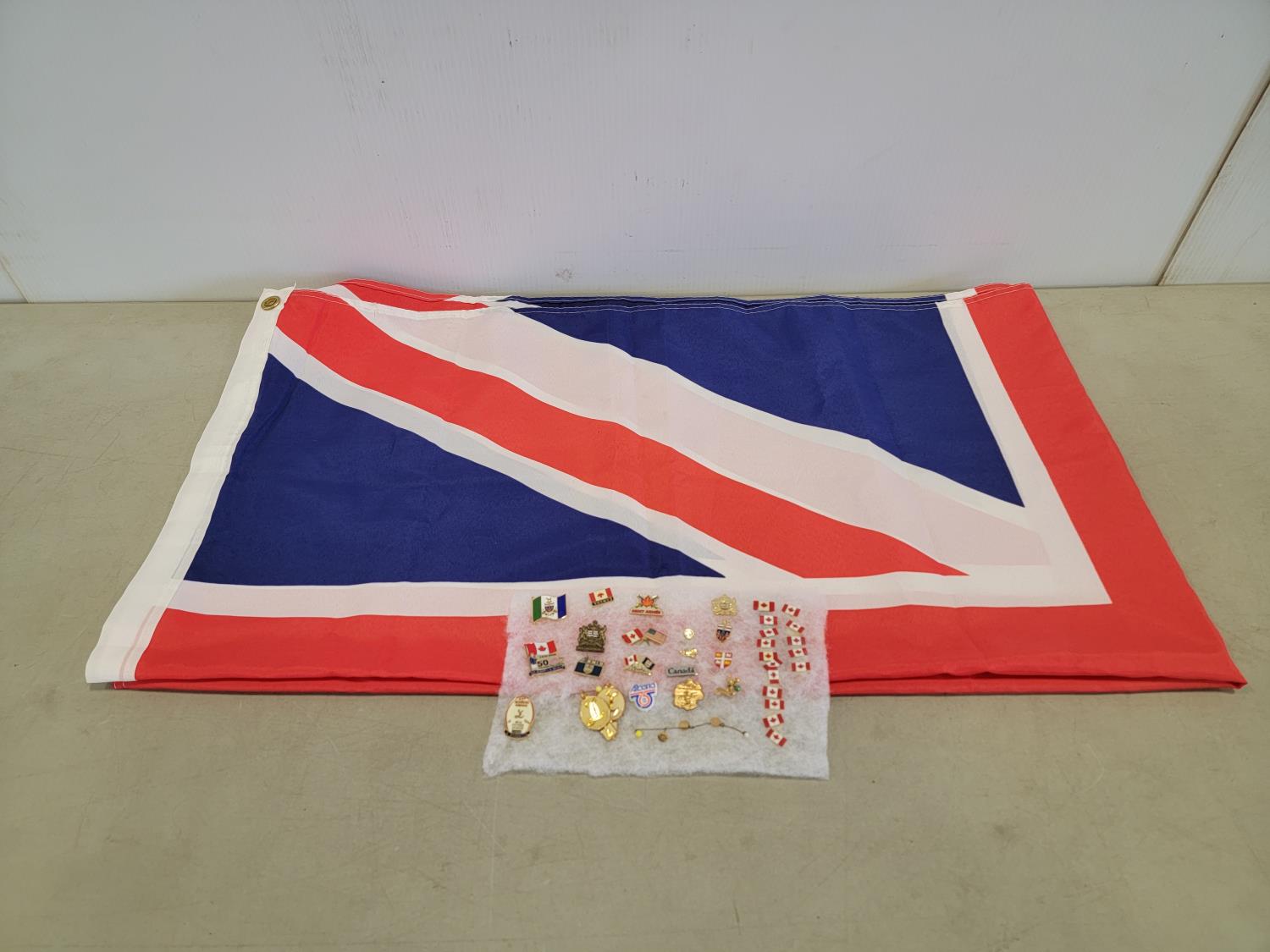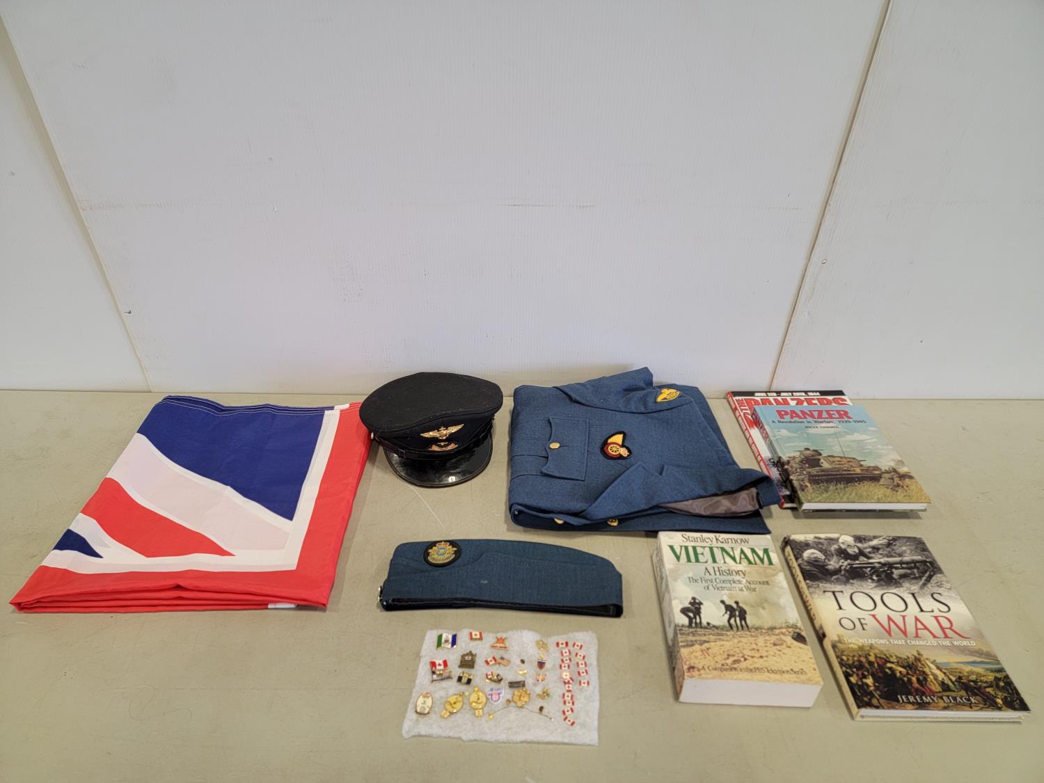 UK flag, war books, military blazer and carp, air cadet cap, pins
