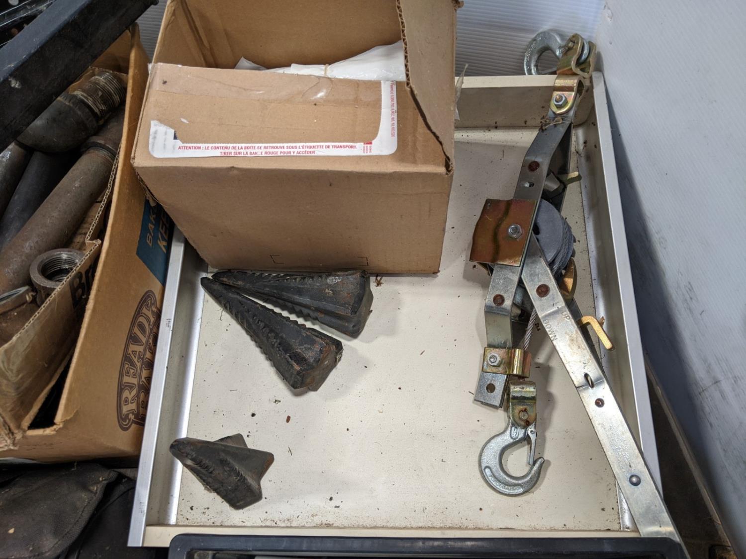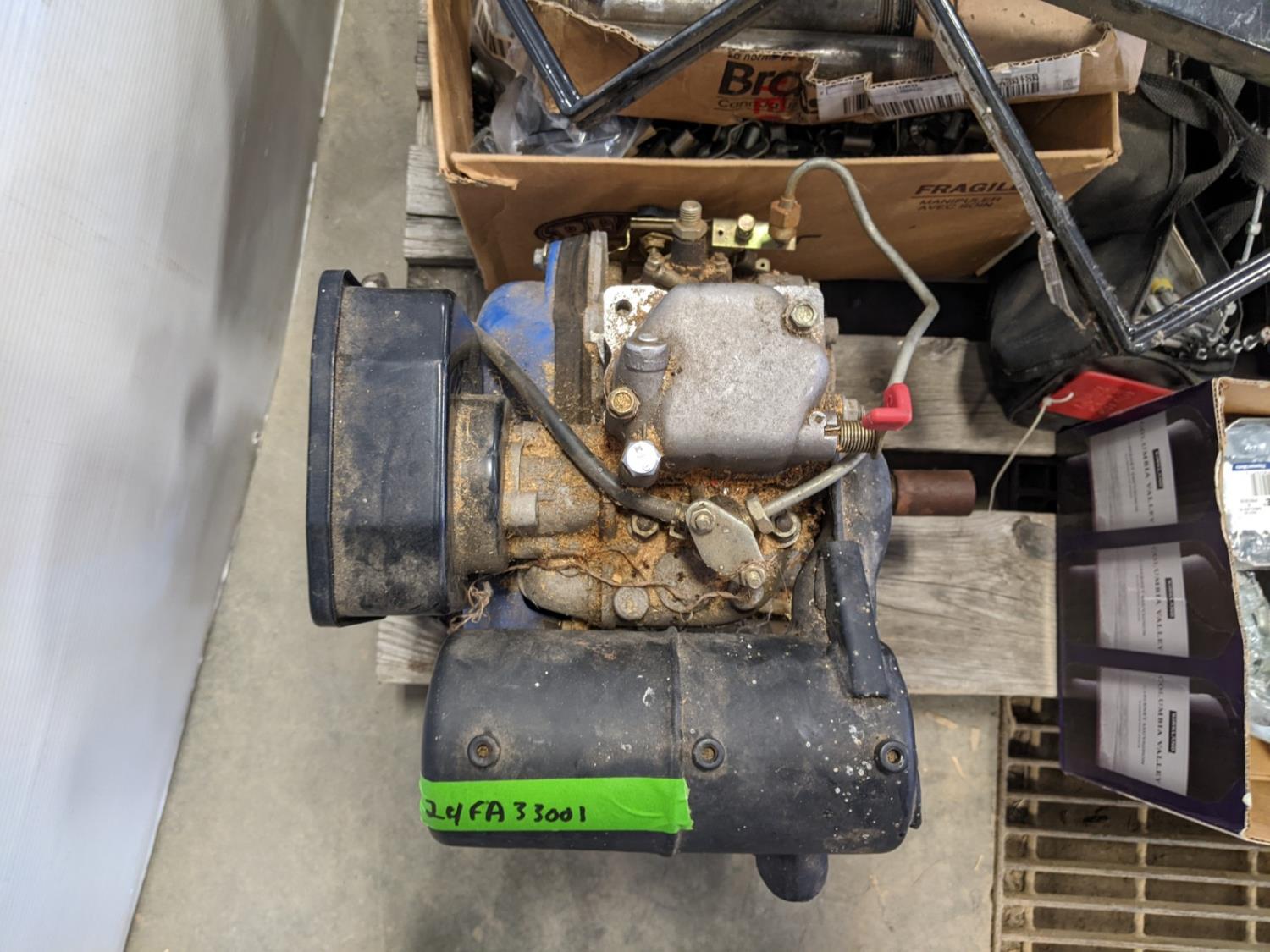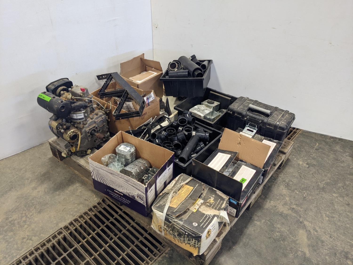 qty of plumbing and electrical fittings, (3) dyno wedges, diesel air-cooled engine, cable power pull, bolts and nails