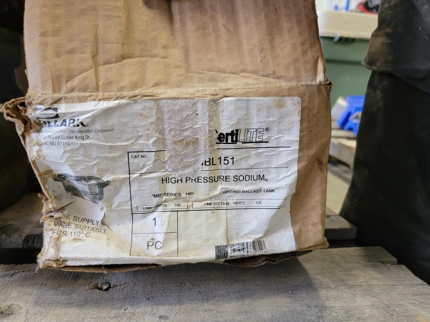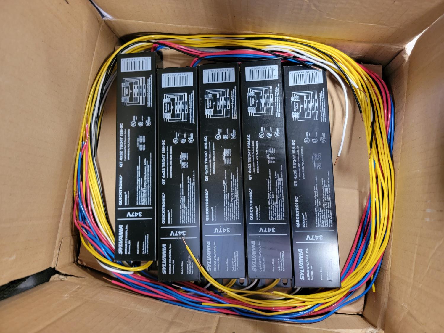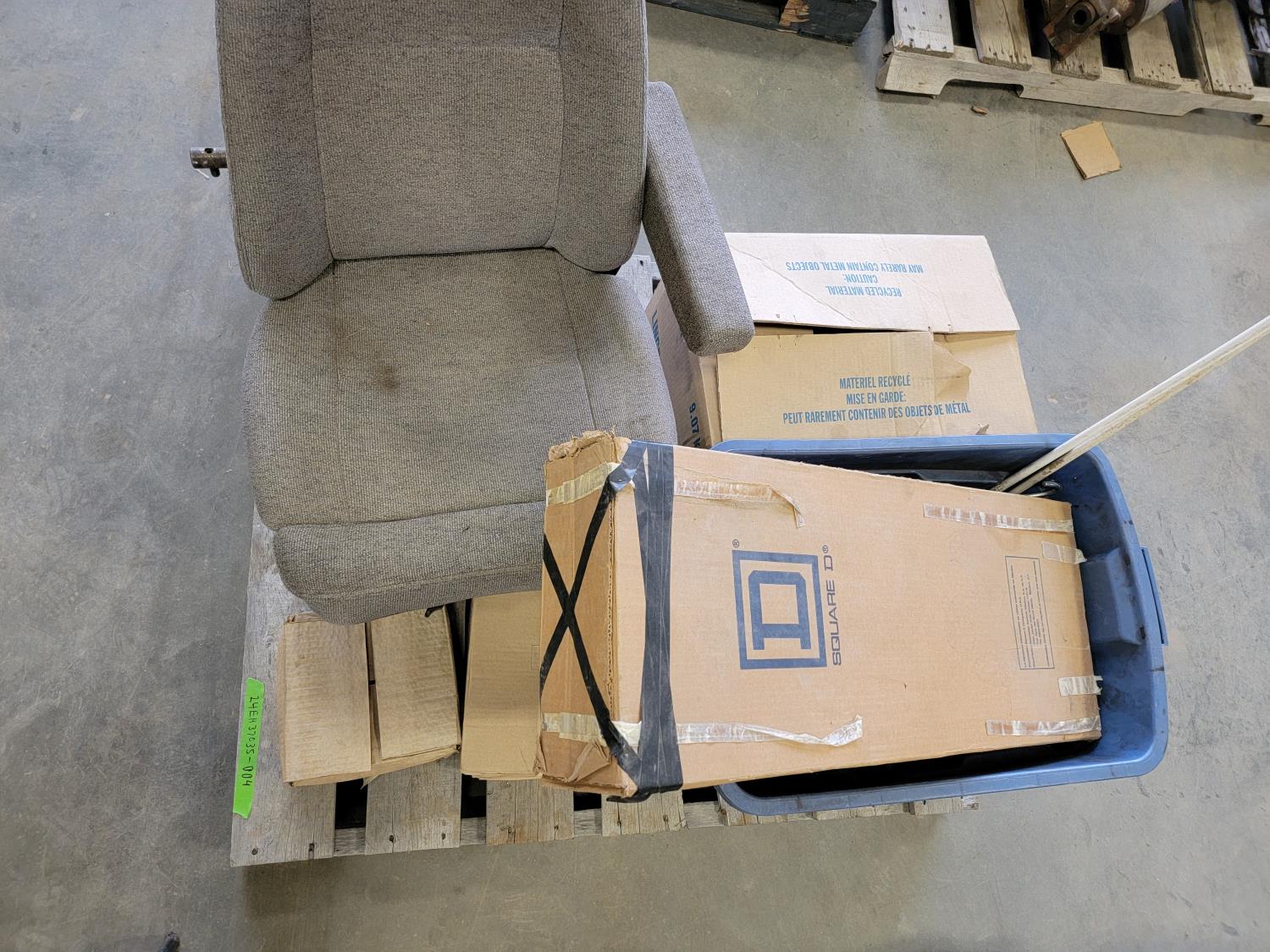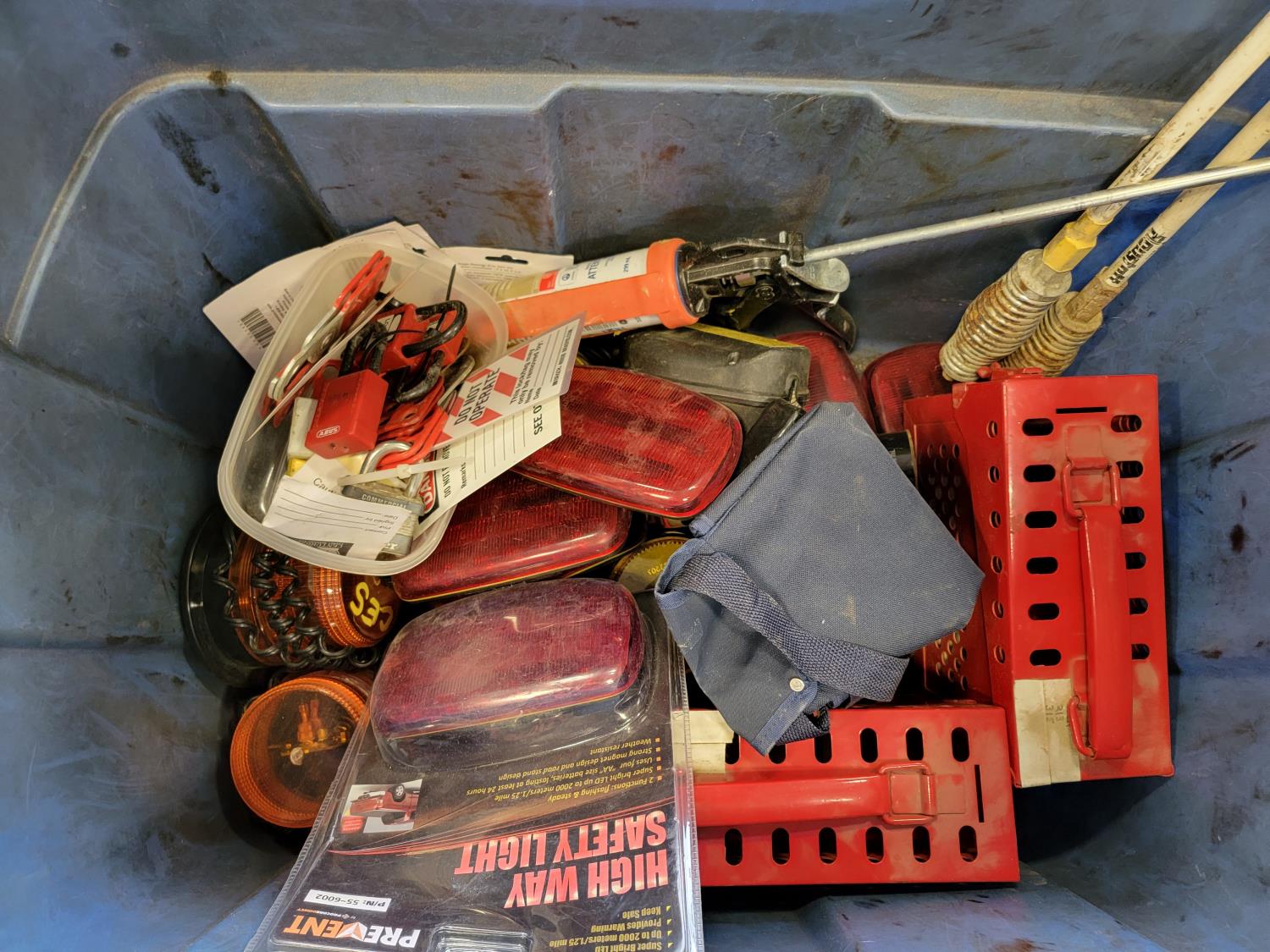 vehicle chair, lighting ballast tank, 4-lamp instant start T8 electronic ballasts, vehicle lights, lockout boxes and locks, caulking gun, truck flags, panel board, rags