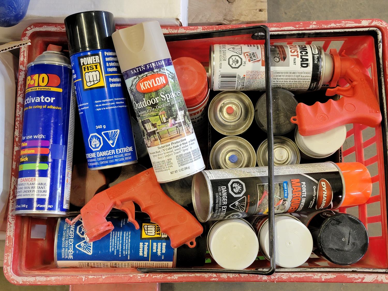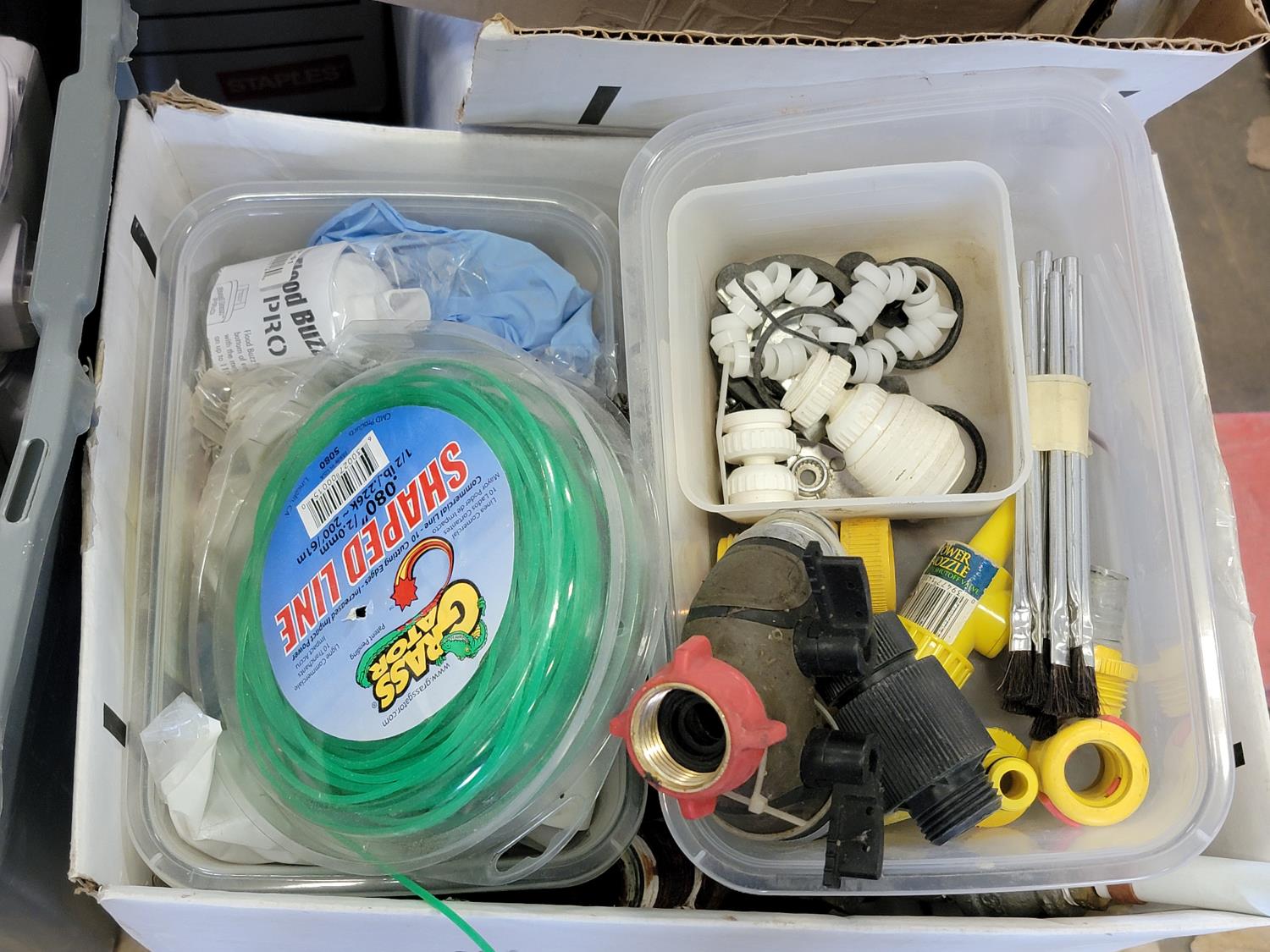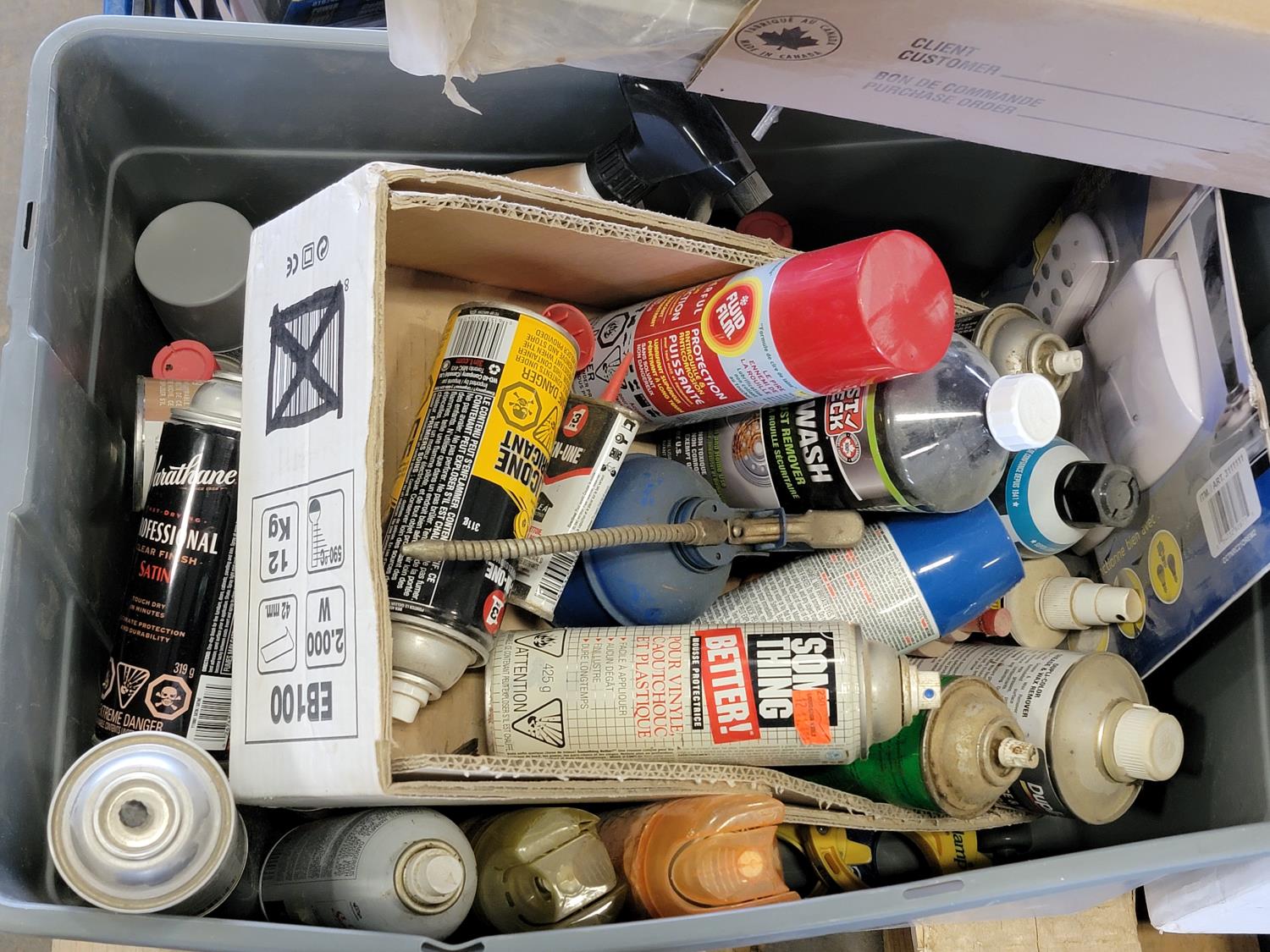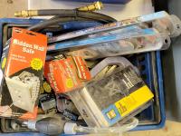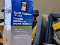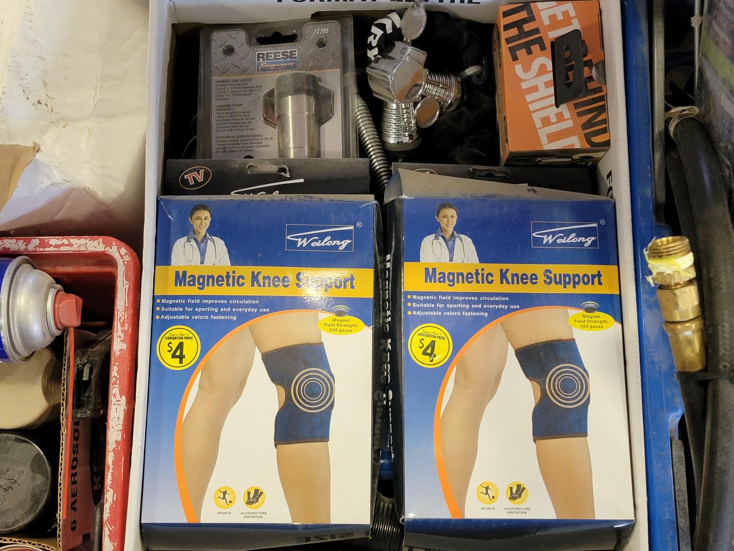 aerosol, breaker switches, magnetic knee brace, shop light, battery maintainer, pad locks, 500,000 BTU propane torch kit, weed trimmer line