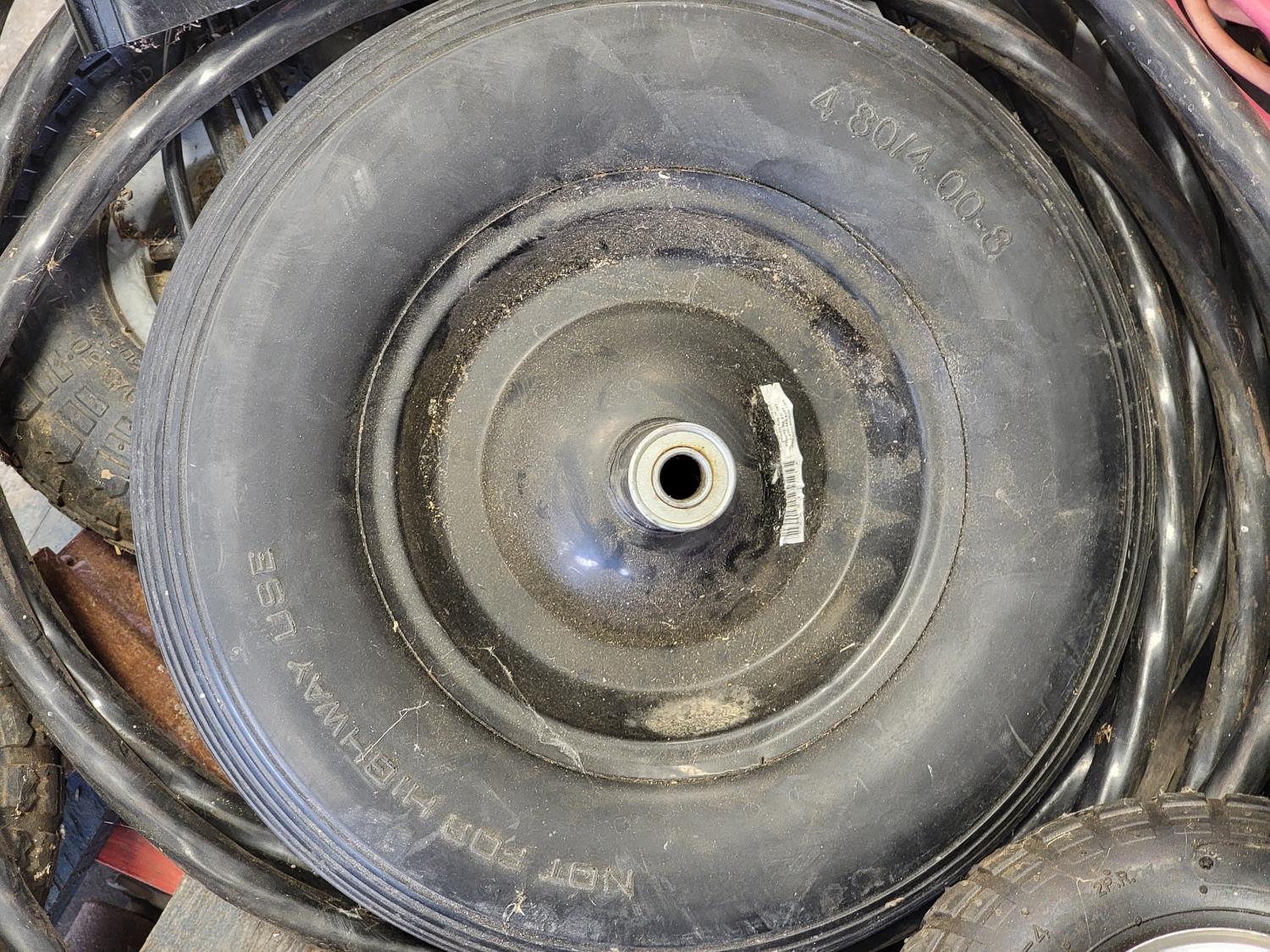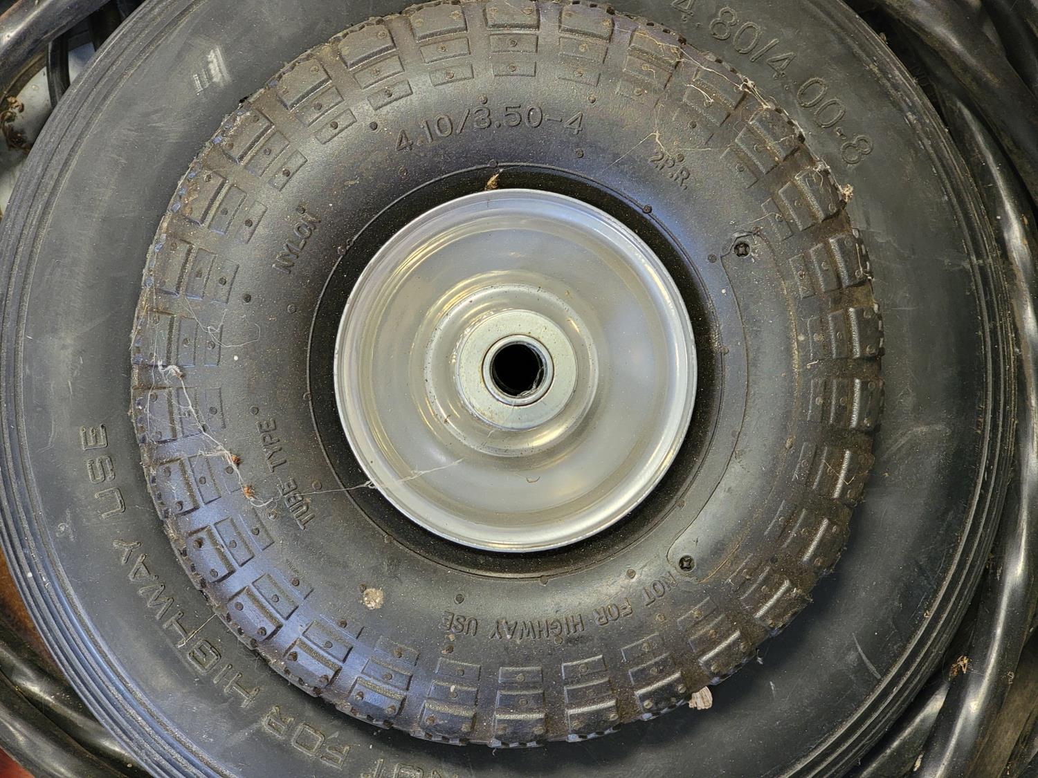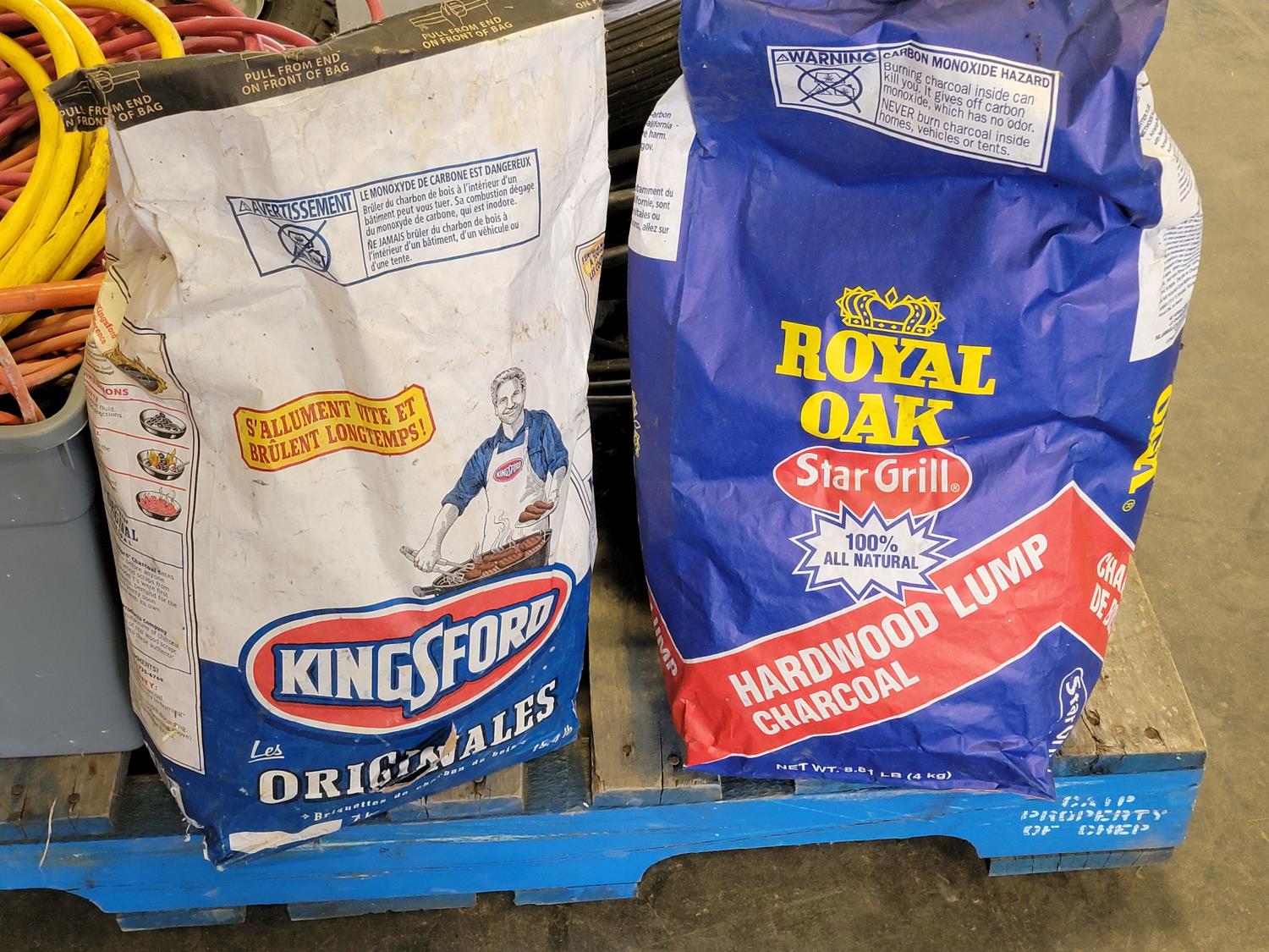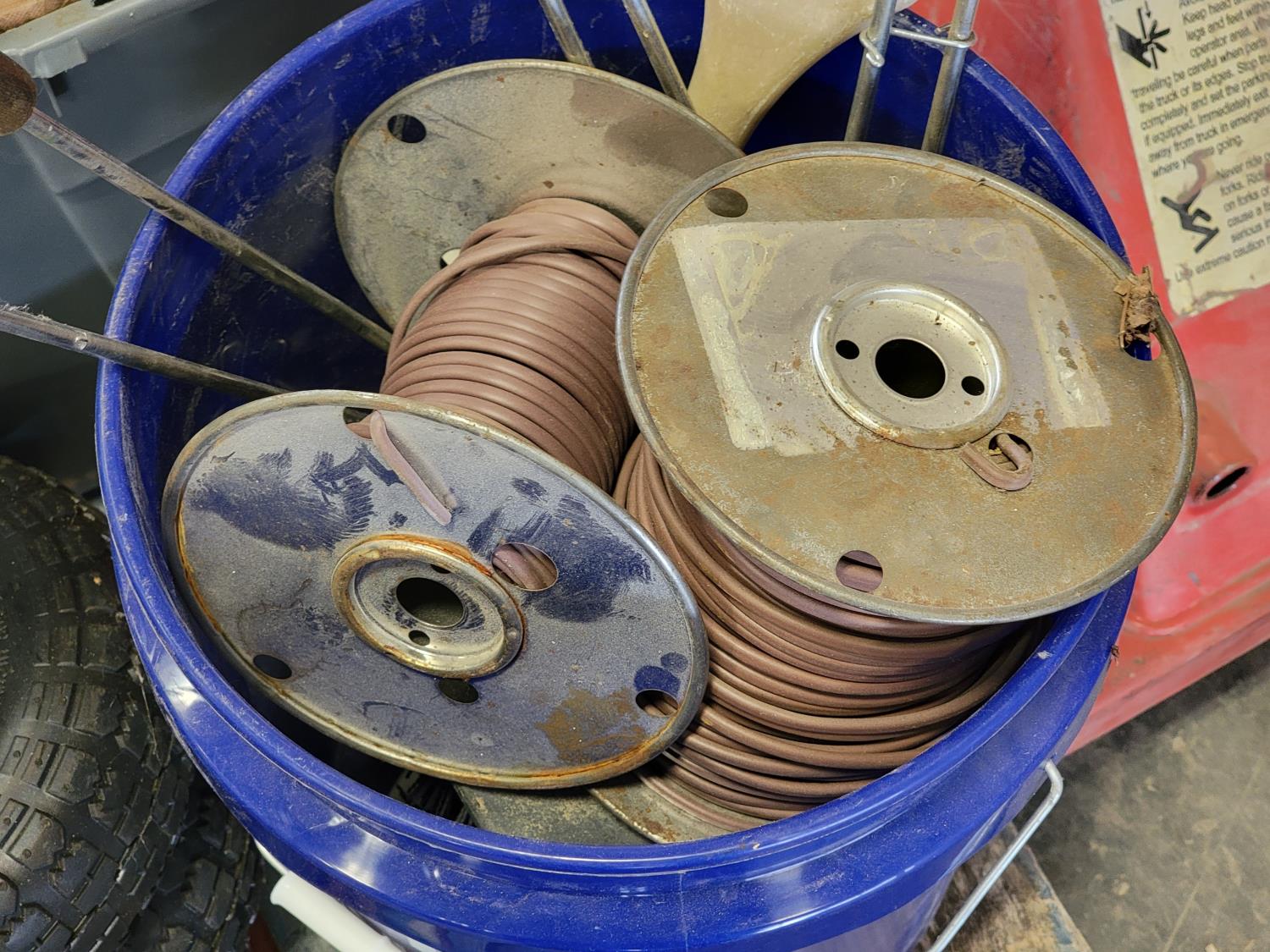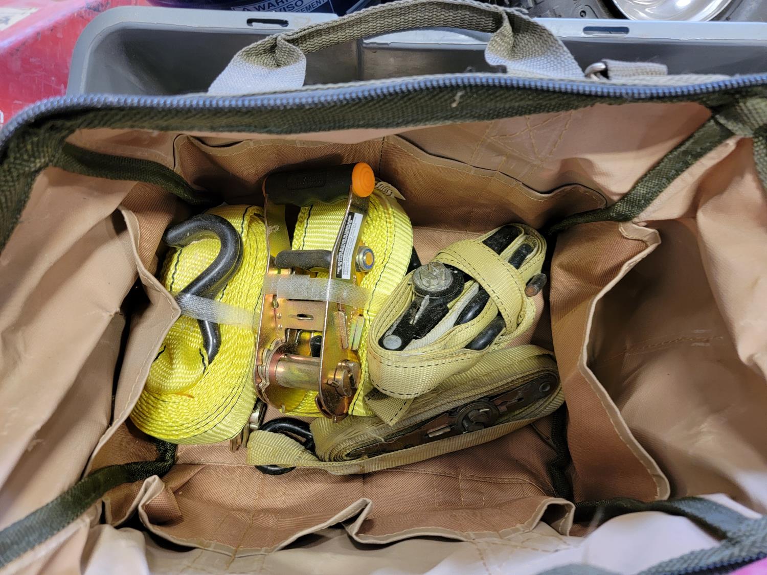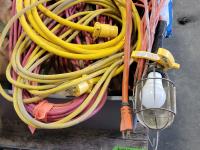 ratchet straps, extension cords, work light, charcoal, trolley tires, spools of electrical wire