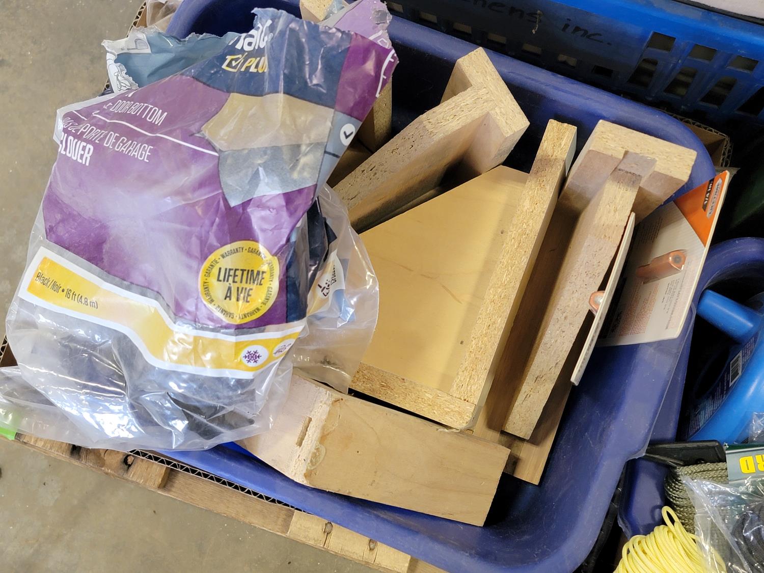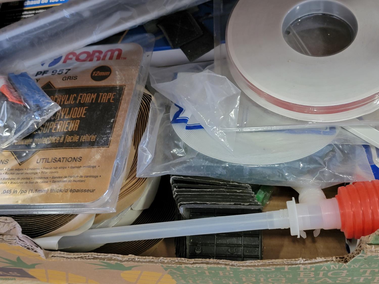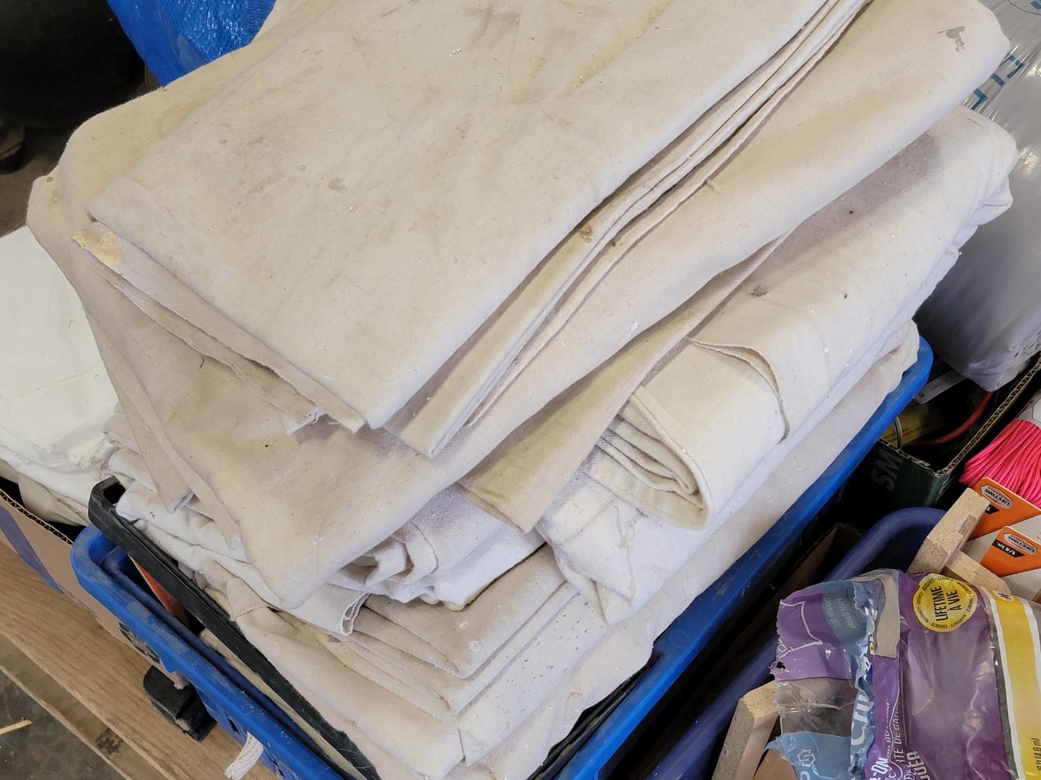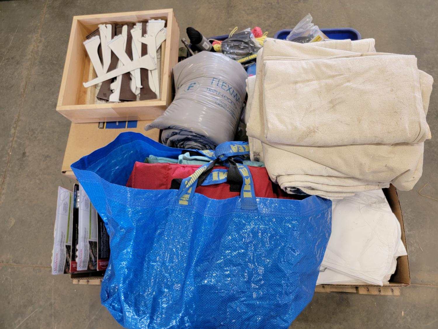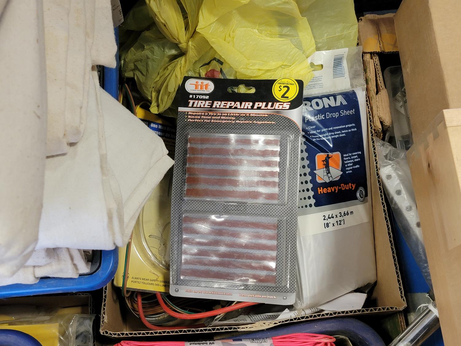 canvas sheets, painting coveralls, rain gear, tire repair plugs, plastic painting sheet, fabriflex, cord, shelving hardware, undercabinet LED lights, seat cushions, flanged wax gaskets