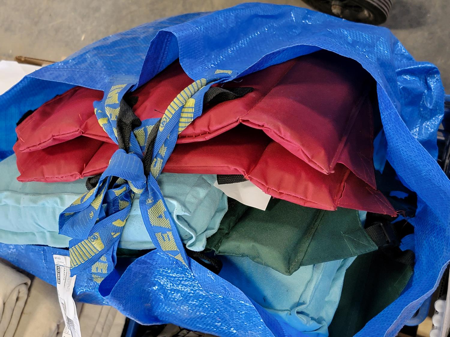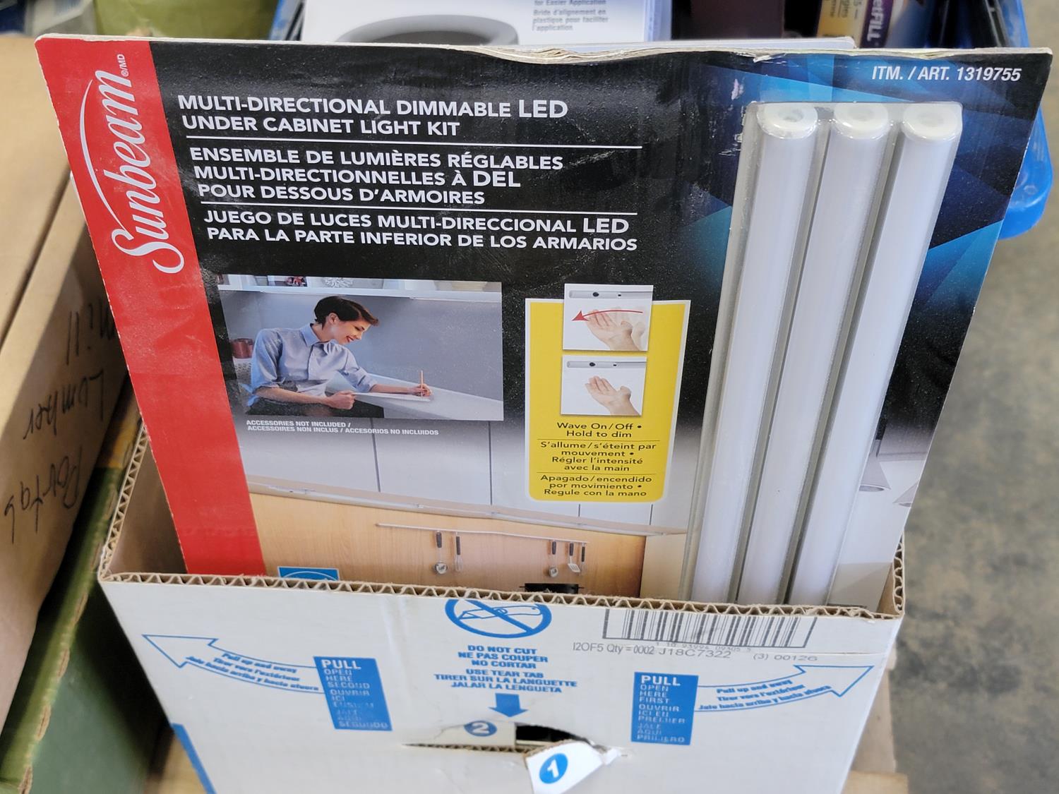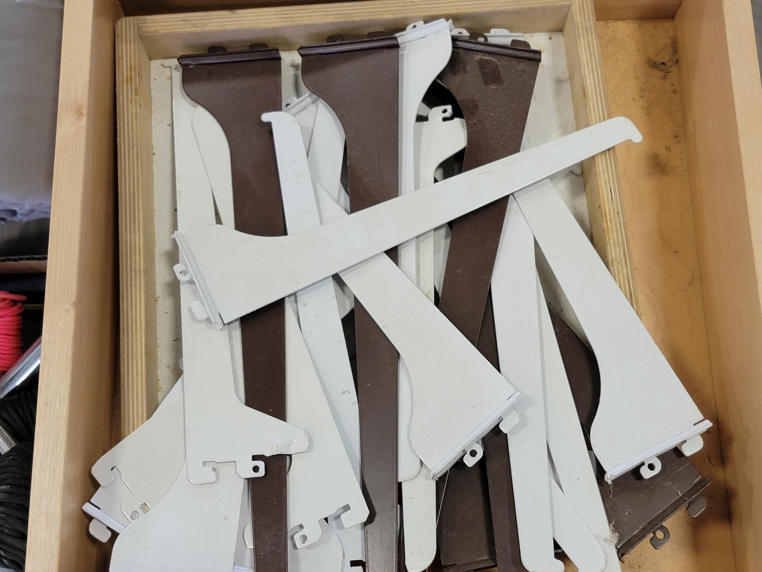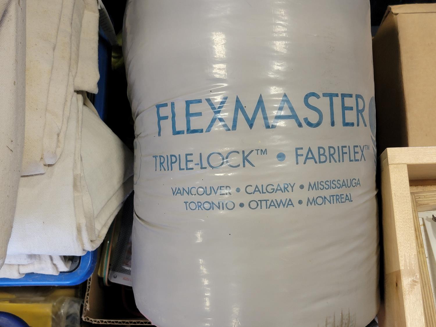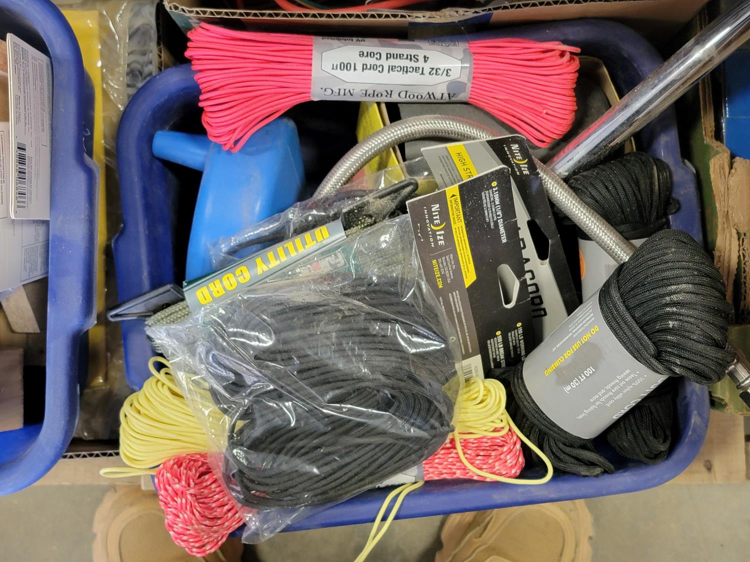 canvas sheets, painting coveralls, rain gear, tire repair plugs, plastic painting sheet, fabriflex, cord, shelving hardware, undercabinet LED lights, seat cushions, flanged wax gaskets