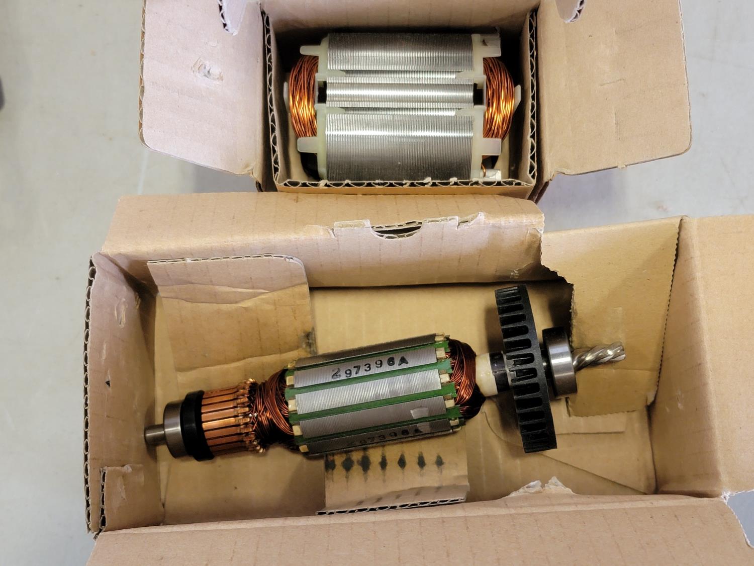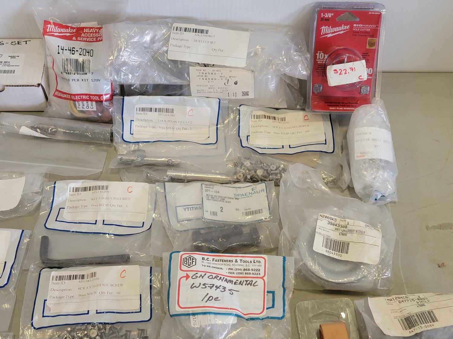 Armature set, shop dispenser, potted pieceb kit, lock pins, dust caps, 1-3/8 inch hole saw, keyless drill chuck, switches, hex keys, spanner hand screwdriver, blade fastener, ball bearing, brush assembly