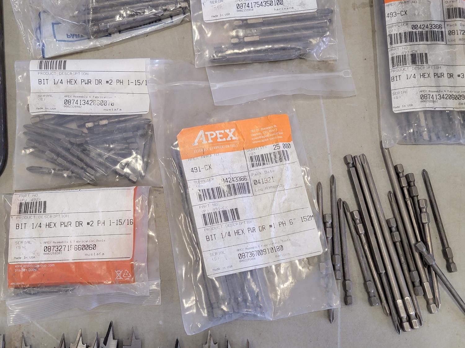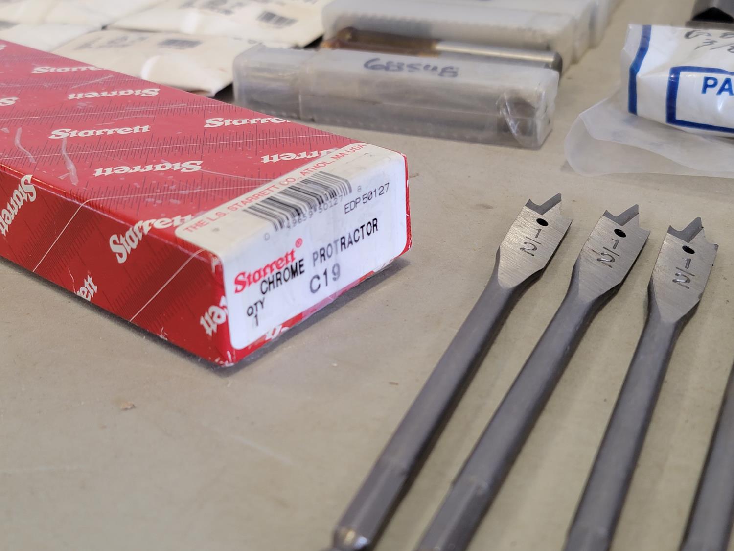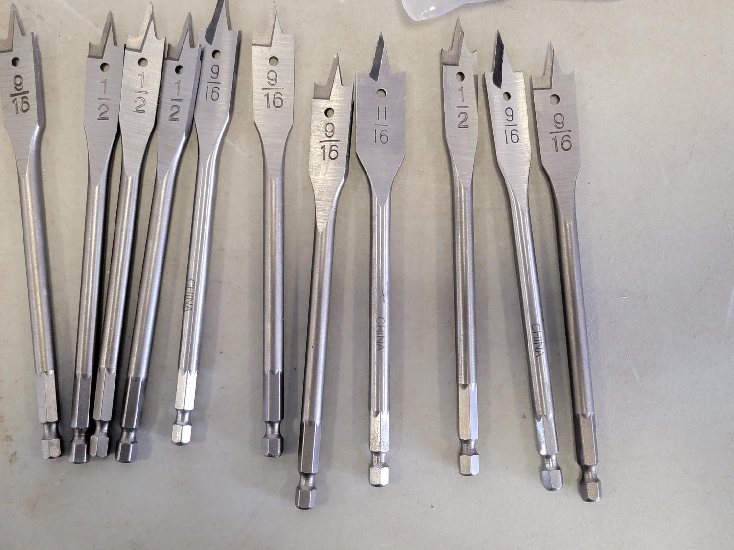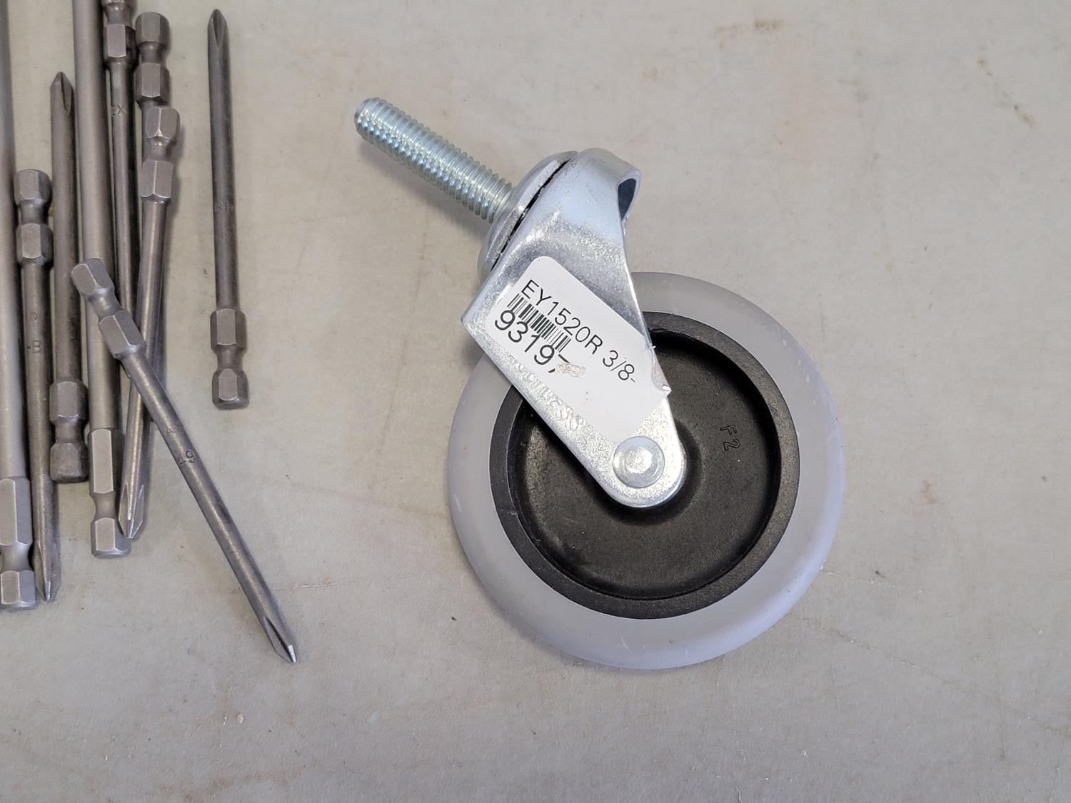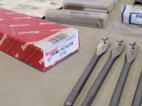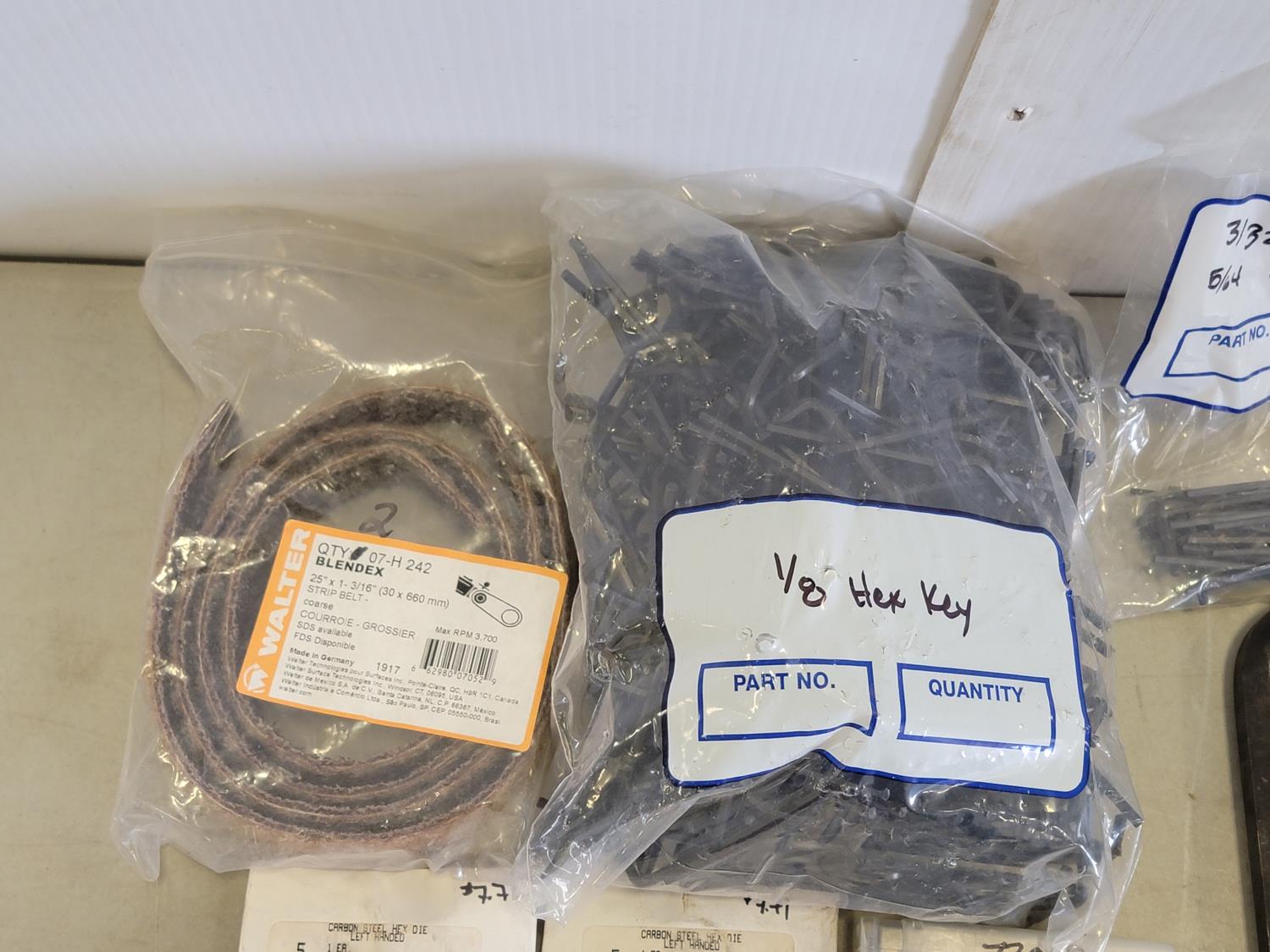 Strip belts, 1/8 inch hex keys, 5/32 and 5/64 inch hex keys, carbides, drill bits, trolley wheel, wood drill bits, carbon steel hex die