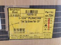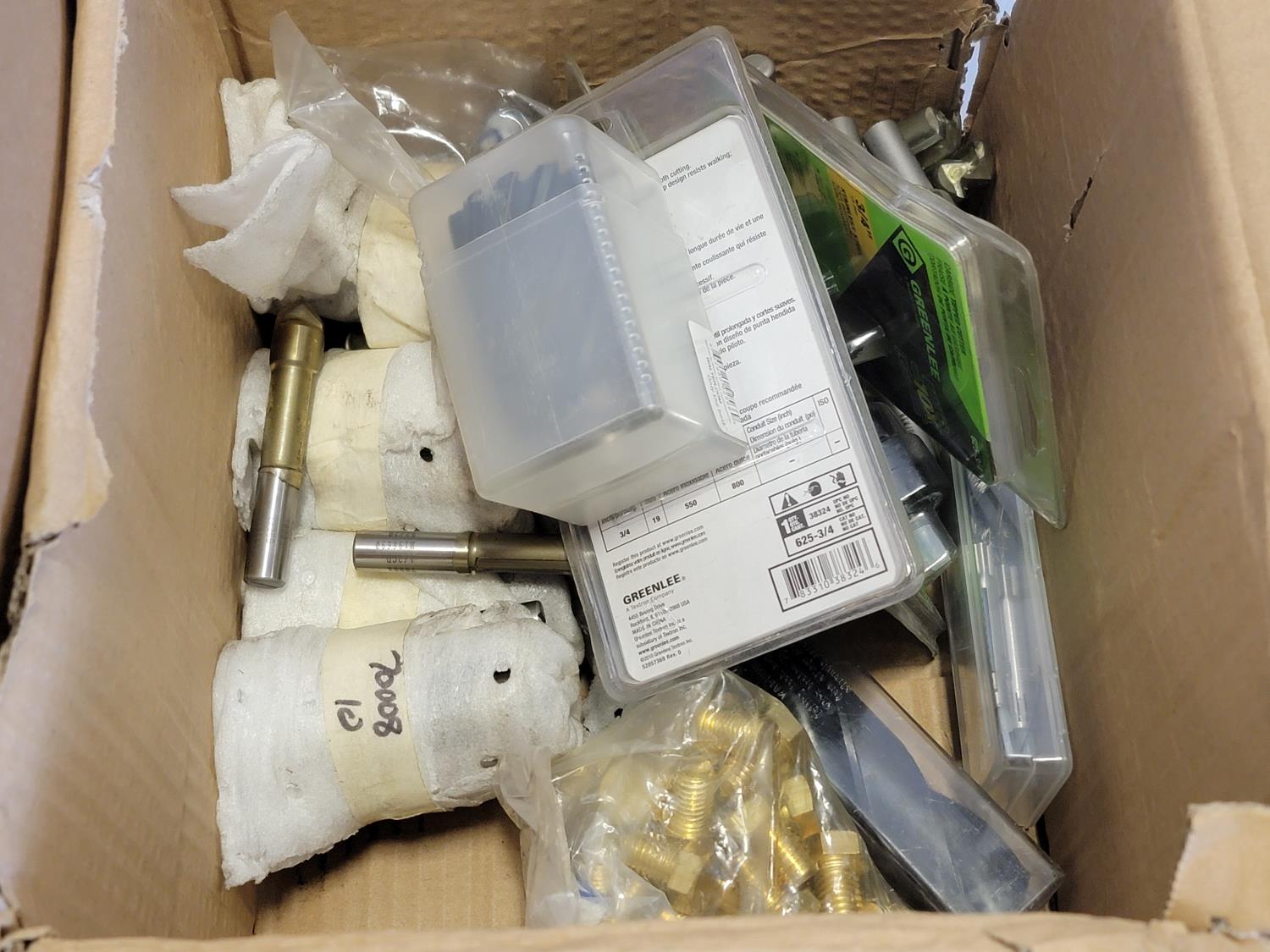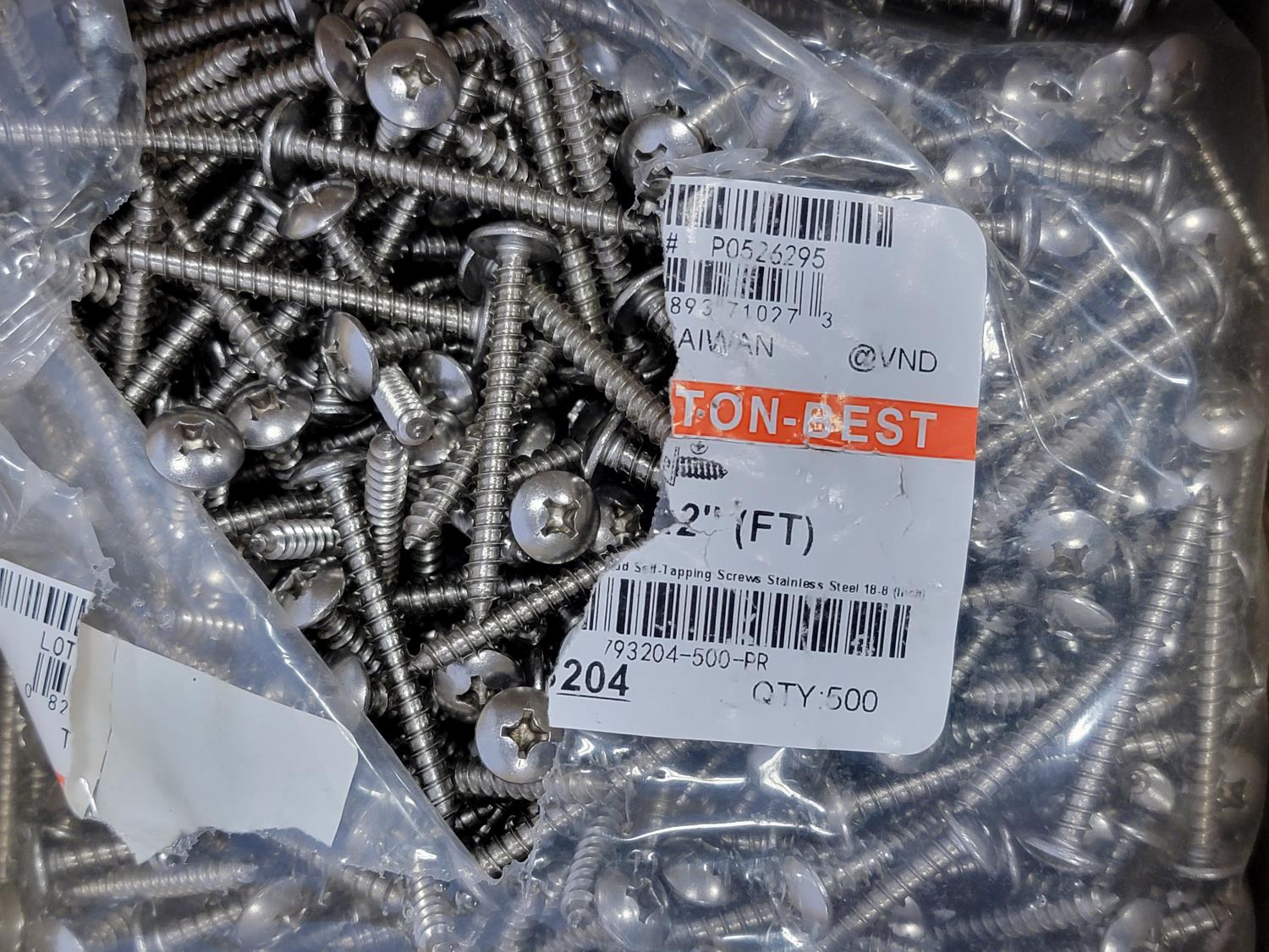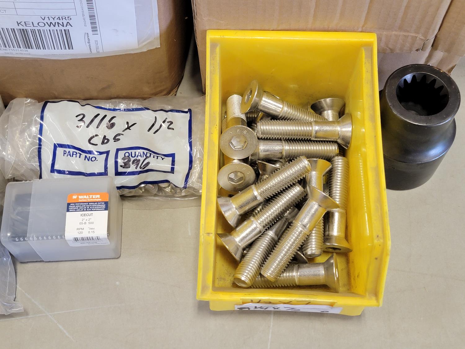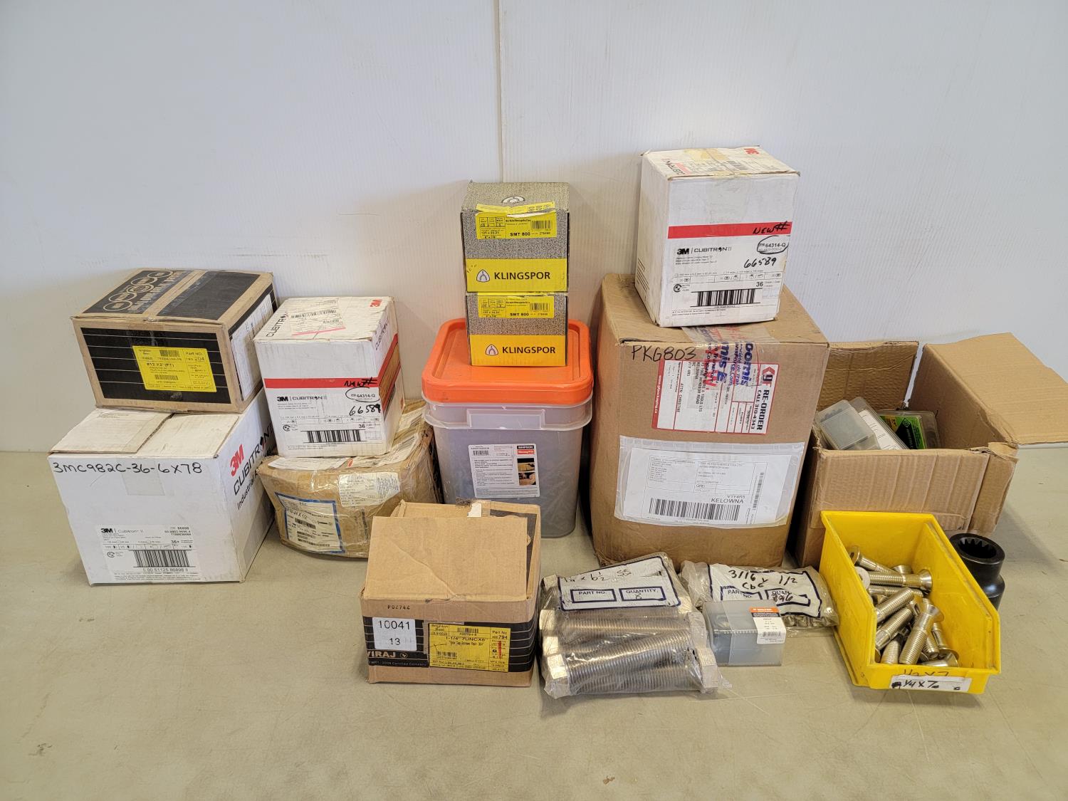 Fibre discs, #12 x 2 inch Phillips truss head tapping screws, 6 inch grinding wheels, 5 inch abrasive mop discs, 3/4 inch tipped cutter, carbides 2 inch ice cut bit, 3/4 inch x 3-1/4 inch flat head bolts, 1-1/4 inch x 6-1/2 inch hex bolts, 1-1/4 inch x 6 inch hex bolt, round head square neck bolts #10-24 x 1/2 inch, hex washer head wood screws, 1-1/4 inch push on seals
