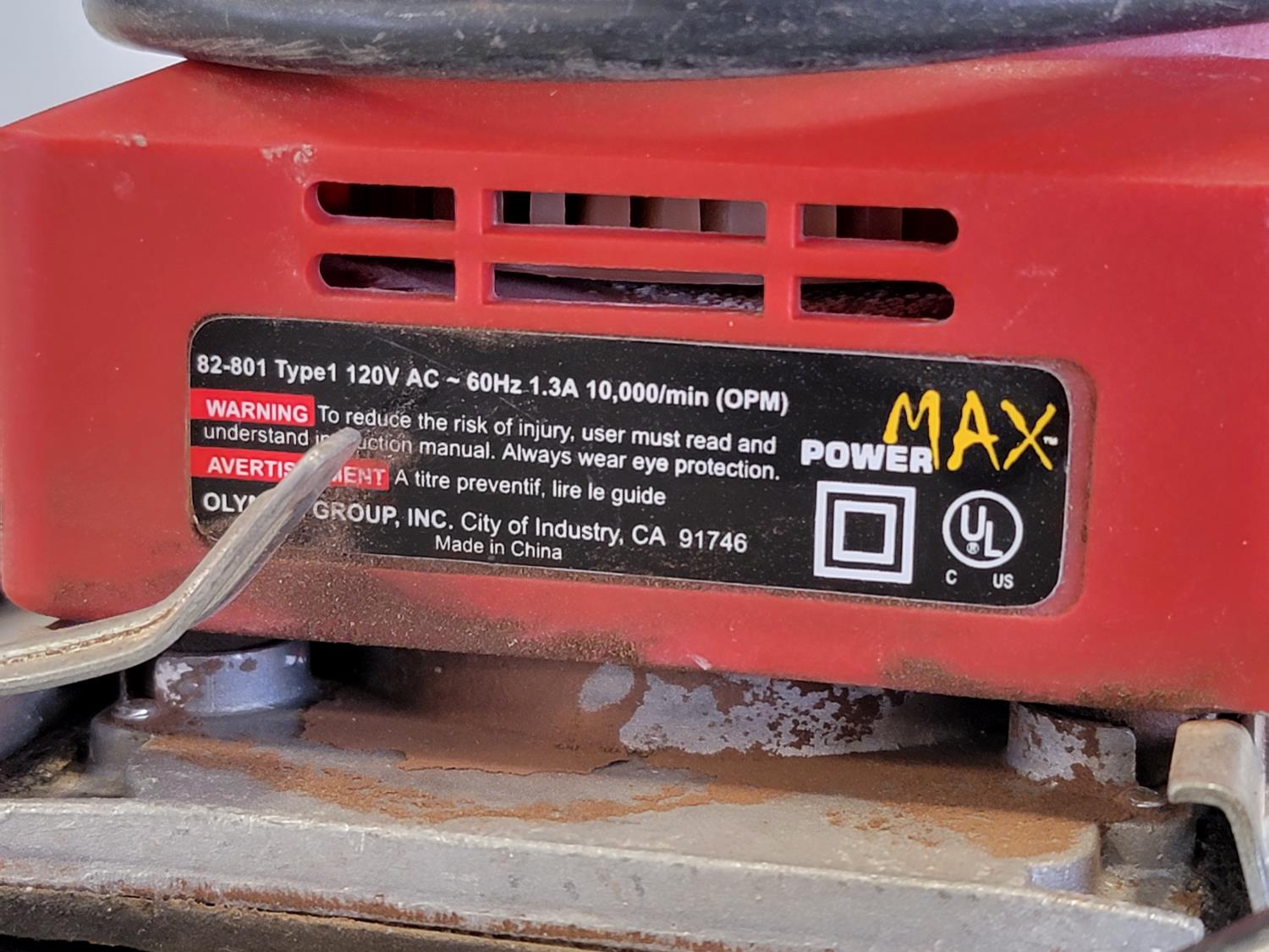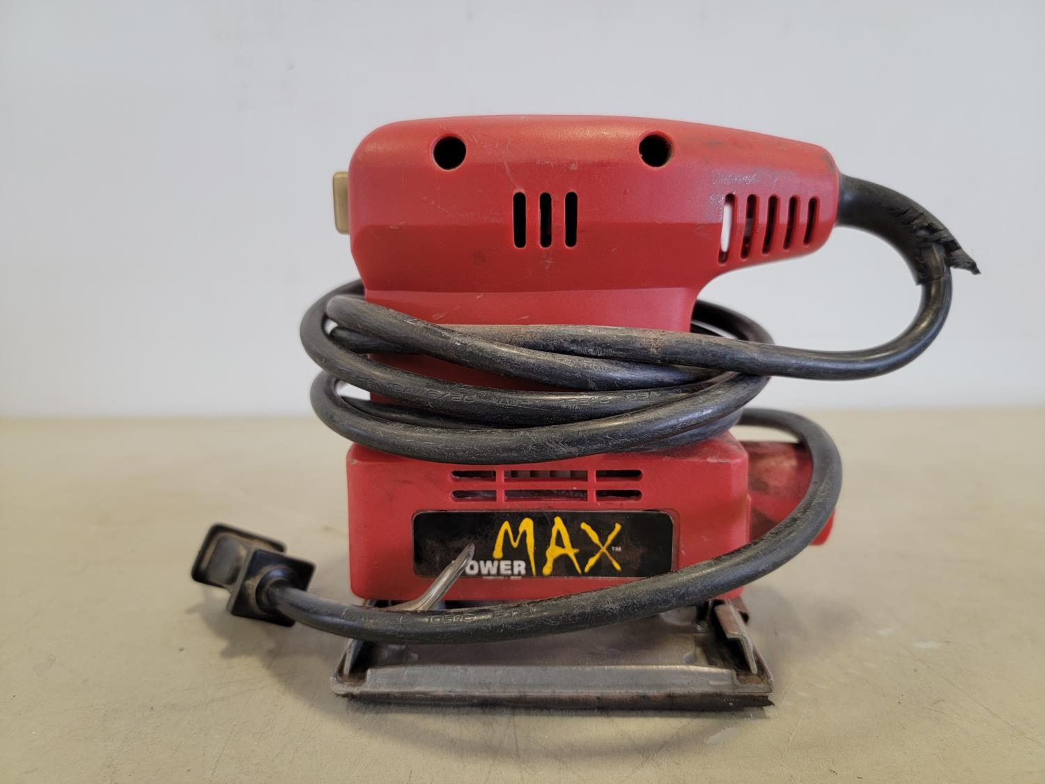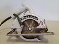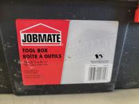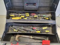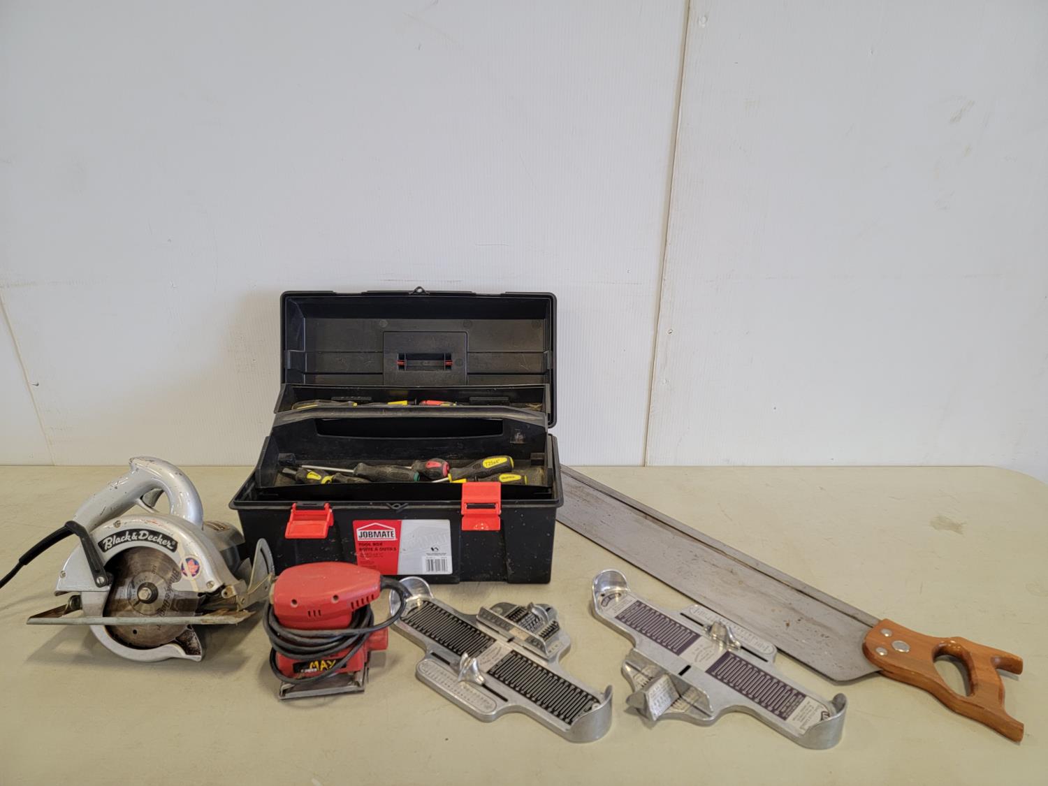 hammers, screwdrivers, 19 inch x 9-1/4 inch x 9-1/2 inch toolbox, black & decker 6-1/2 inch circular saw, power max palm sander, brannock shoe size measurers, hand saw