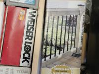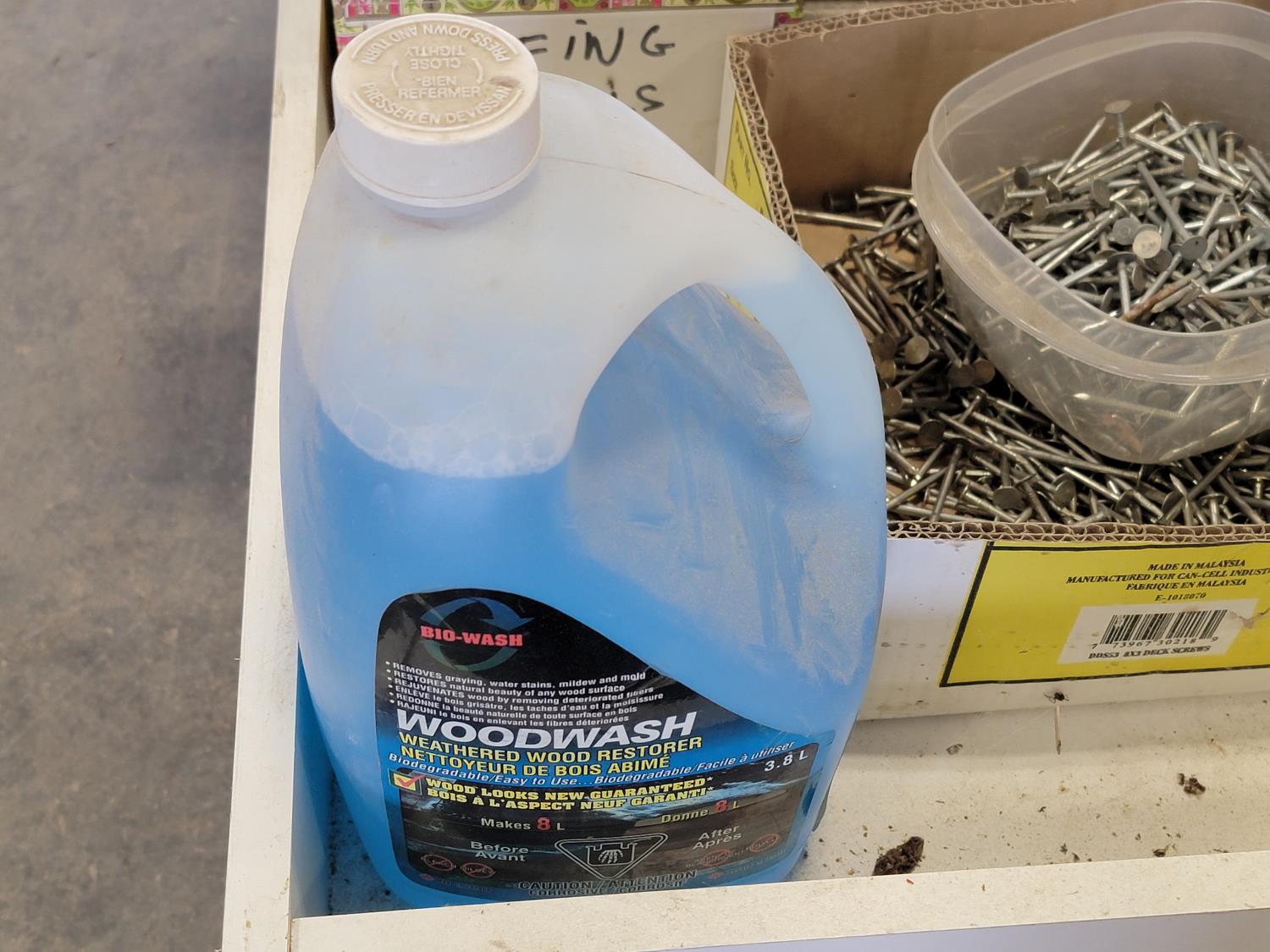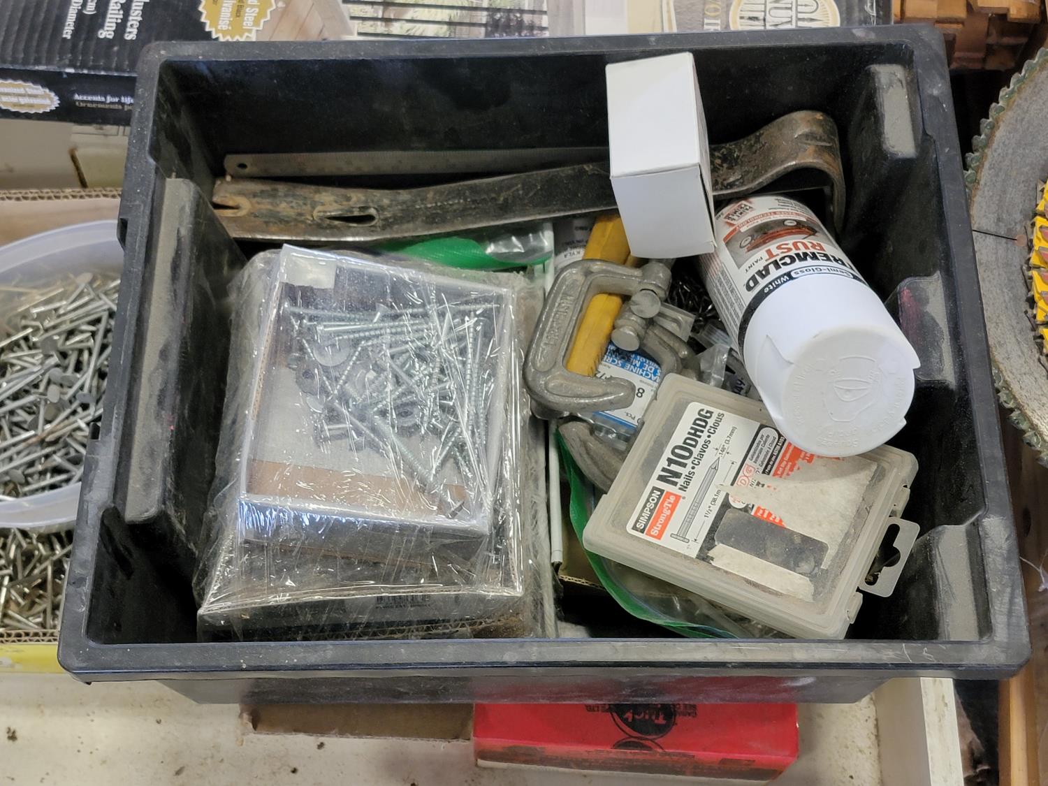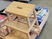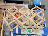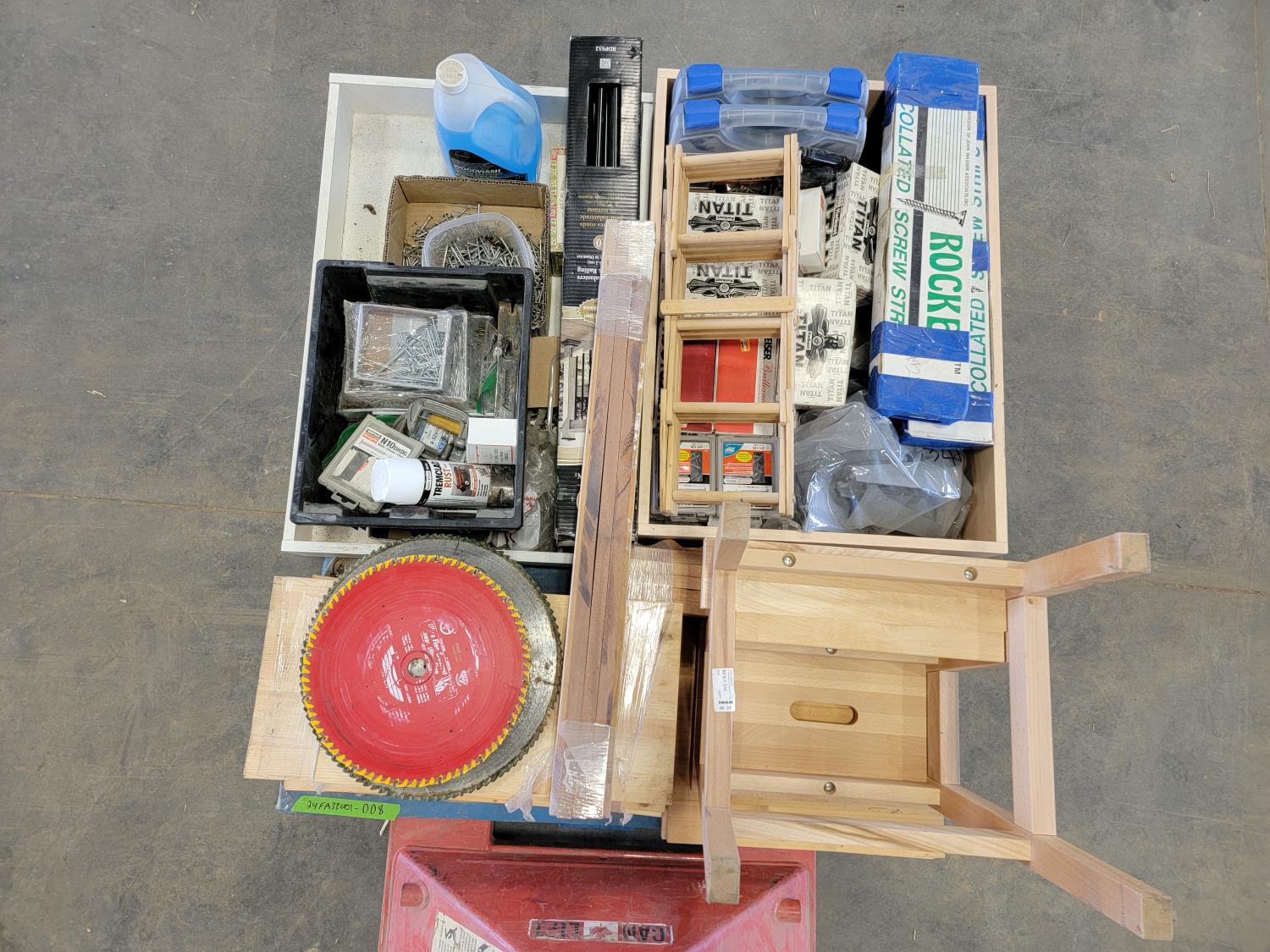 step stool, bottle holder, hardware, door knobs, hinges, deck railing, wood wash, 12 inch cutting discs, qty of hard wood