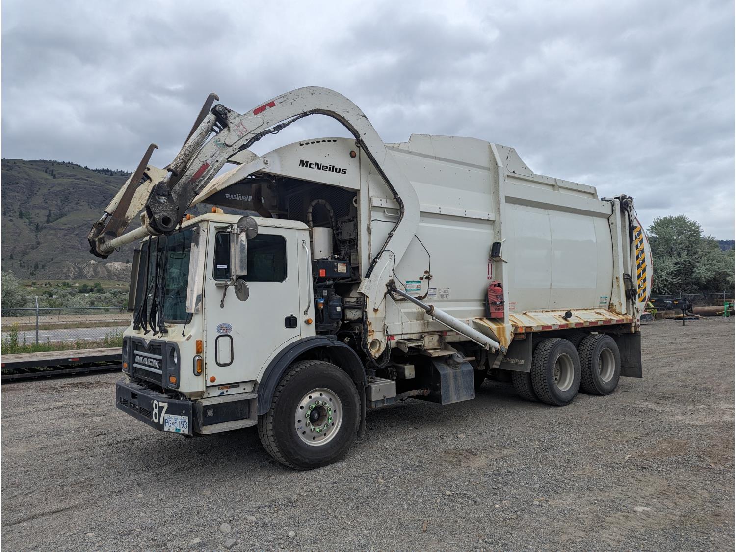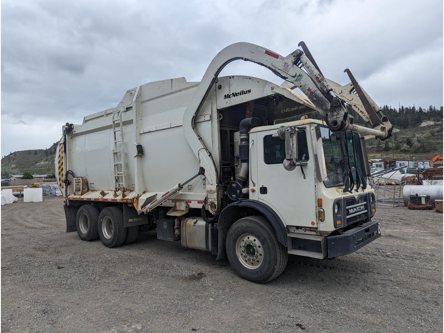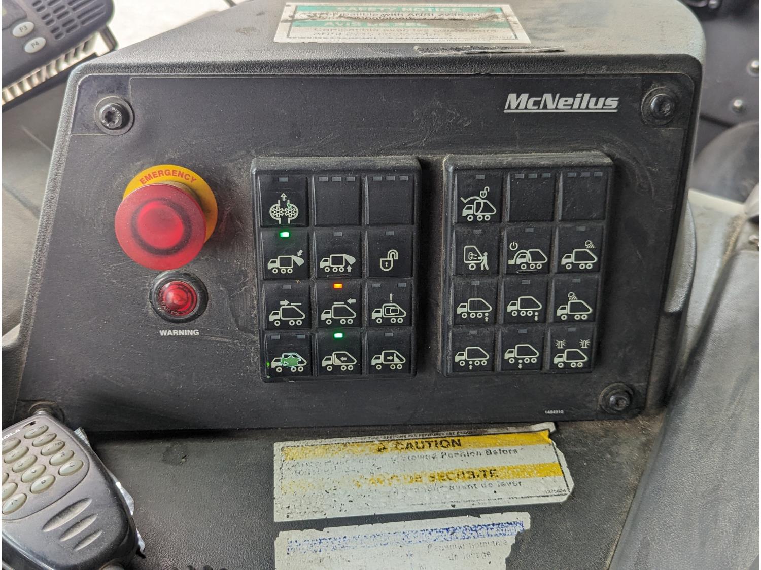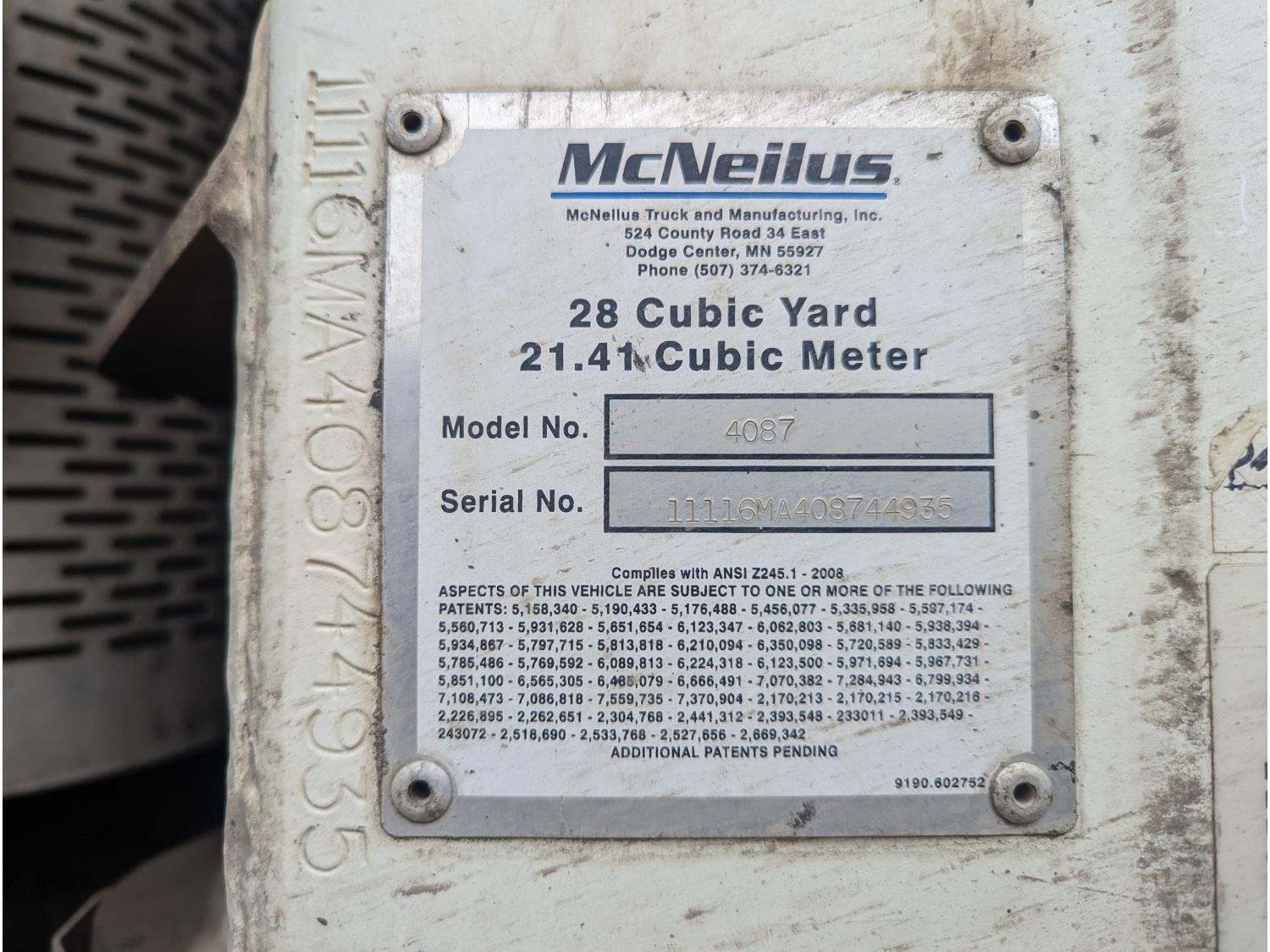Mack MP7 10.8 L 6 cylinder 335 HP diesel engine, DEF required, engine block heater, automatic transmission, A/C, cruise control, radio, CB radio, McNeilus front load, 4087, 21.41 Cubic Meter , spring suspension, 20,000 lb front axle, 46,000 lb rear axles, diff lock, 240 inch WB, all aluminum wheels, 425/65R22.5 front tires, 315/80R22.5 rear tires