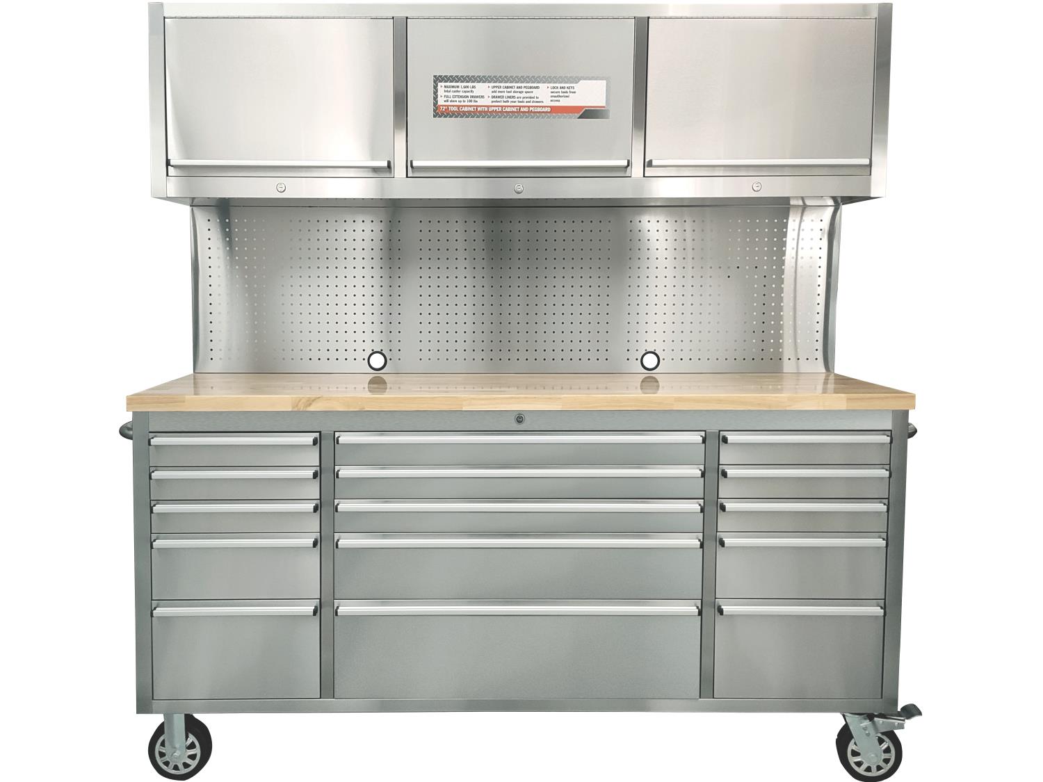 15 Lockable drawers, wall-mounted cabinets, pegboard, adjustable shelving