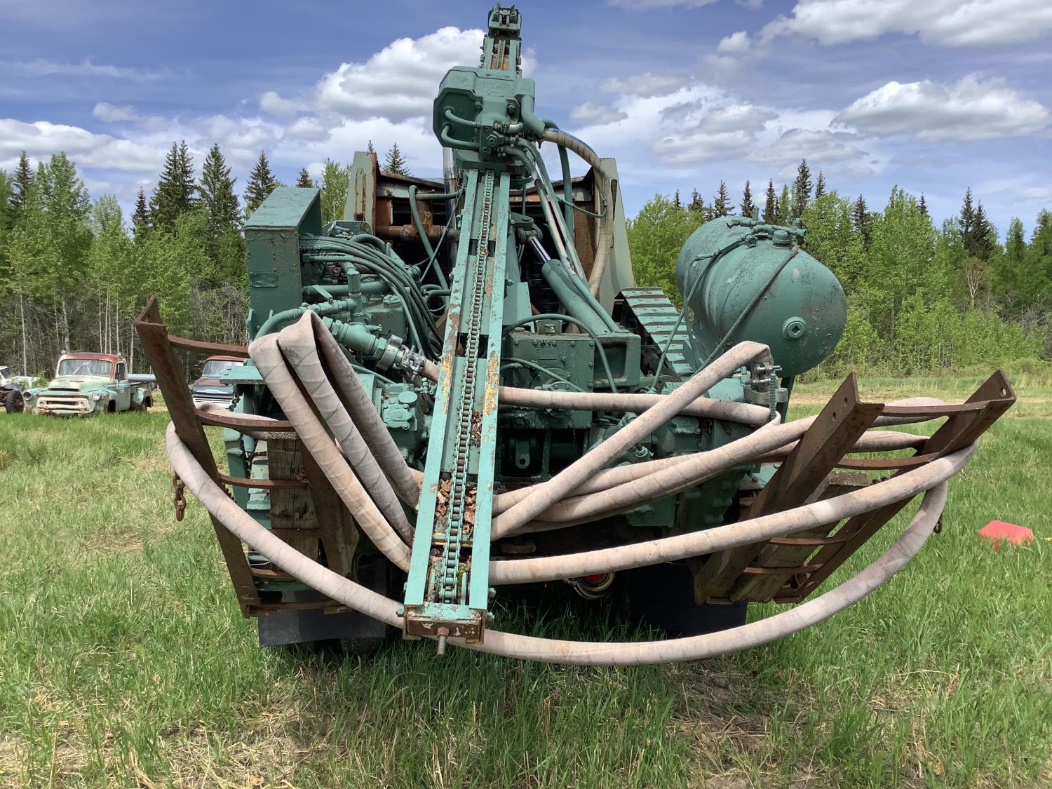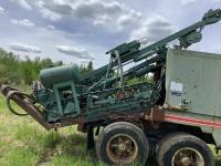 Cummins 335 HP engine, engine brake, engine block heater, 5X4 20 speed manual transmission, Mounted on the rear a Gardner Denver 800 CFM air compressor powered by a Caterpillar 3306B engine to operate the portable tracked Gardener Denver AT-3100 rock drill c/w approximately 12 drilling rods, compressor shows 7009 hours. All sells as one unit, rubber block suspension, 11R24.5 tires