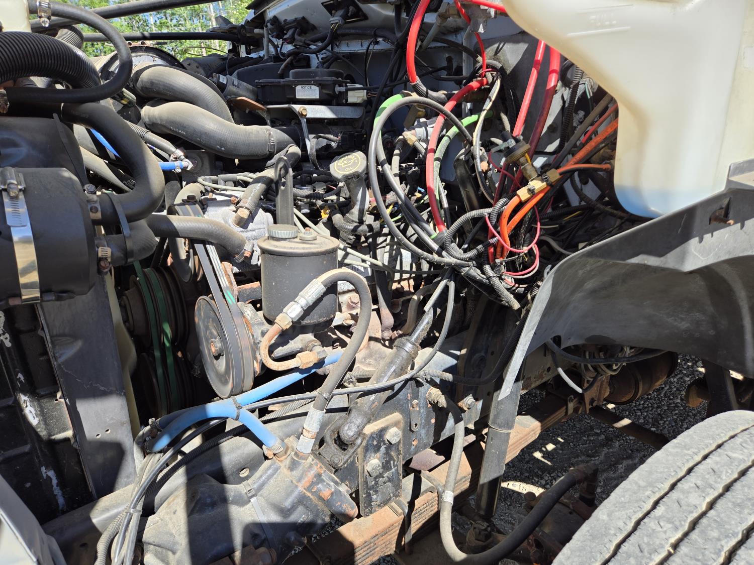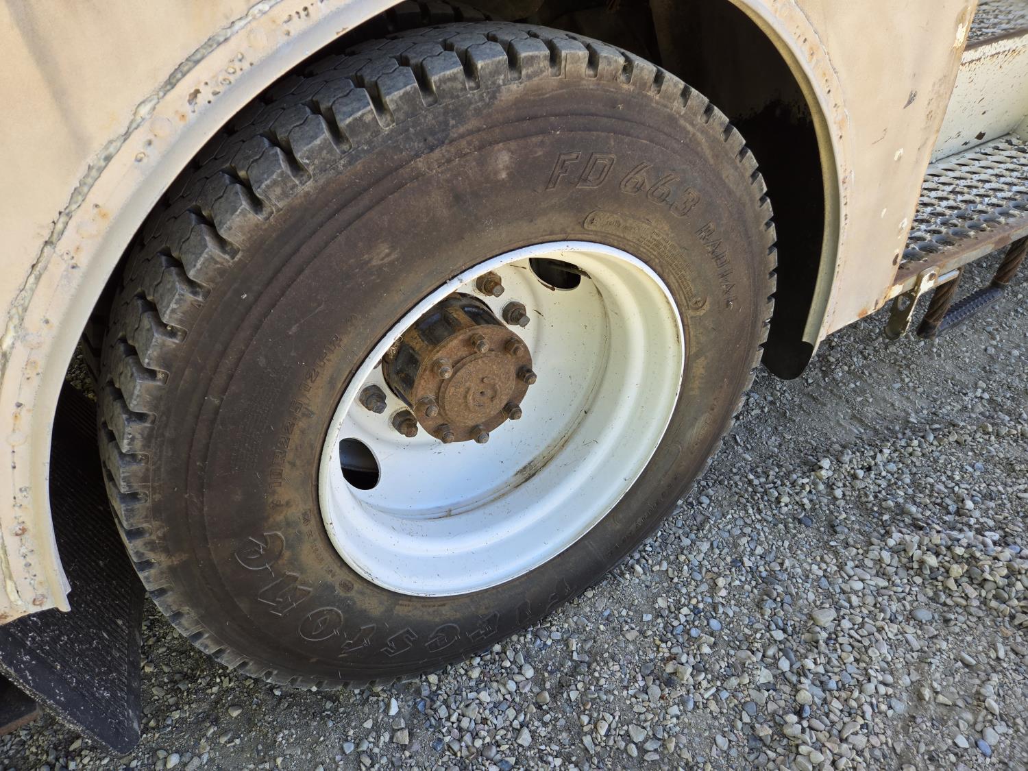 Ford 7 L V8 gas engine, automatic transmission, beacons, TS362 dual bucket boom, service body, railroad track undercarriage, pintle hitch, 3000 watt power invertor, air ride suspension, 10.00R22.5 tires