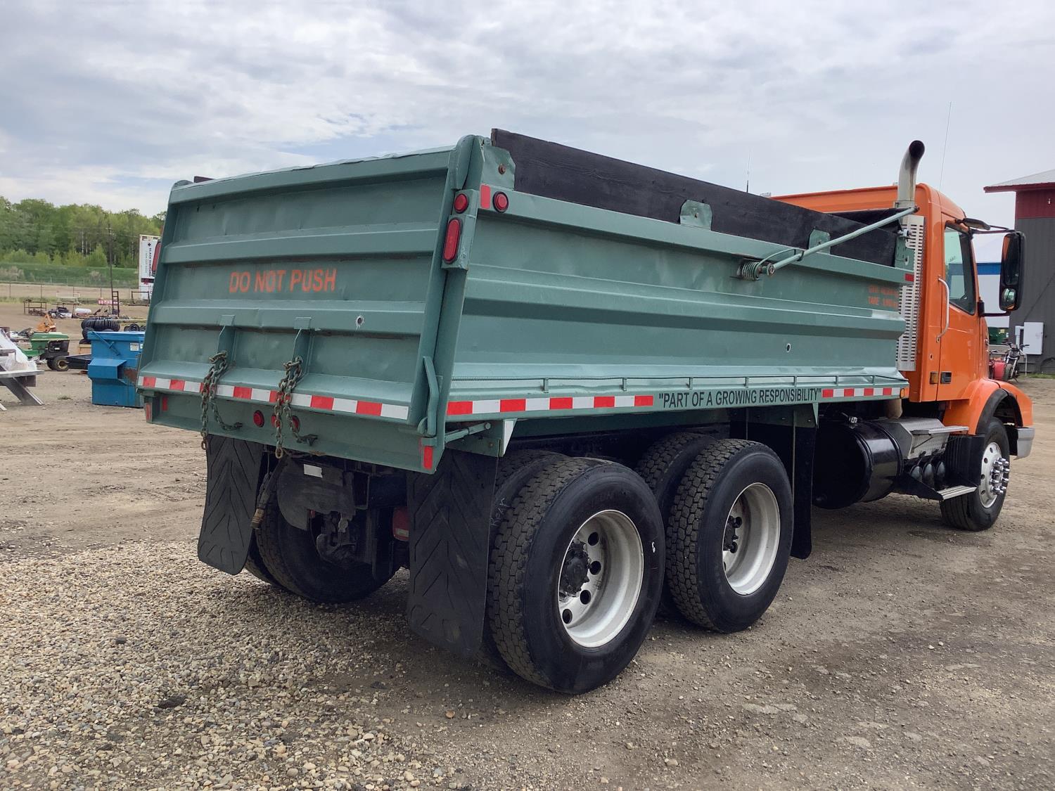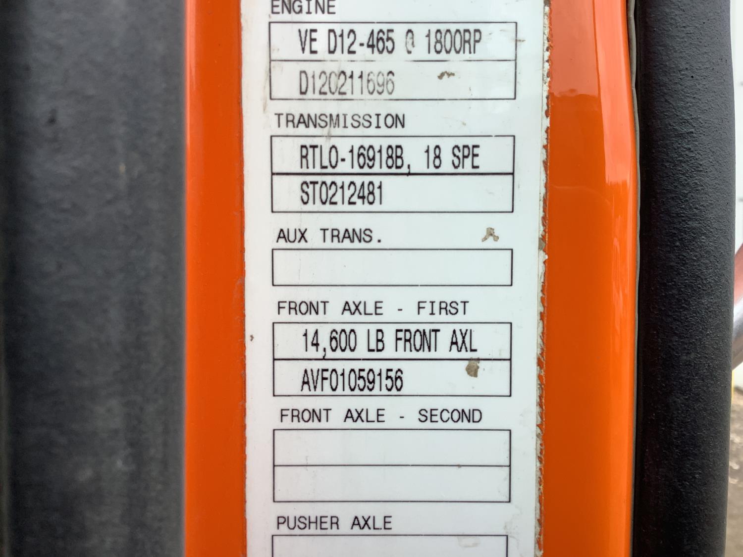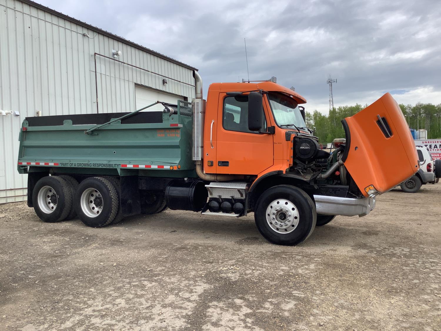 Volvo D12 6 cylinder 465 HP engine, engine brake, 18 speed manual transmission, air ride cab, 15 Ft steel box, tarp, rear pintle hitch with trailer air plumbing and hydraulic line, spring suspension, 14,600 lb front axle, 40,000 lb rear axles, full lockers, 4.10 ratio, all aluminum wheels, 11R24.5 tires