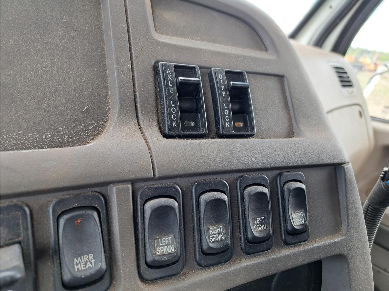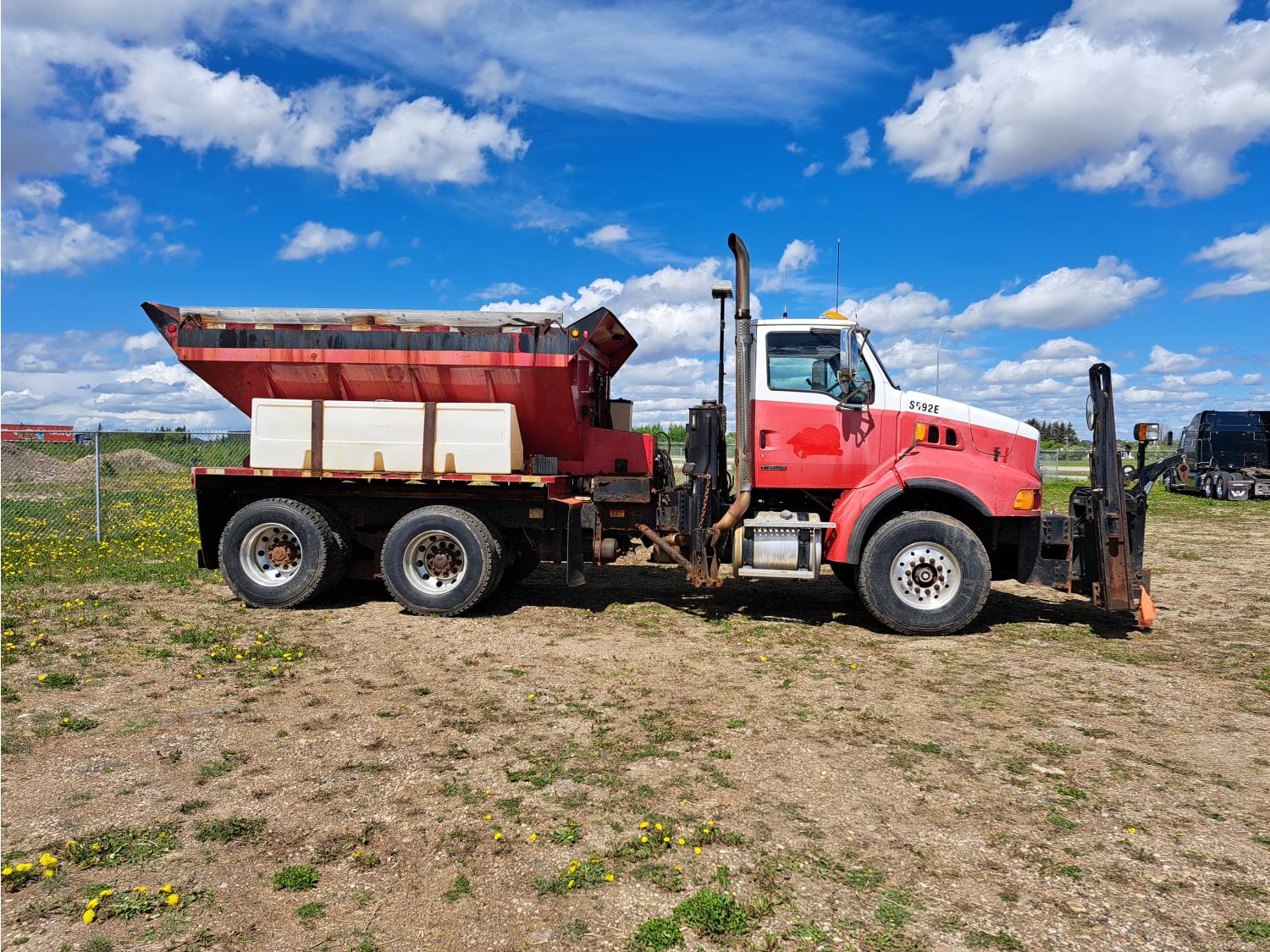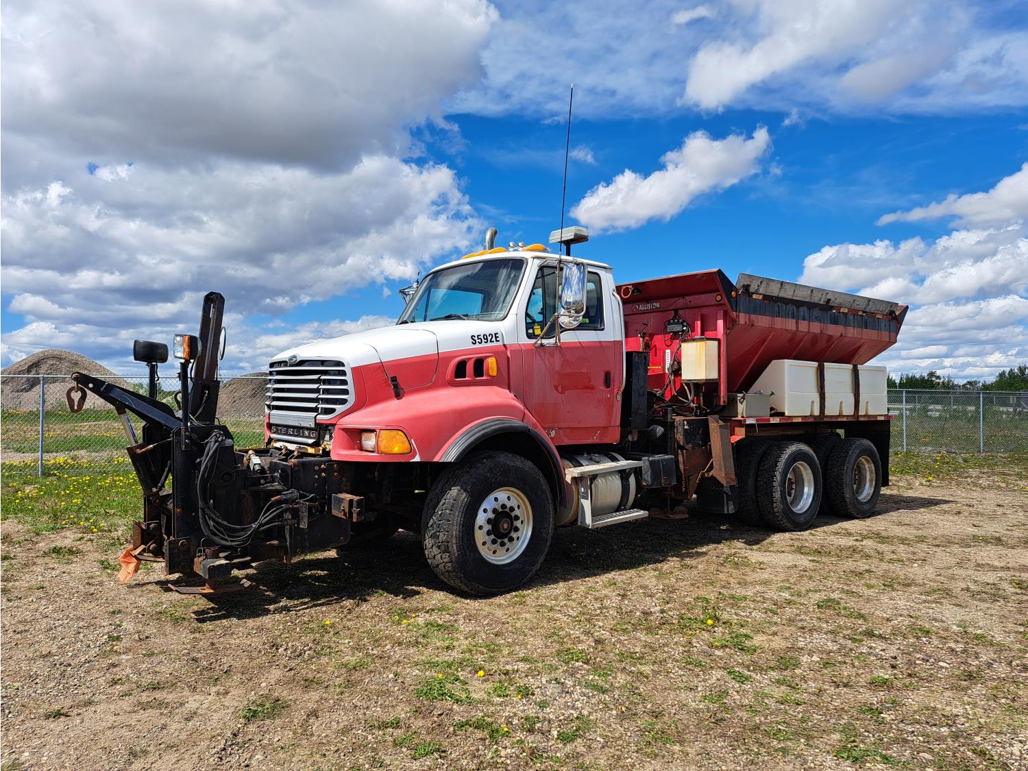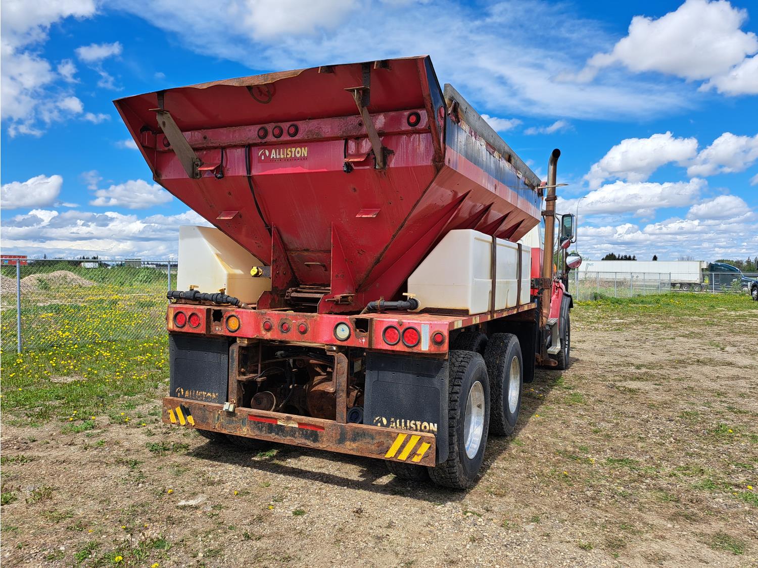 Cummins ISC300 8.3 L 6 cylinder 300 HP diesel engine, engine brake, Eaton Fuller RT8908LL 18 speed manual transmission, A/C, cruise control, air ride driver seat, hydraulic wet kit, beacons, Alliston 12ft x 8ft sloped bottom sand box, side mount sand spreader, poly side tanks with pump, spring suspension, 22,000 lb front axle, 40,000 lb rear axles, 3 way diff locks, 202 inch WB, all aluminum wheels, 425/65R22.5 front tires, 11R22.5 rear tires