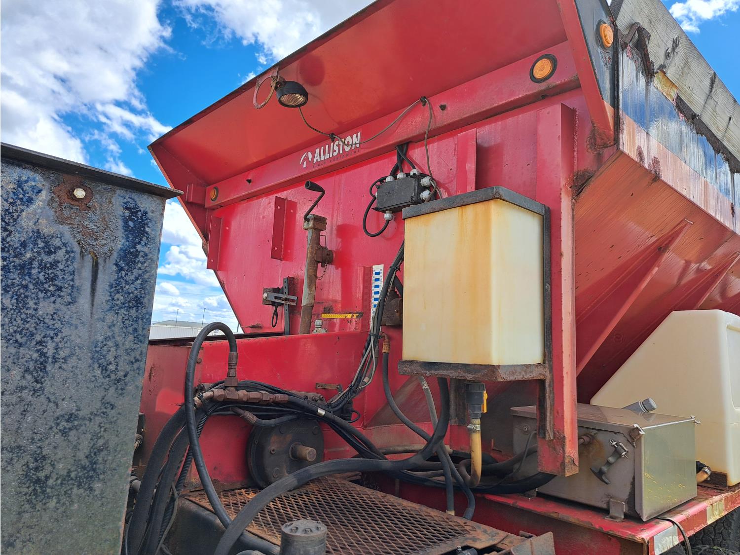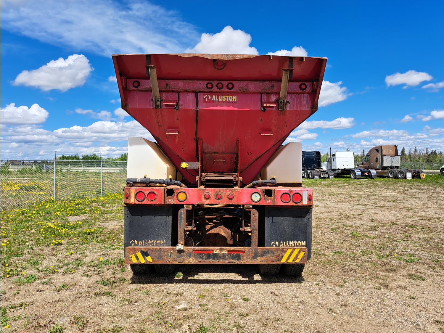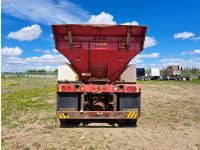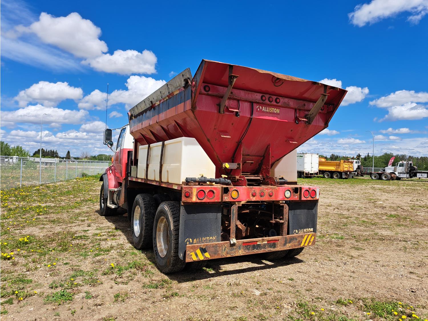 Cummins ISC300 8.3 L 6 cylinder 300 HP diesel engine, engine brake, Eaton Fuller RT8908LL 18 speed manual transmission, A/C, cruise control, air ride driver seat, hydraulic wet kit, beacons, Alliston 12ft x 8ft sloped bottom sand box, side mount sand spreader, poly side tanks with pump, spring suspension, 22,000 lb front axle, 40,000 lb rear axles, 3 way diff locks, 202 inch WB, all aluminum wheels, 425/65R22.5 front tires, 11R22.5 rear tires