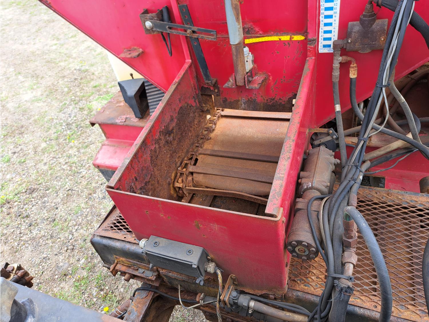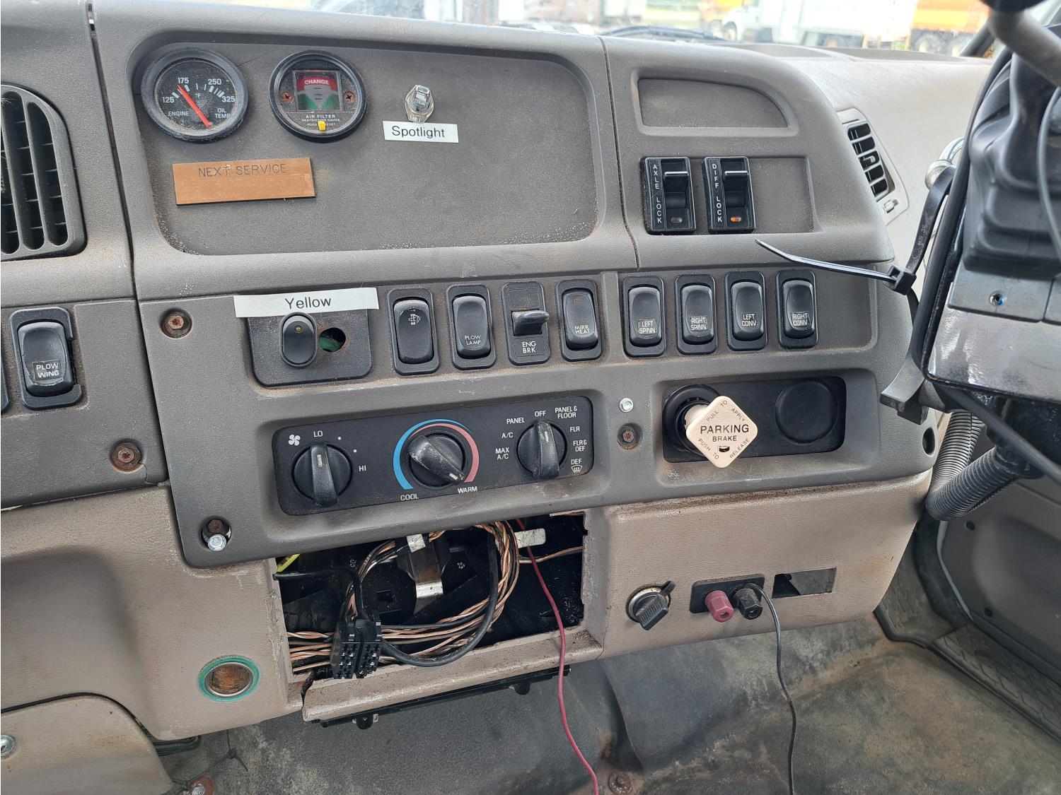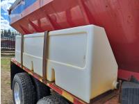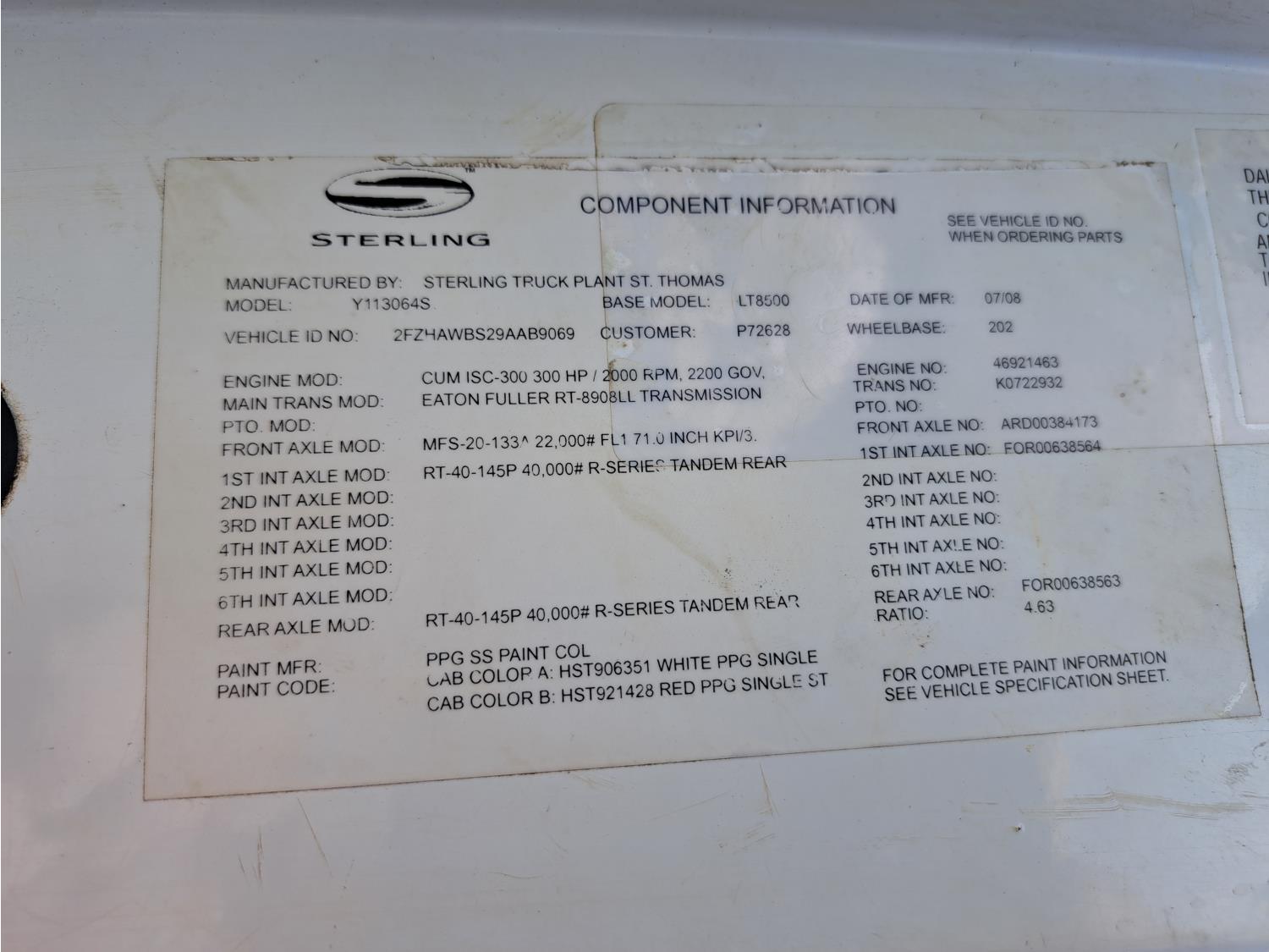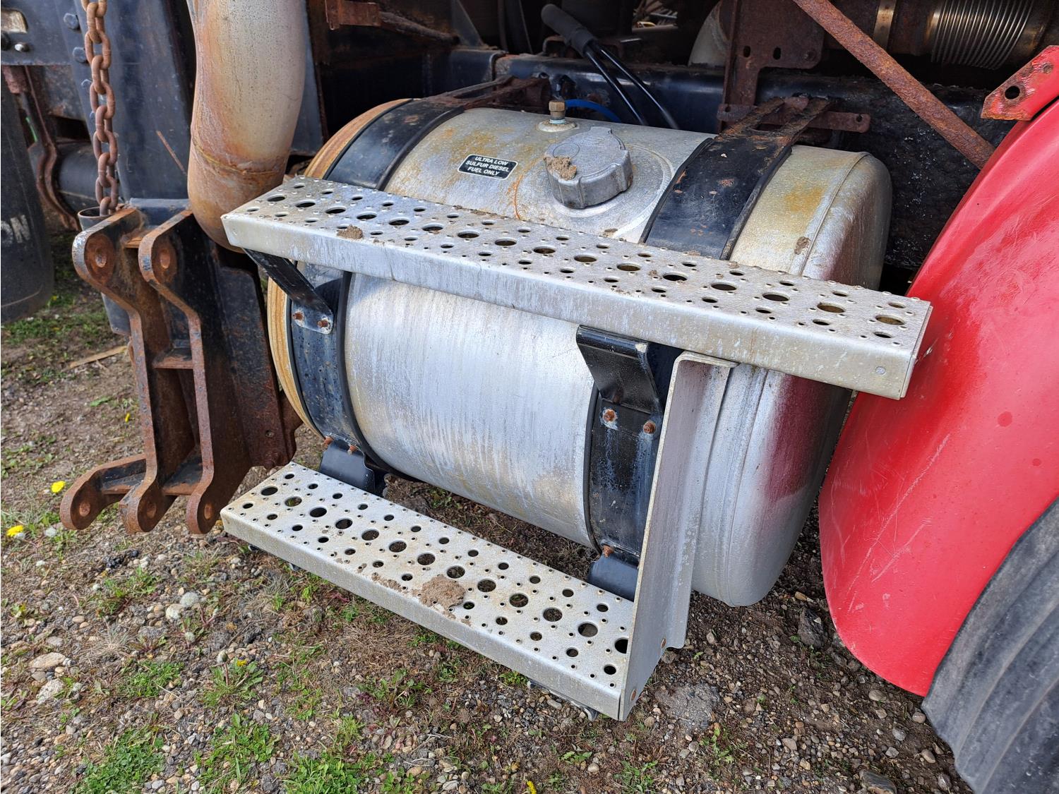 Cummins ISC300 8.3 L 6 cylinder 300 HP diesel engine, engine brake, Eaton Fuller RT8908LL 18 speed manual transmission, A/C, cruise control, air ride driver seat, hydraulic wet kit, beacons, Alliston 12ft x 8ft sloped bottom sand box, side mount sand spreader, poly side tanks with pump, spring suspension, 22,000 lb front axle, 40,000 lb rear axles, 3 way diff locks, 202 inch WB, all aluminum wheels, 425/65R22.5 front tires, 11R22.5 rear tires