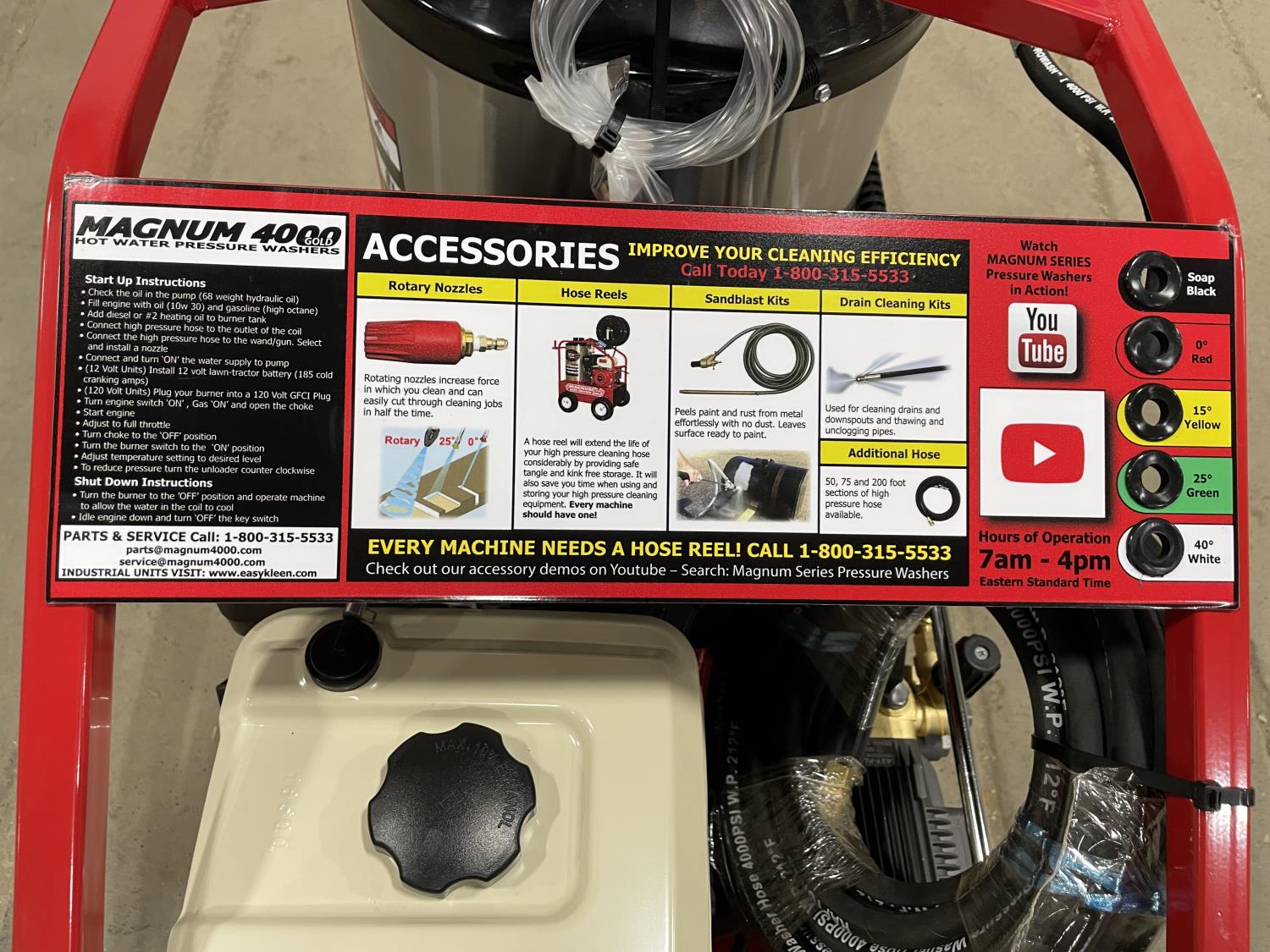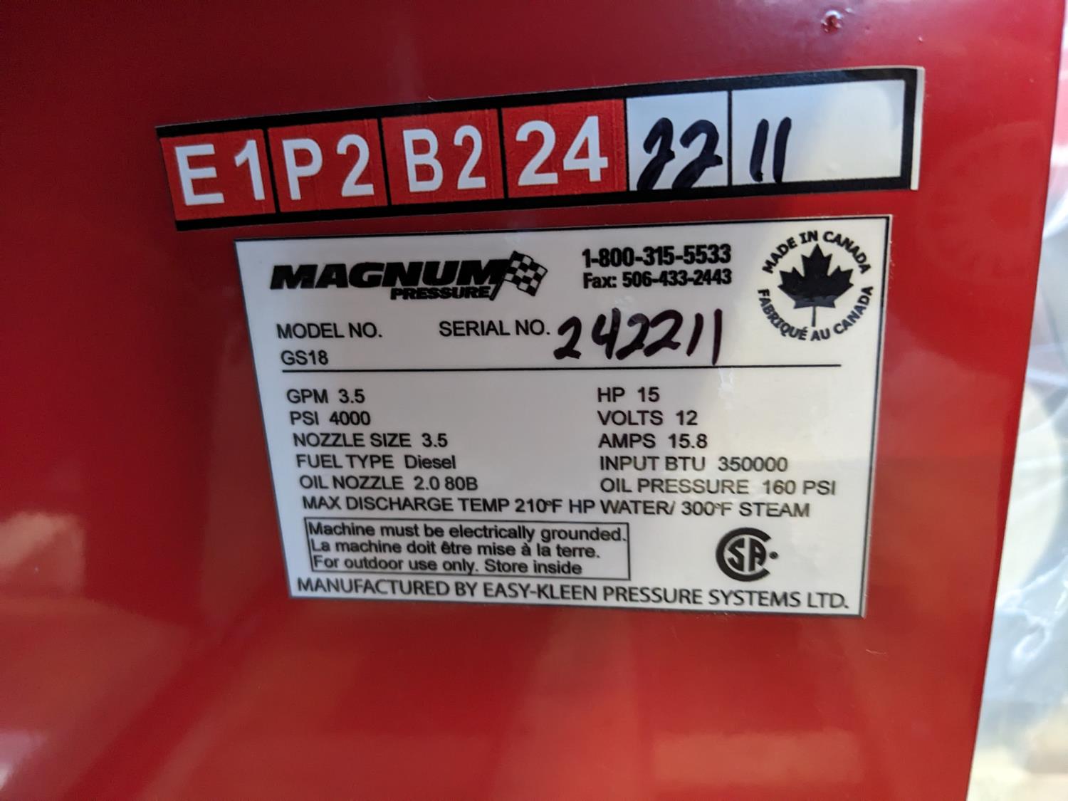 3.5 GPM at 4000 PSI, 15 HP, gasoline engine, electric start, 12 volt burner, oil/diesel fired burned/thermostat, schedule 80 coil with stainless steel housing, fully welded, powder coated frame, 10 gallon poly fuel tank