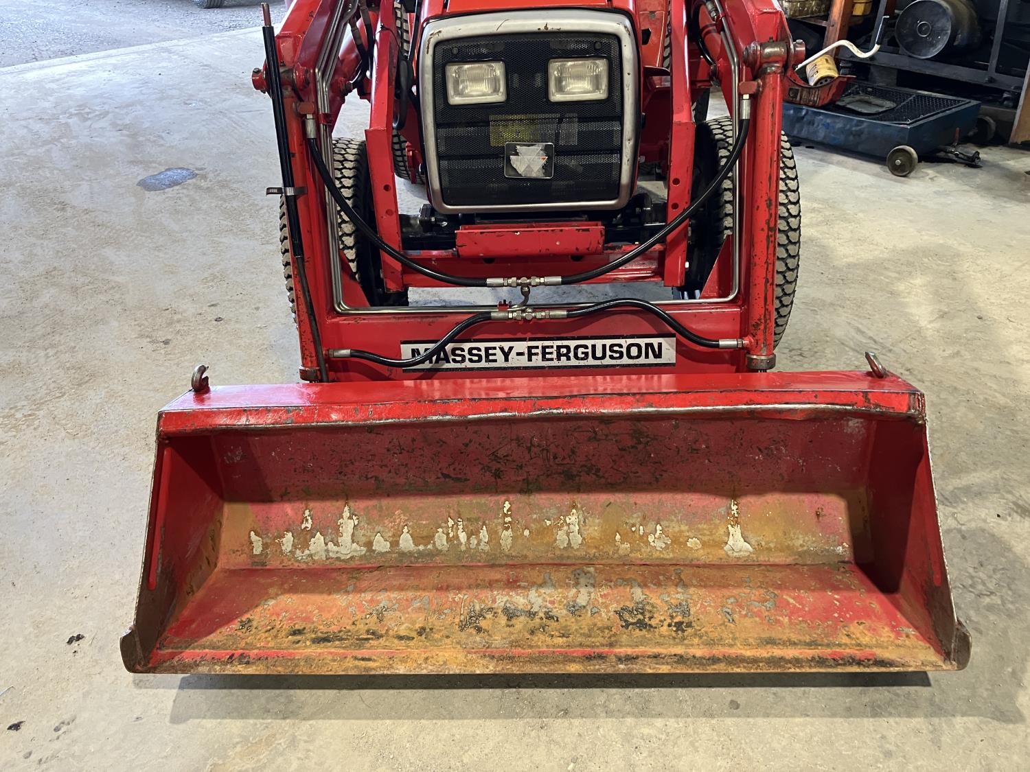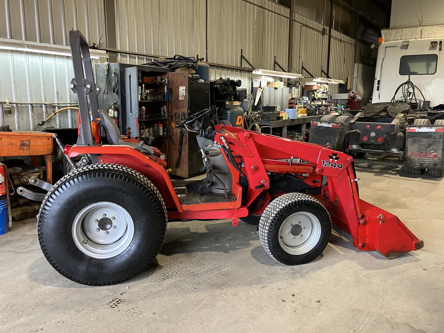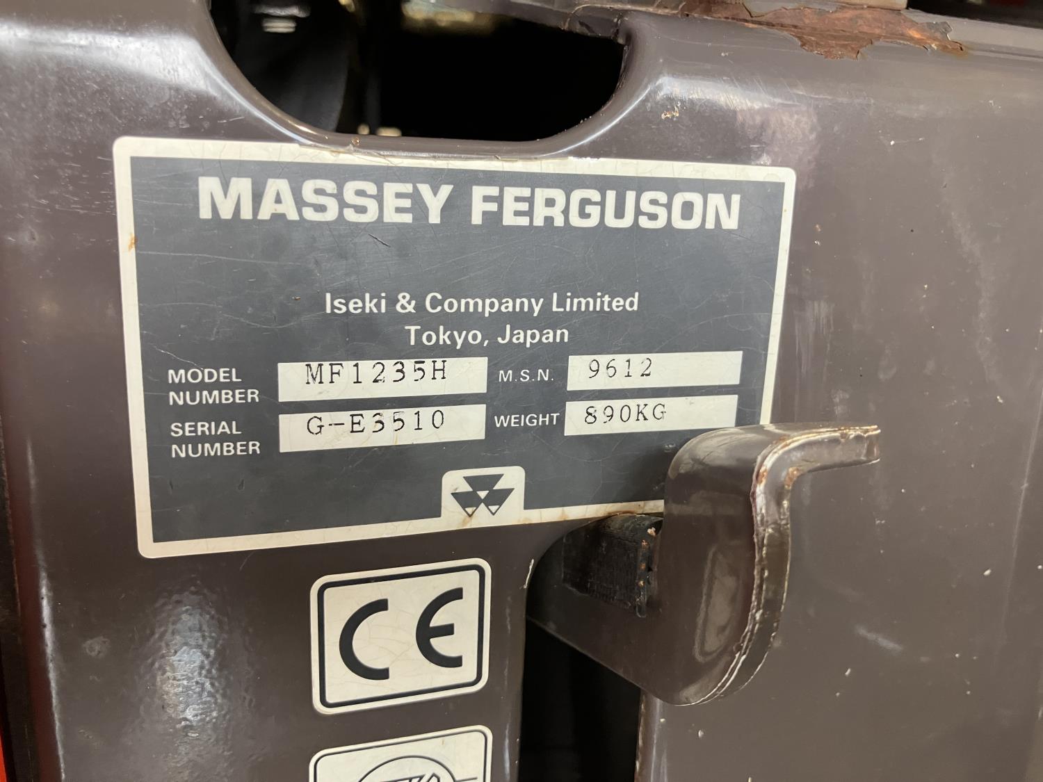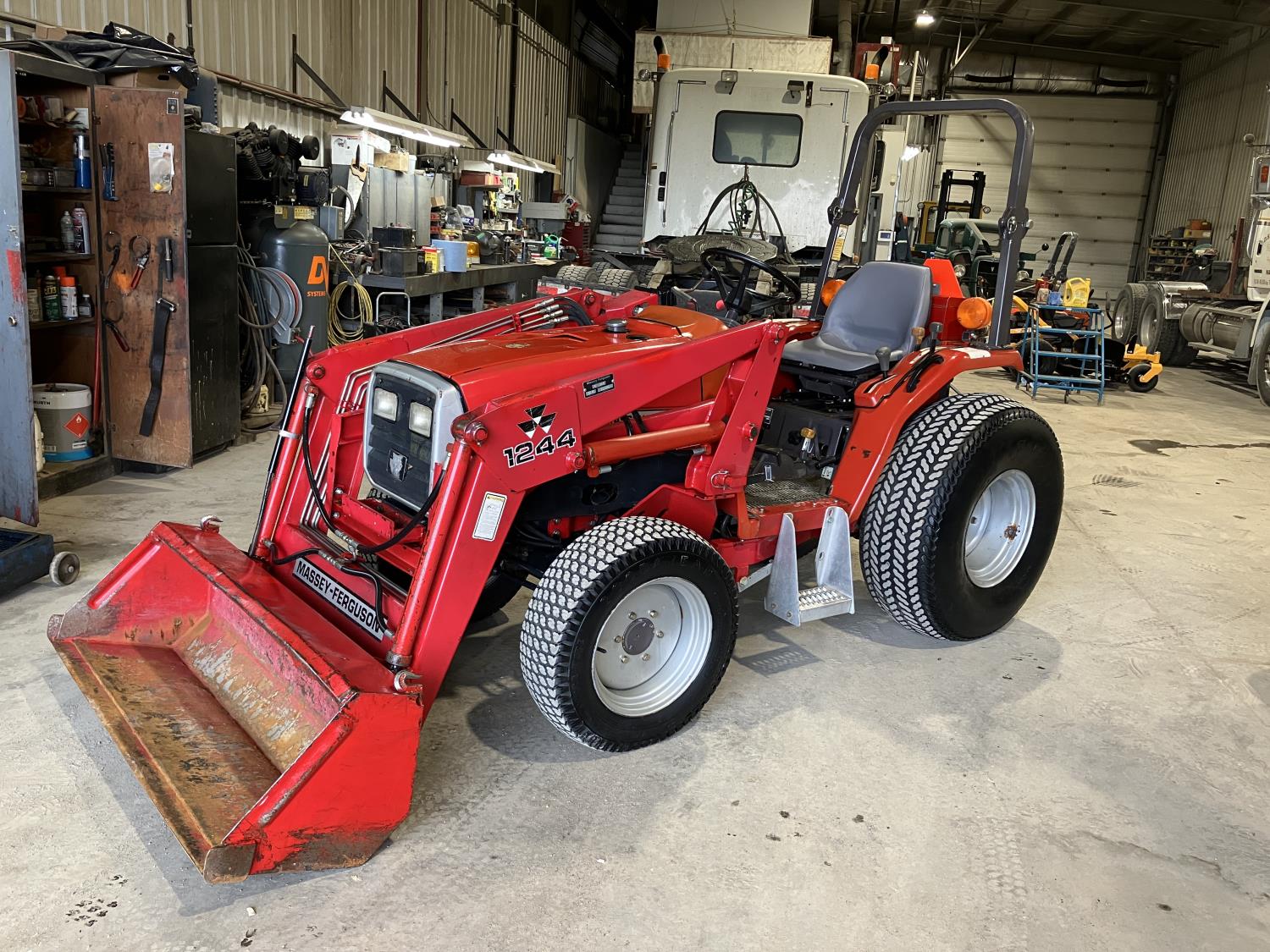 Massey Ferguson 1244 loader, 54 inch bucket, Iseki 1.5 L 3 cylinder 32 HP, diesel engine, 25.5 PTO HP, hydro 3 range transmission, open station platform, new seat cover, 540 PTO, 3 point hitch, 27X8.50-15 front tires, 13.6-16 rear tires