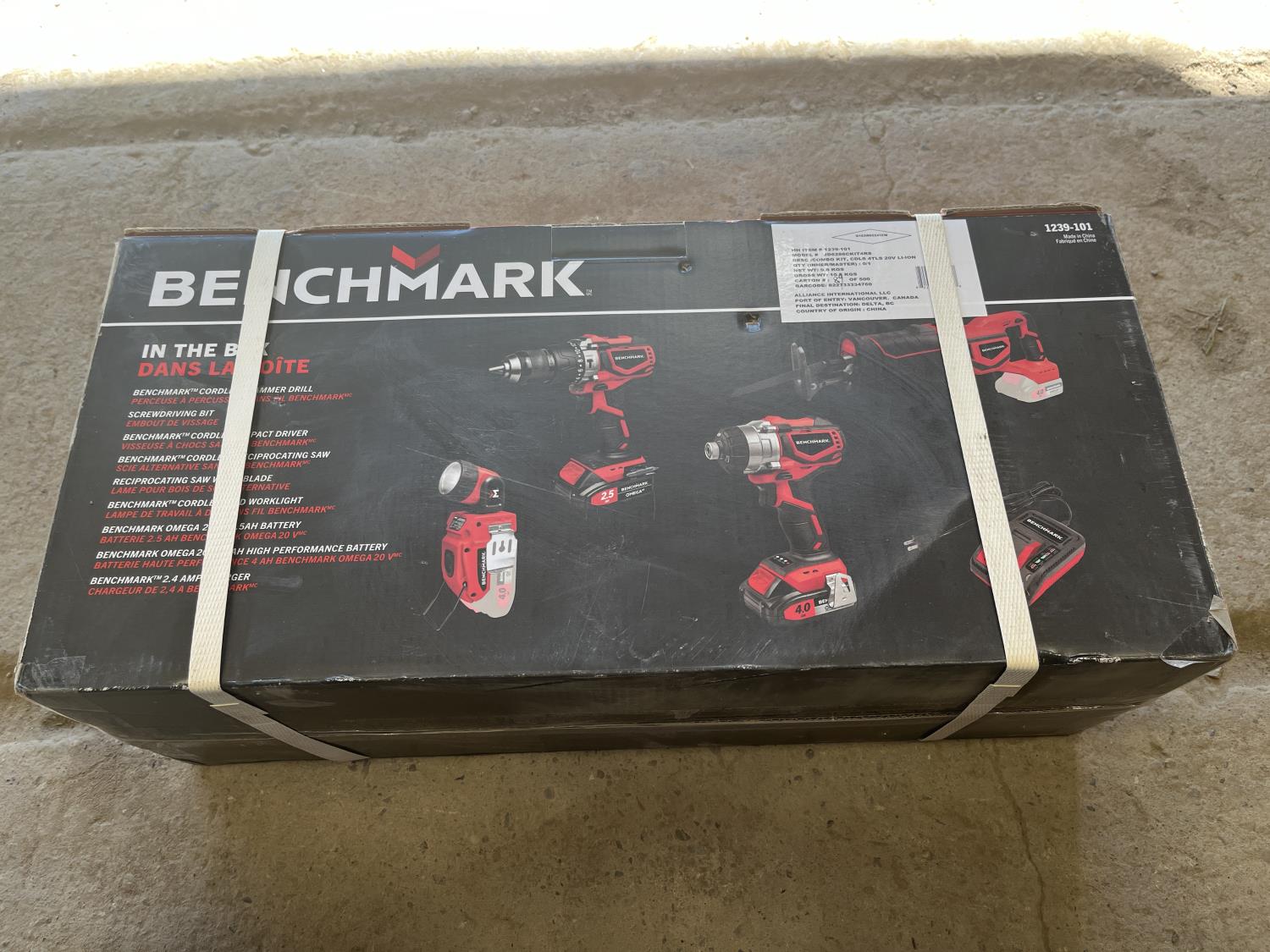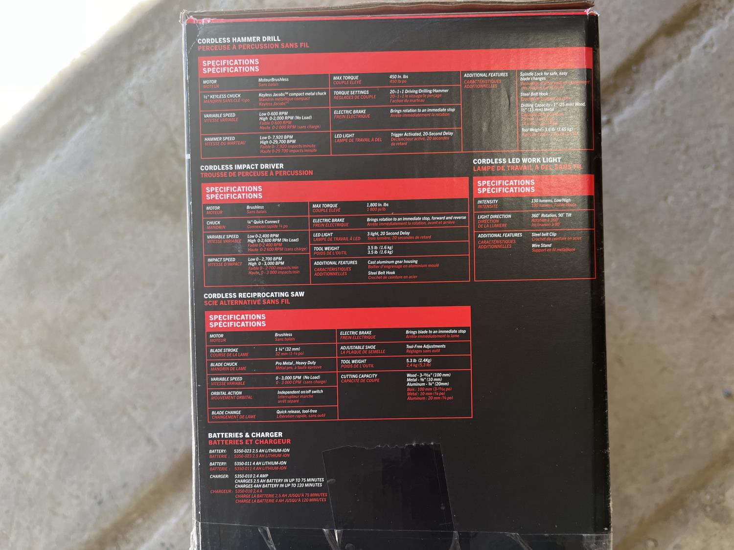 hammer drill, impact, reciprocating saw, work light, batteries and charger