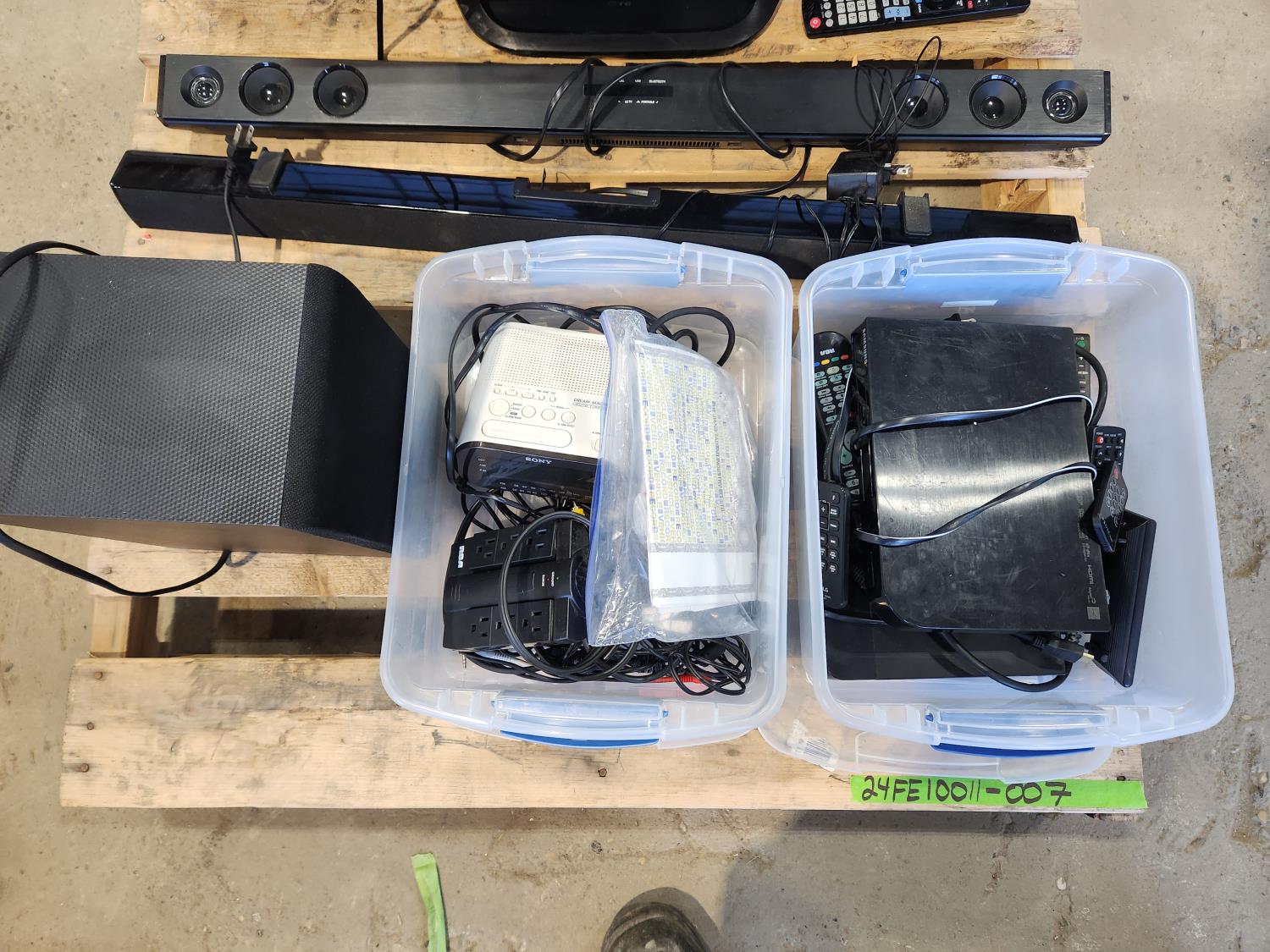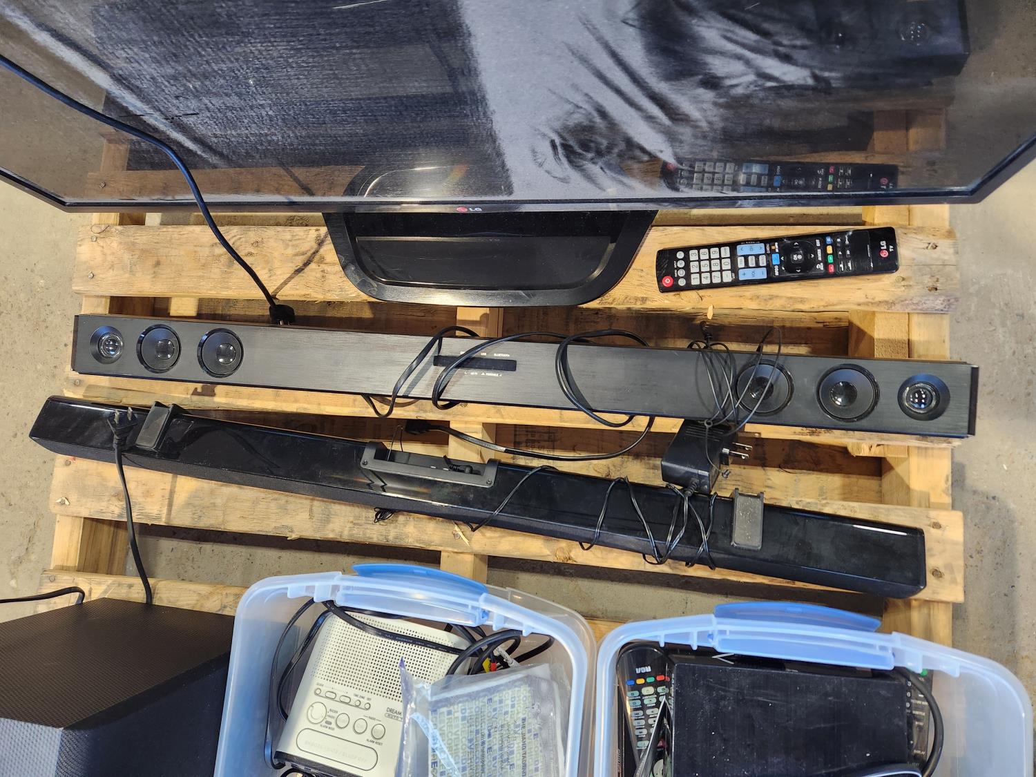 Lg sound bar with bass speaker, proscan sound bar, (2) DVD players, container of various electronics cords